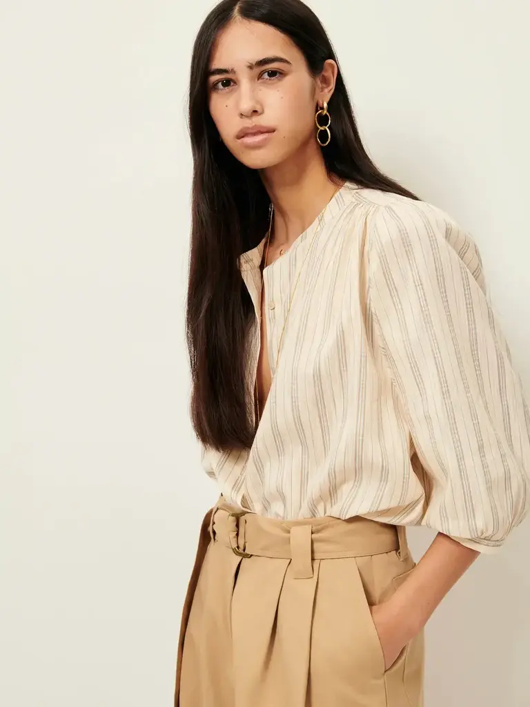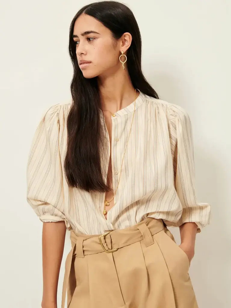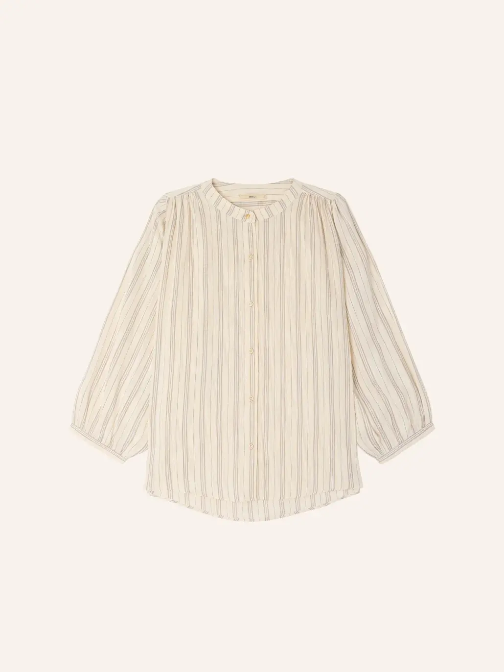 Gathered blouse with a round neckline and 3/4 balloon sleeves, made from viscose and cotton percale with dobby stripes, exclusive to Sessùn, woven in Italy.