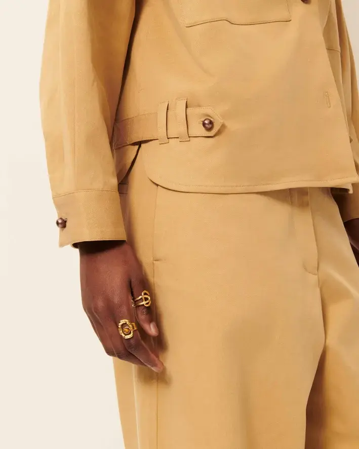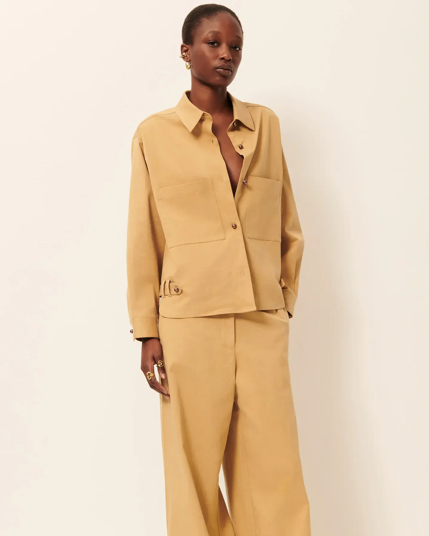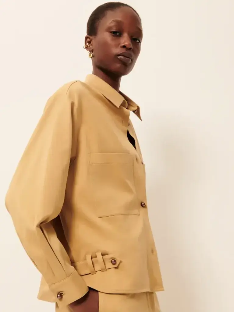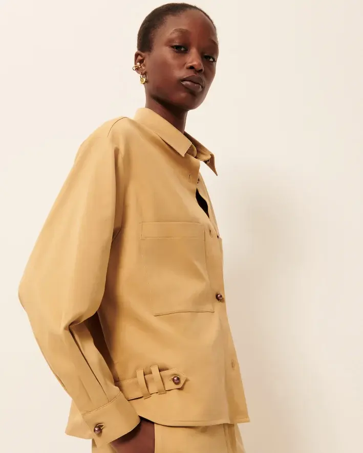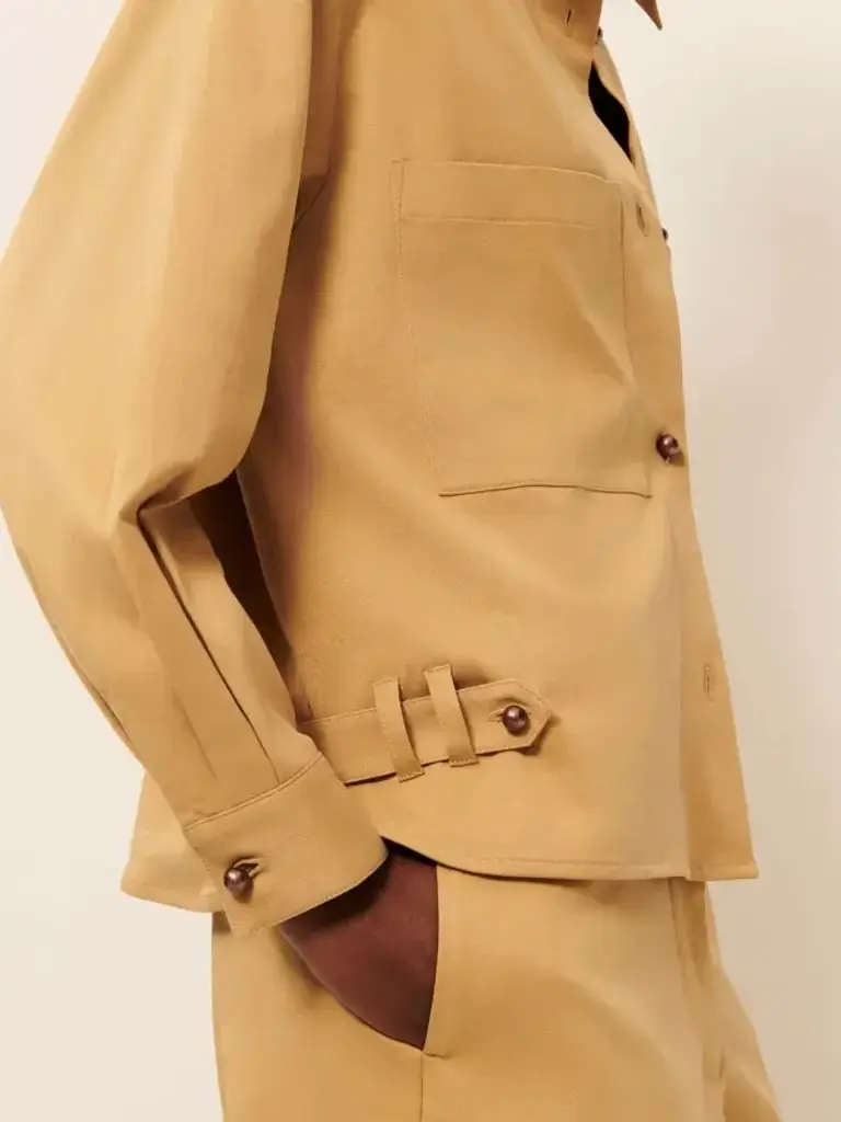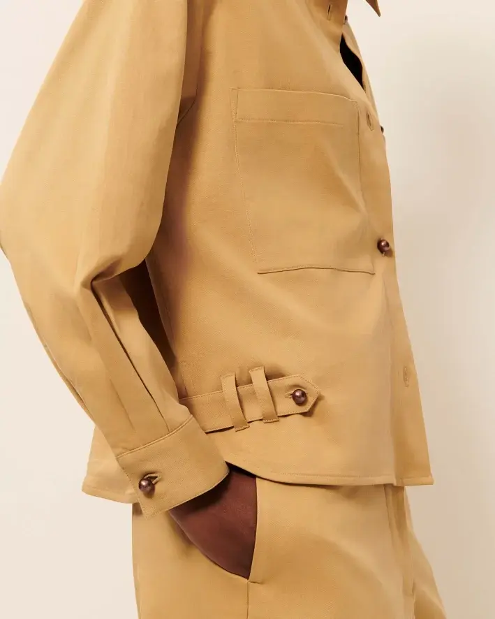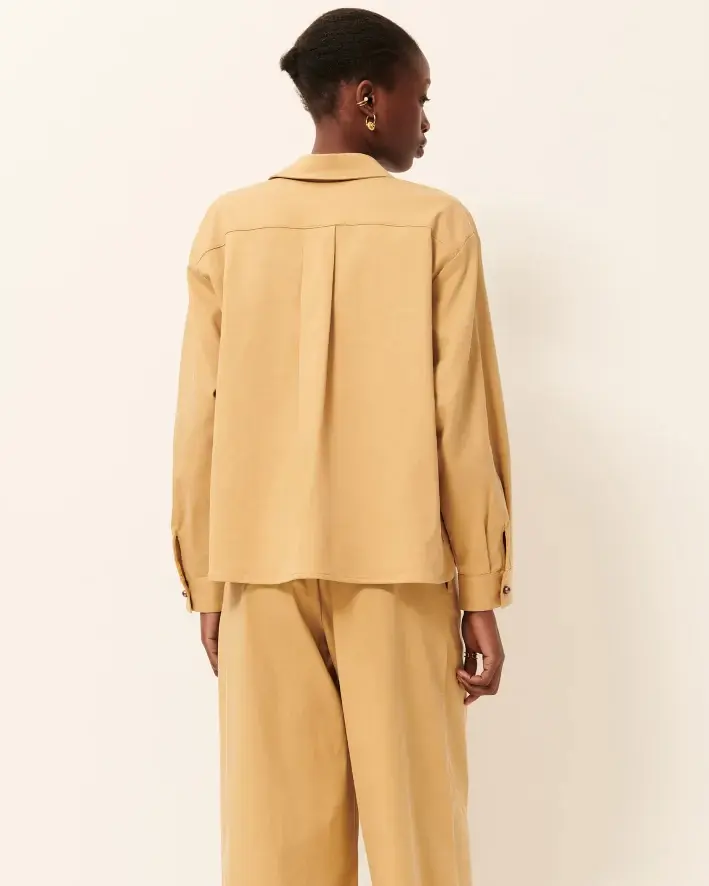 Jacket with patch pockets made from soft, lightweight Lyocell gabardine.