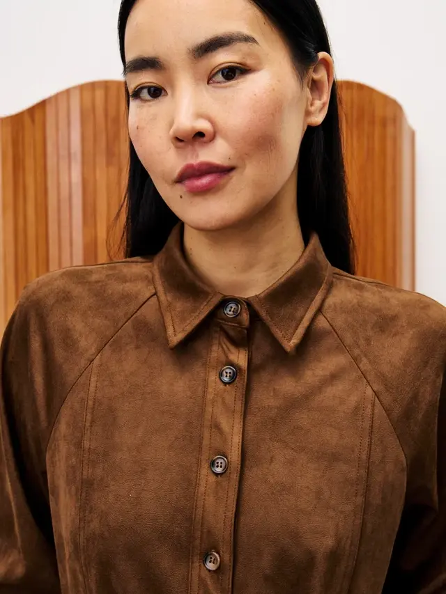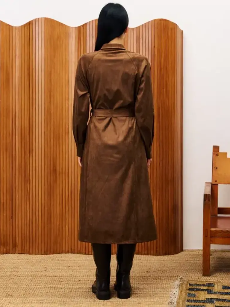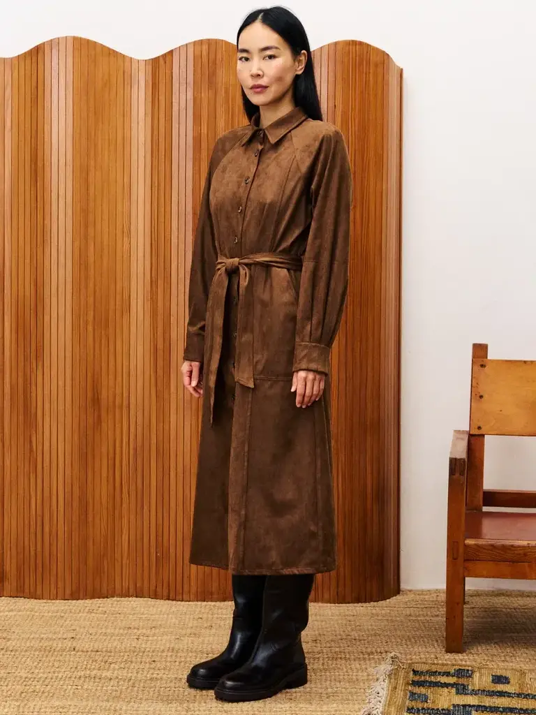 The FRNCH brand shirt dress is a unique piece that could enhance your wardrobe. It features a straight, flowing cut that goes well with its shirt neckline. It also has an adjustable belt and the whole dress is made from suede fabric, making it comfortable to wear to various events.