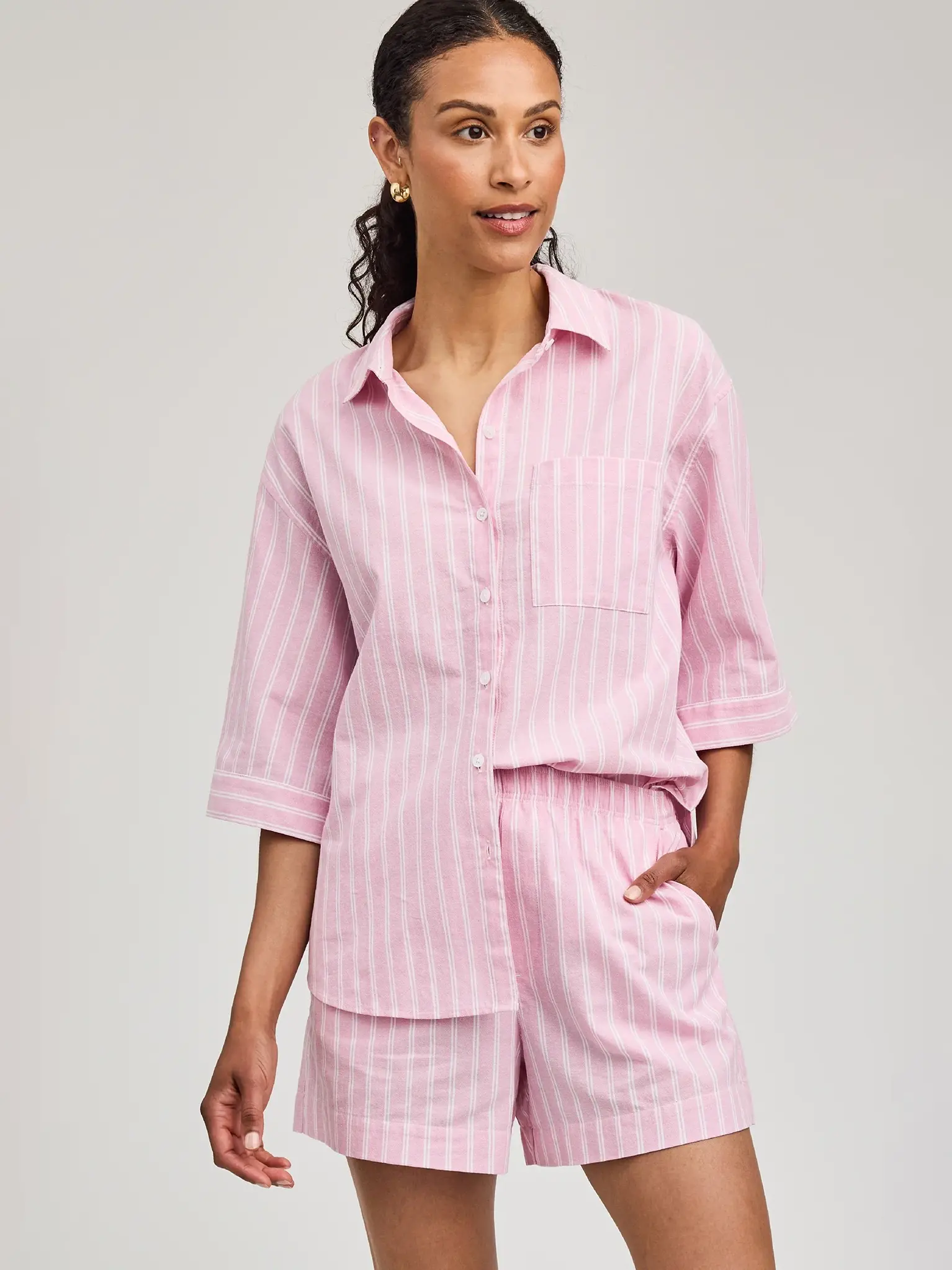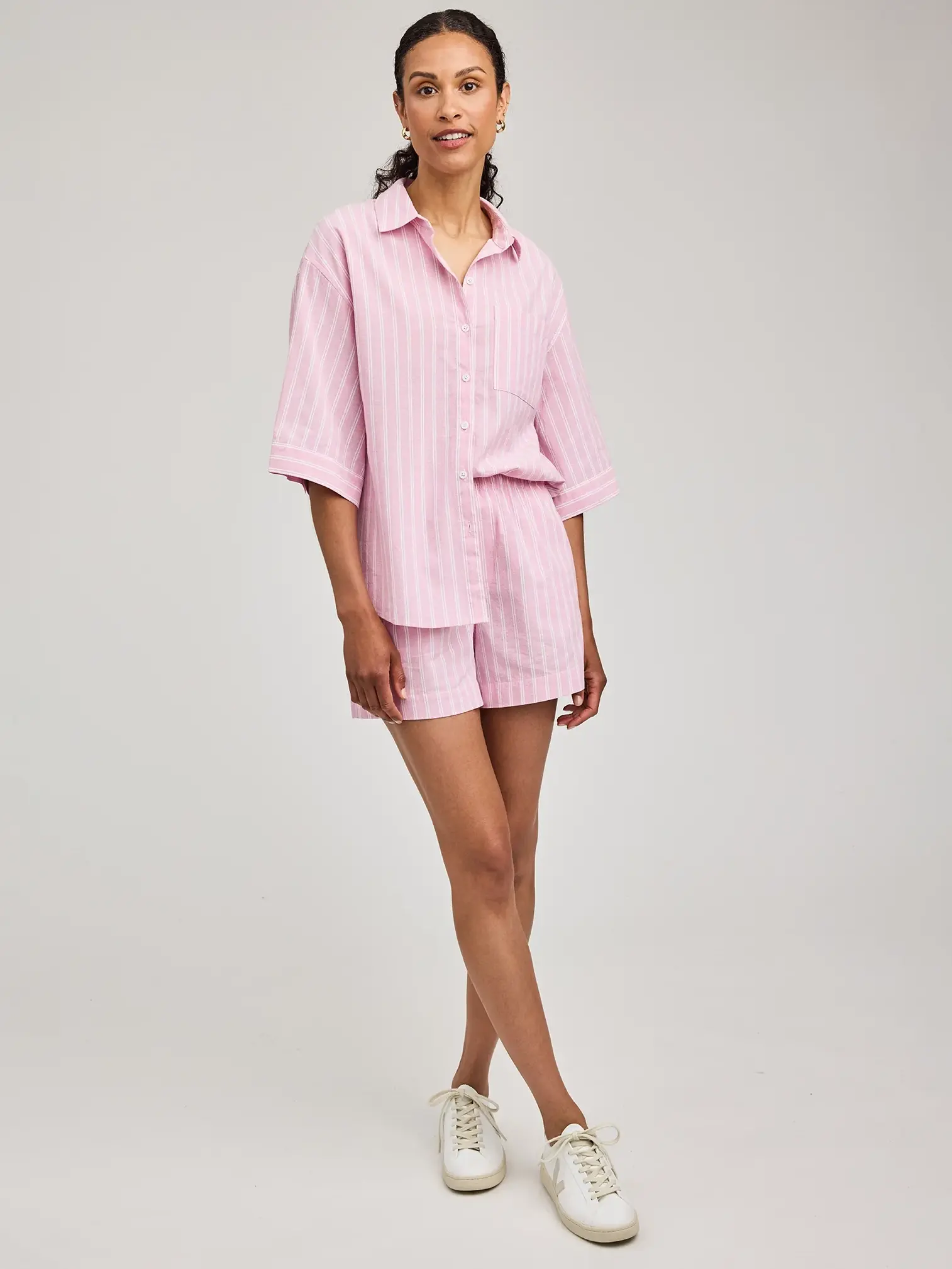 Light pink shirt with thin vertical stripes by Gentlefawn.
