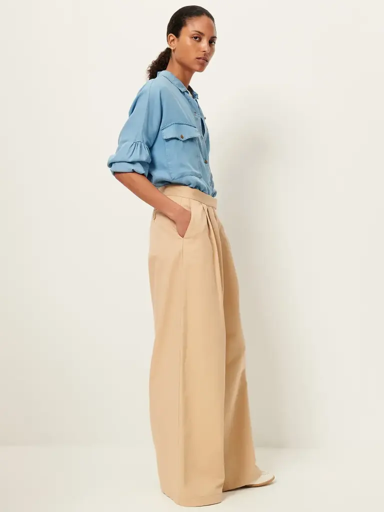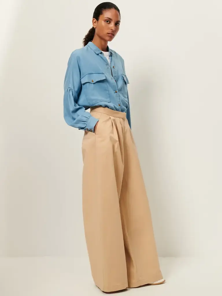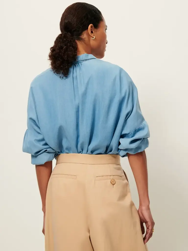 Shirt with low gathered armholes and patch pockets in faded lyocell chambray woven in Spain.