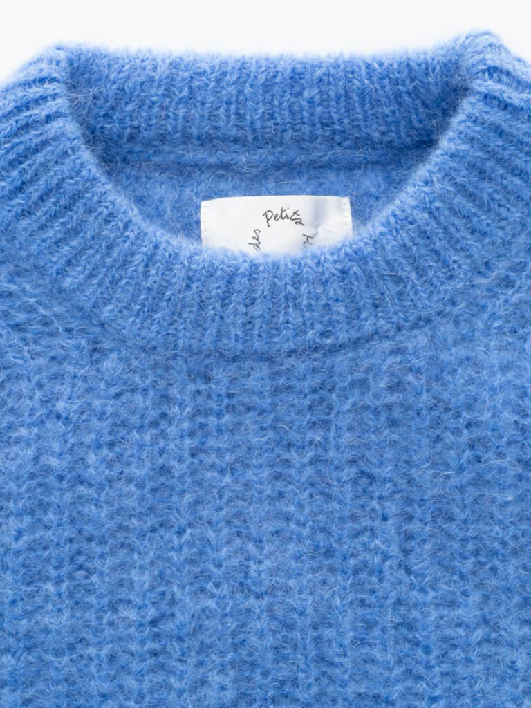 Exclusive Italian “Moelleux” yarn, manufactured for Des Petits Hauts for 11 years, the brand's signature yarn. This iconic yarn combines premium Kid Mohair and merino wool from farms that respect animal welfare and are certified mulesing-free. The result is a fluffy, warm, incredibly soft yarn with a downy feel, reflecting unique craftsmanship.