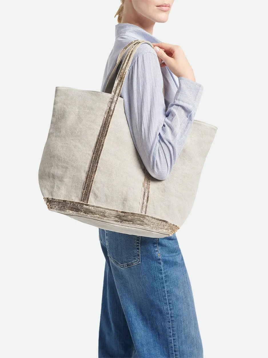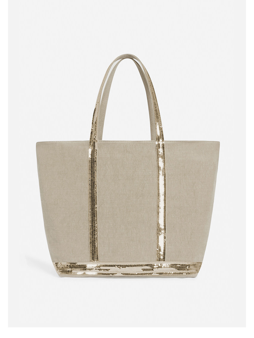 - L-size tote bag in linen and sequins.