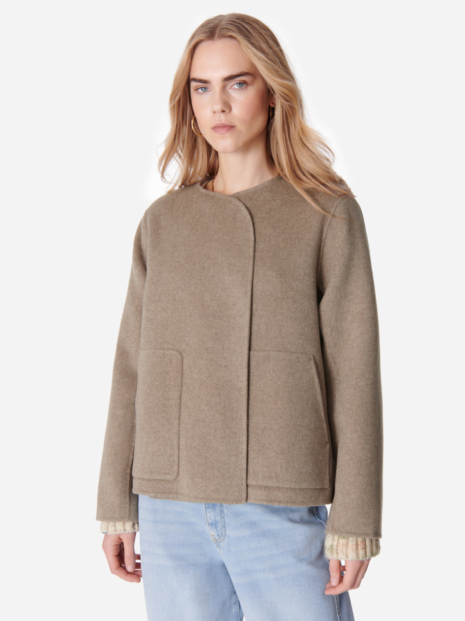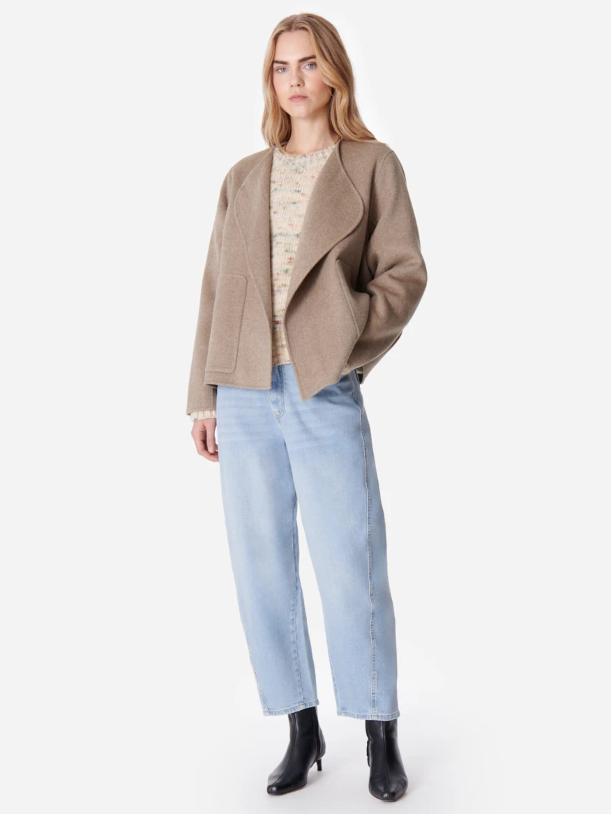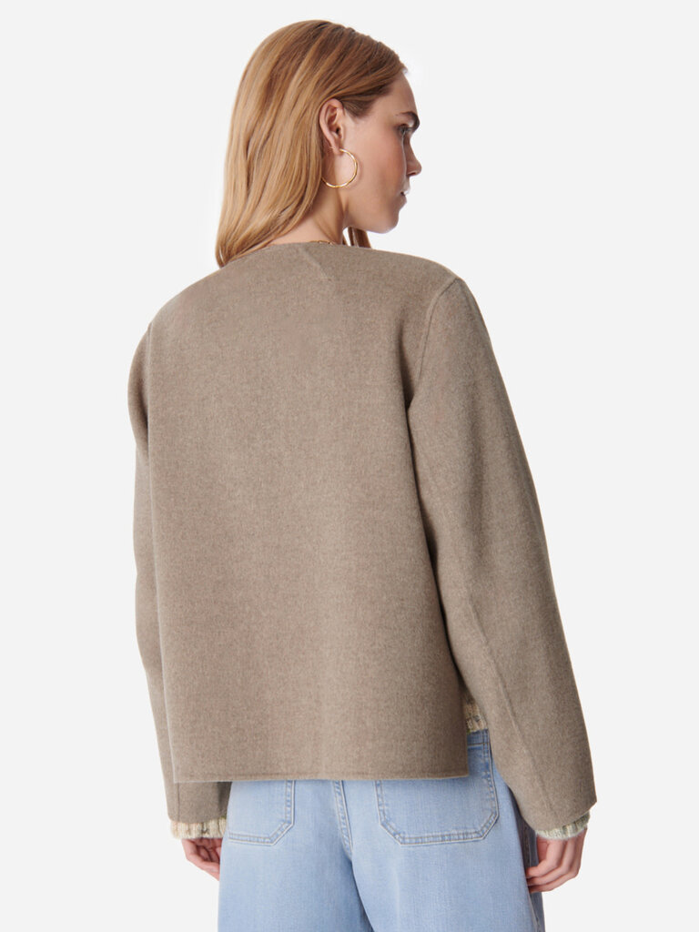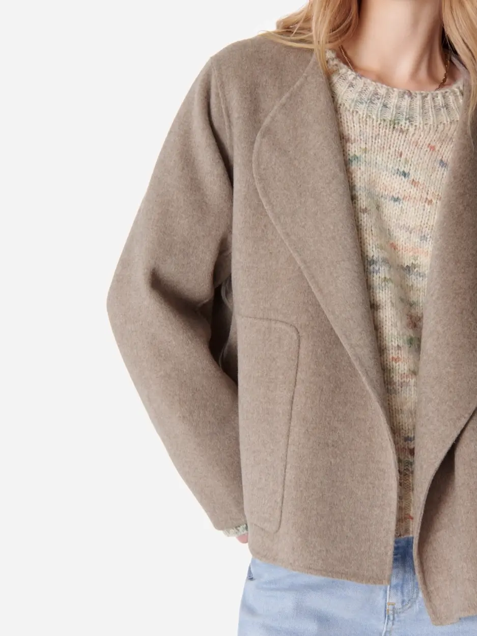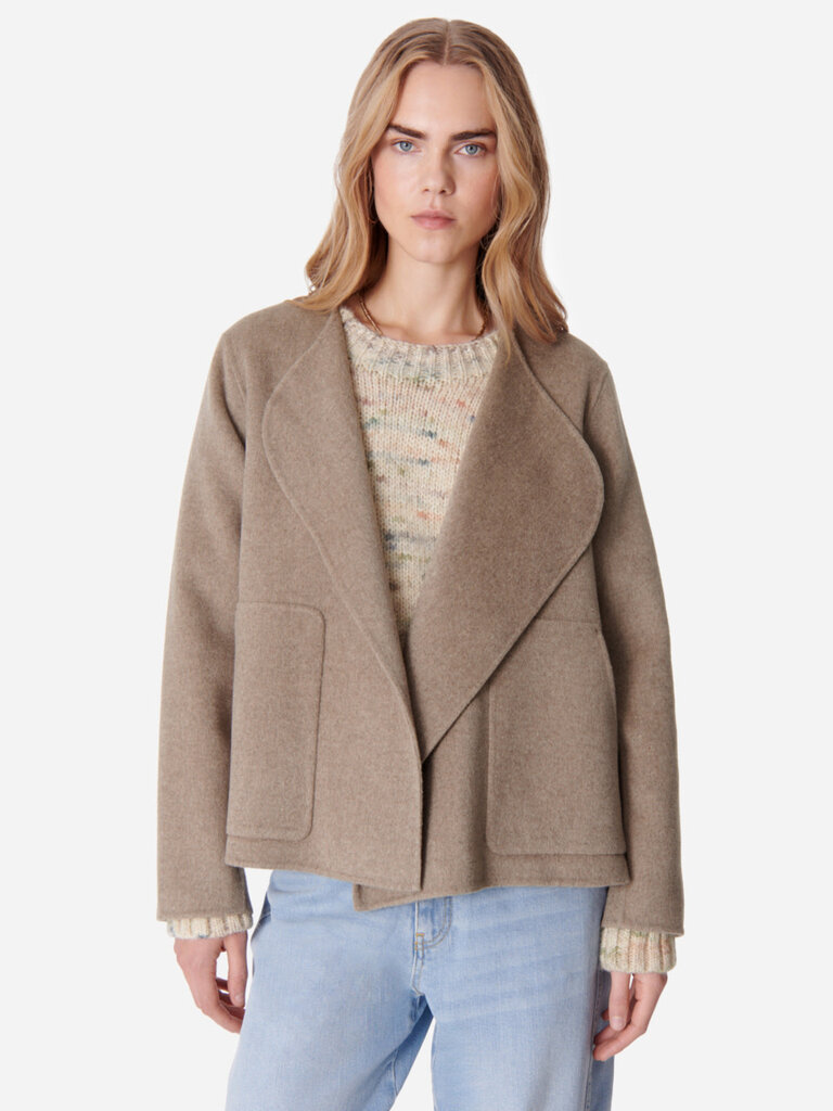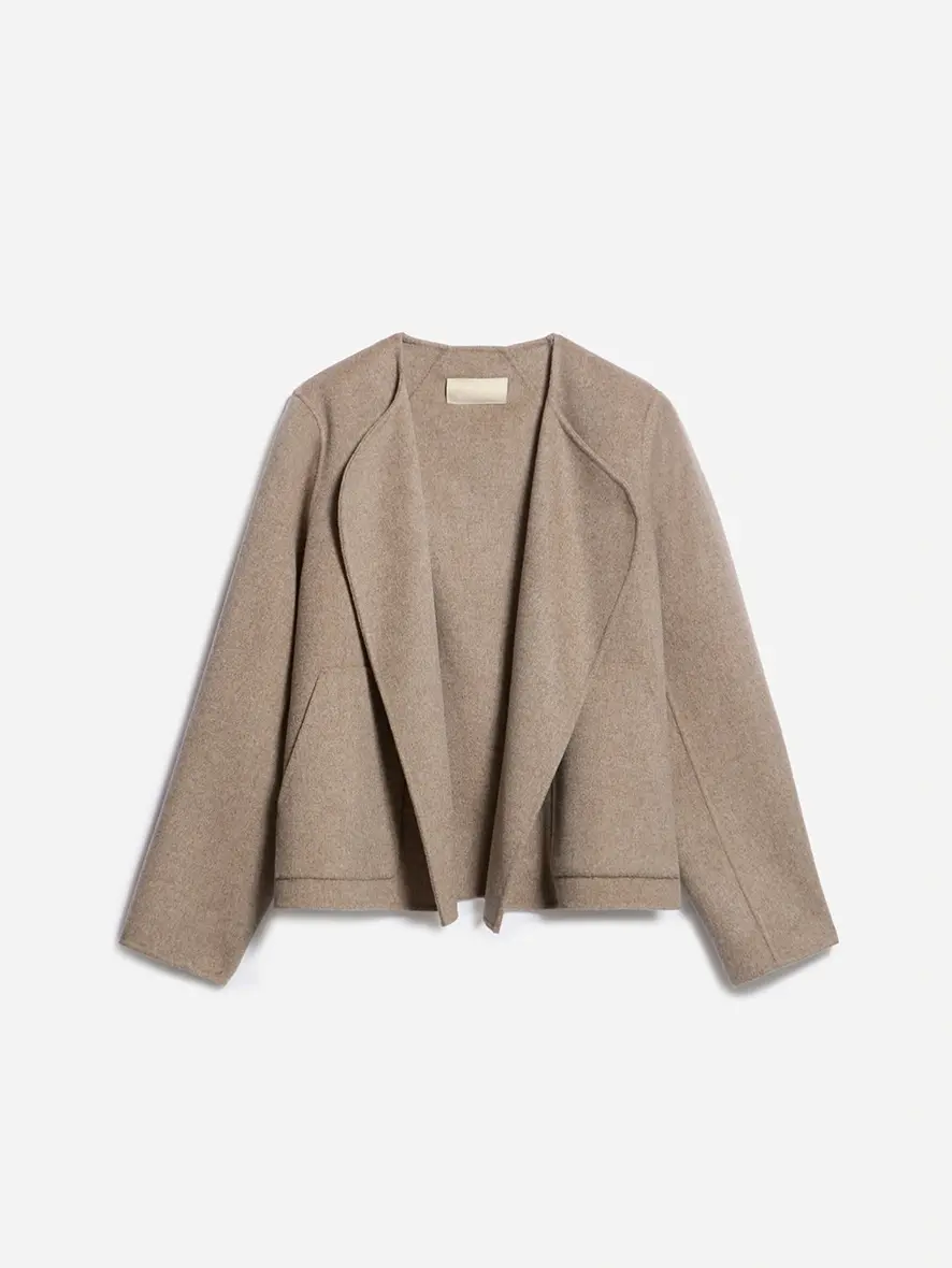 Lightweight yet warm, this double-sided wool jacket is ideal for the transition from winter to spring. Its loose, flowing cut creates effortless elegance, while its draped collar gives it a modern, relaxed silhouette. Easy to layer, it embodies a timeless style that is perfect for any wardrobe.