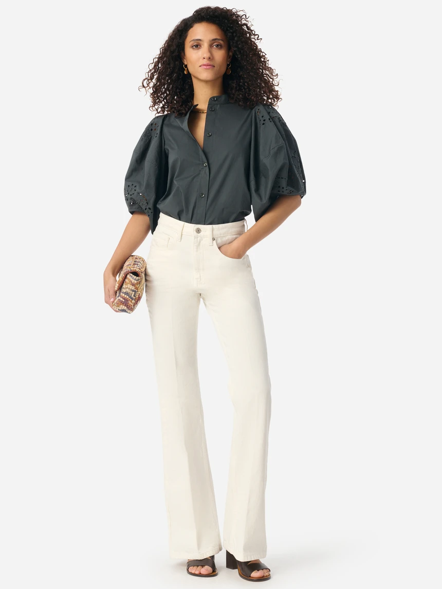 With its sculpted volumes and structured cut, this blouse revisits feminine style with a bold modern twist.