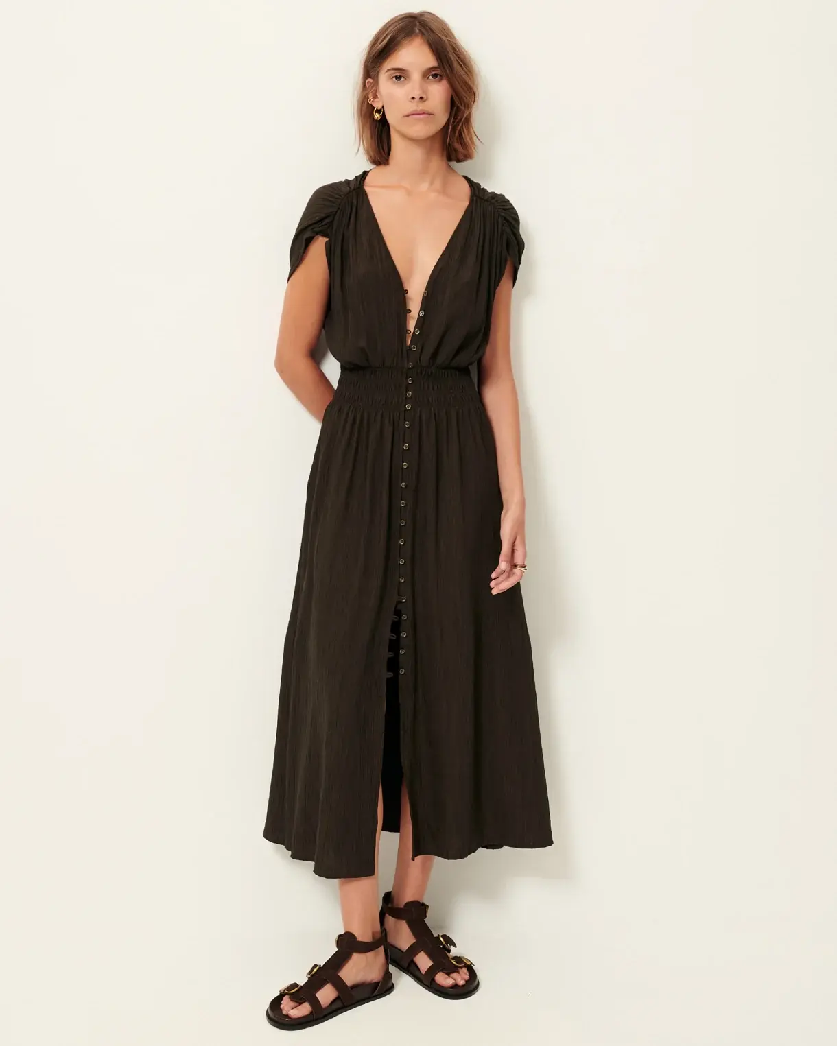 Long buttoned and smocked dress in soft viscose seersucker crepe.