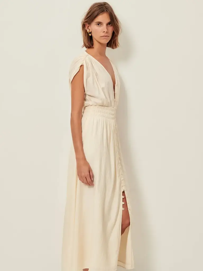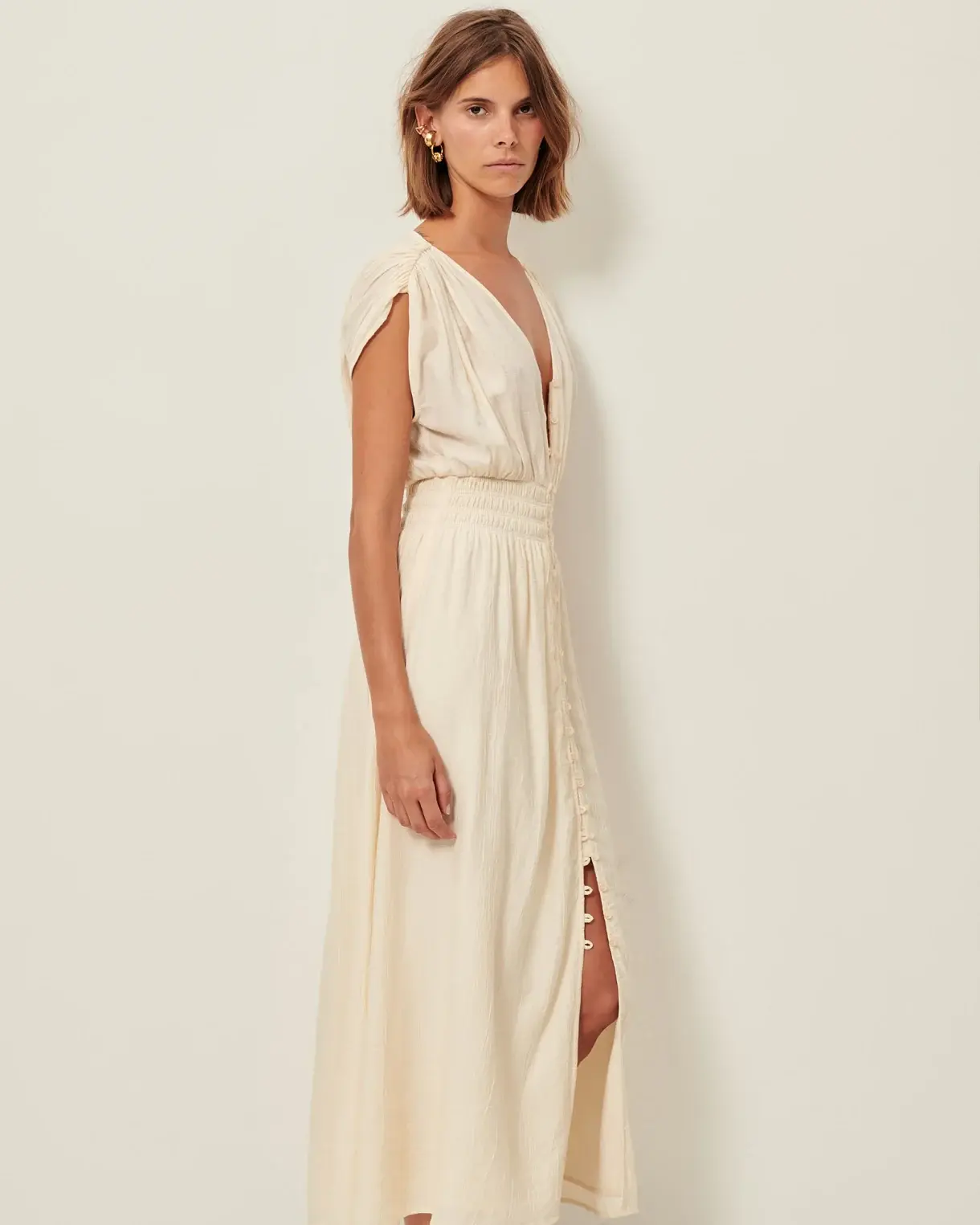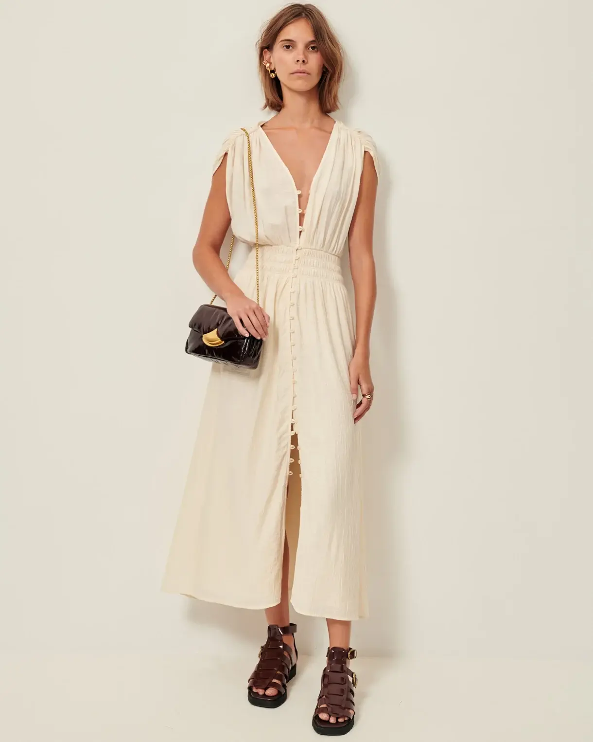 Long buttoned and smocked dress in soft viscose seersucker crepe.