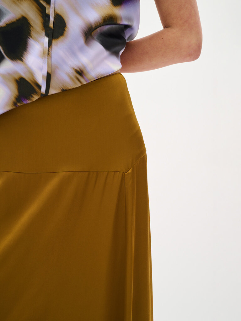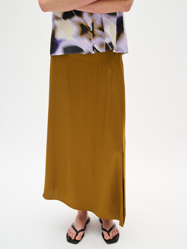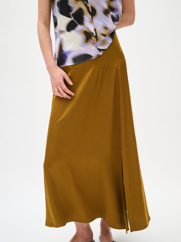 Inwear's Kayla skirt is a satin, flowing skirt with a slight asymmetry at the waist. The slit is approximately 40cm long. This gives a nice opening without revealing the leg.