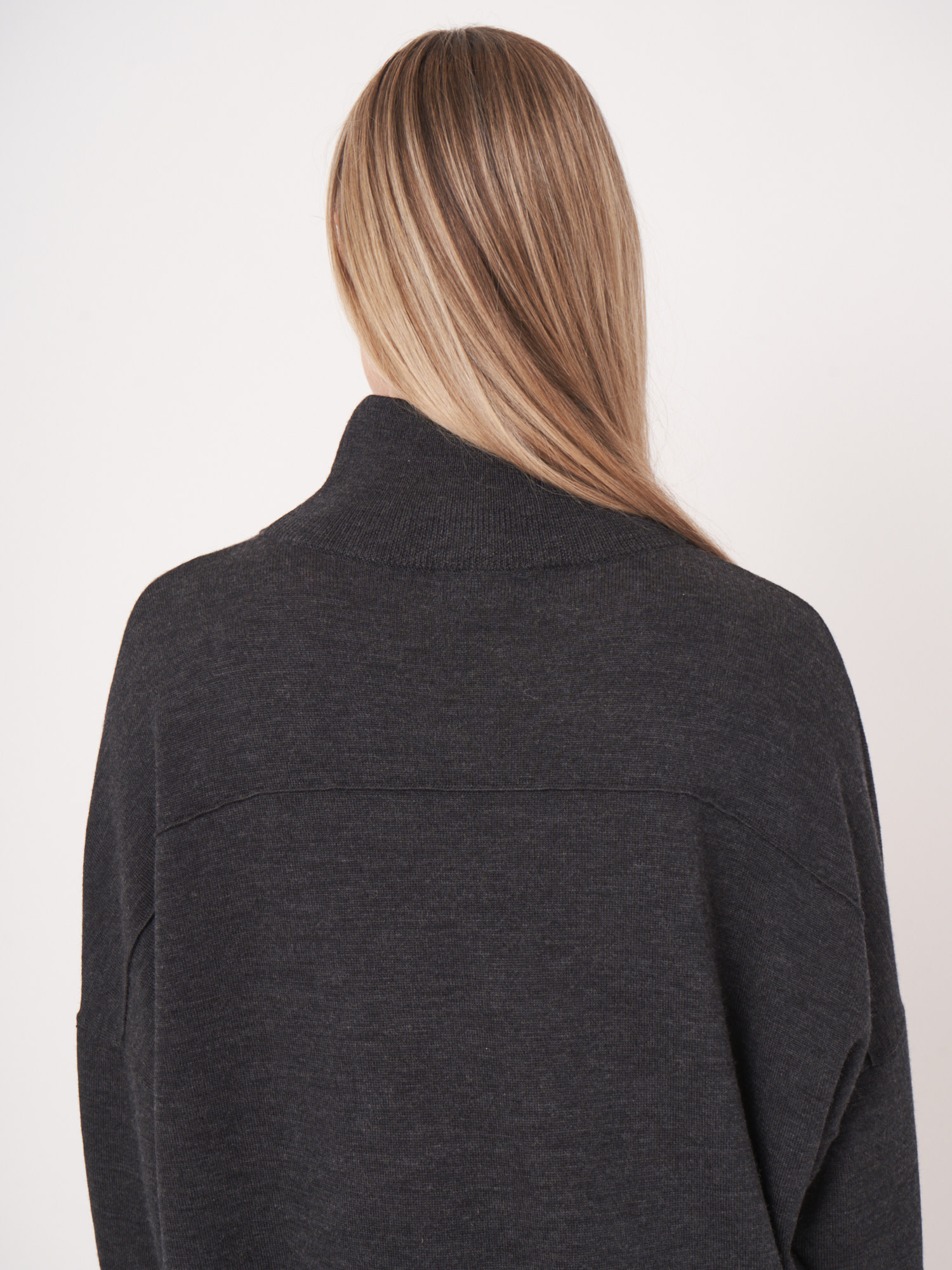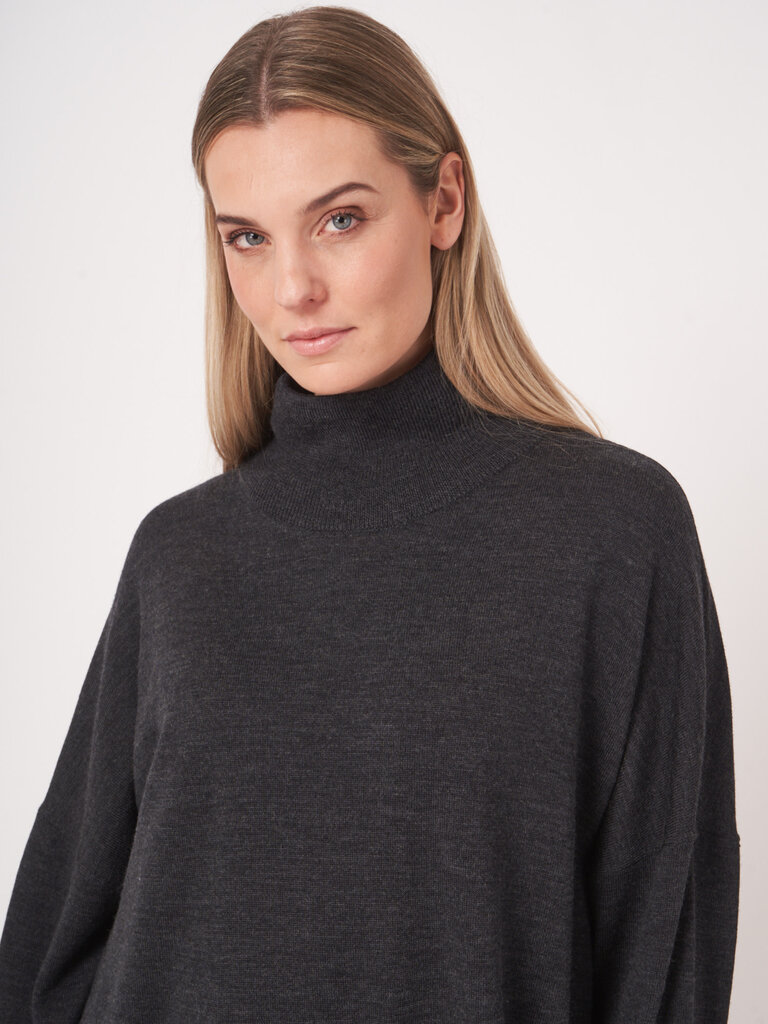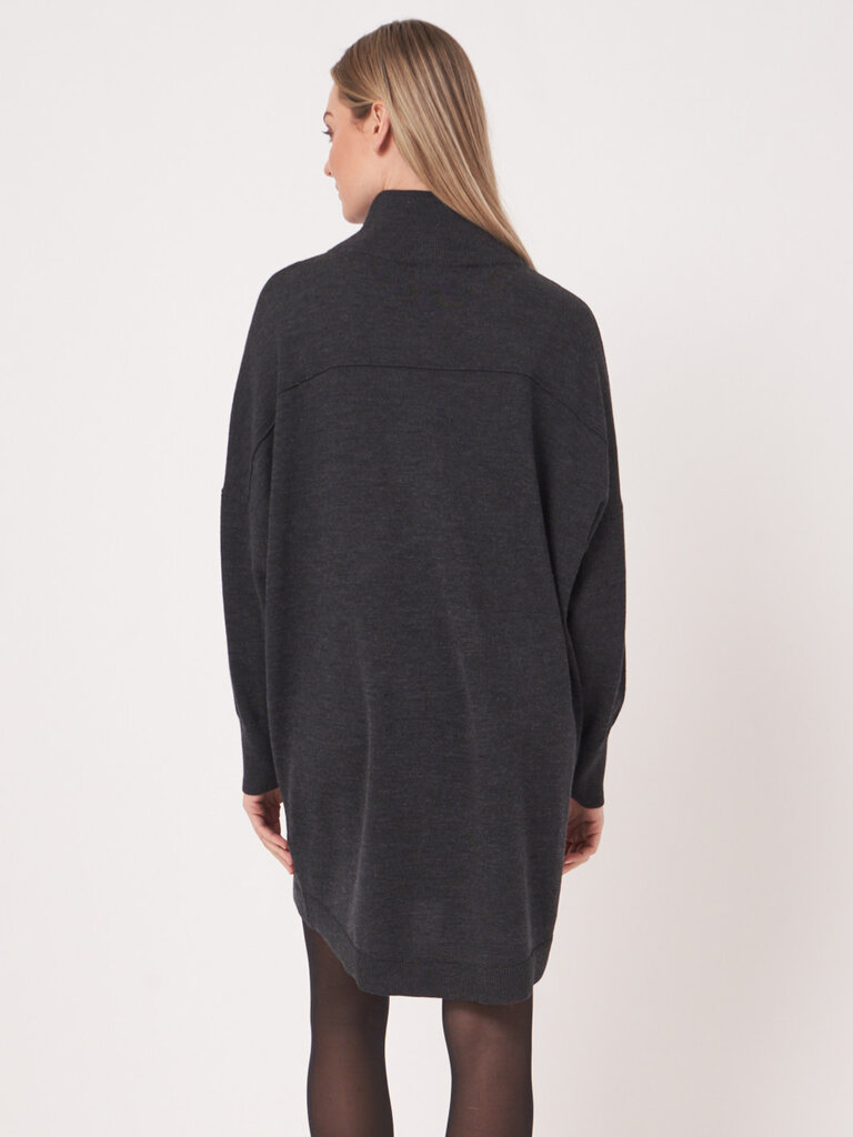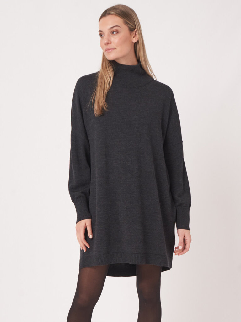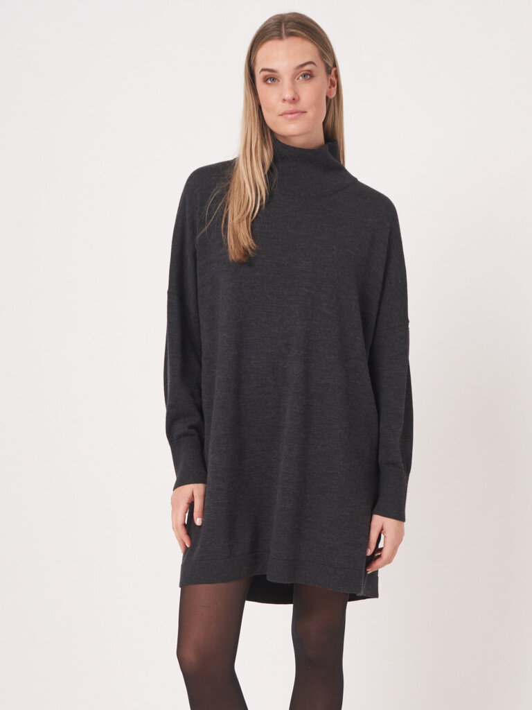 The REPEAT knit dress will win you over with its comfort, while remaining an effective piece to wear on a special occasion. Its high neck, long cut, and fine knit give it a simple yet modern style.