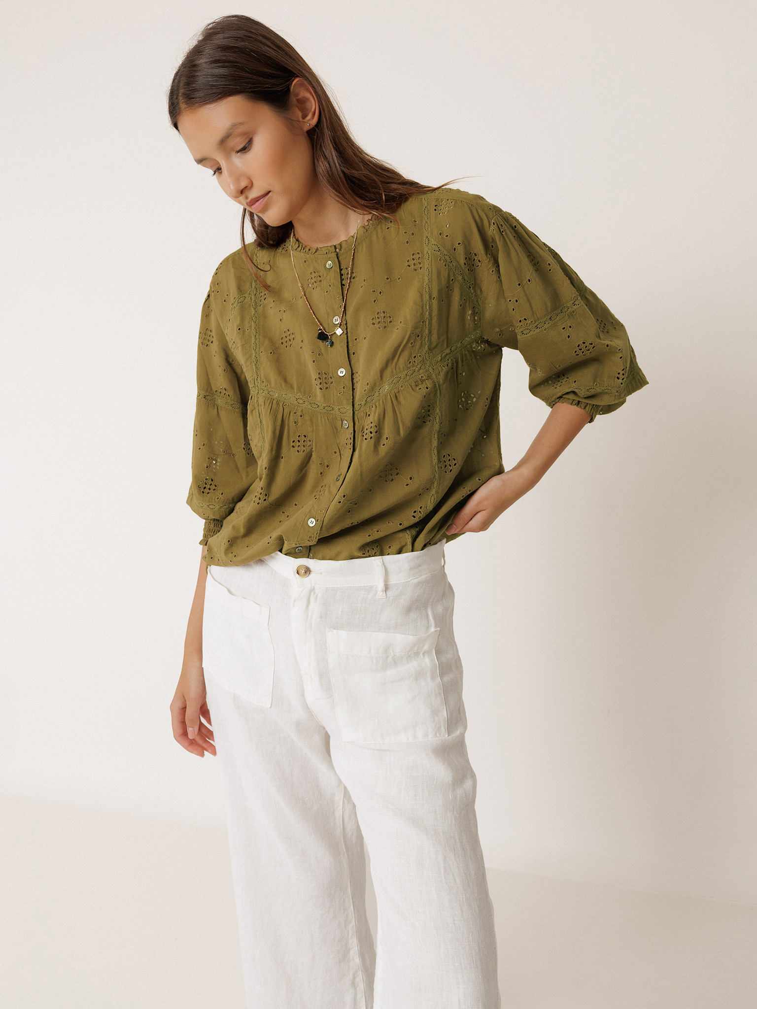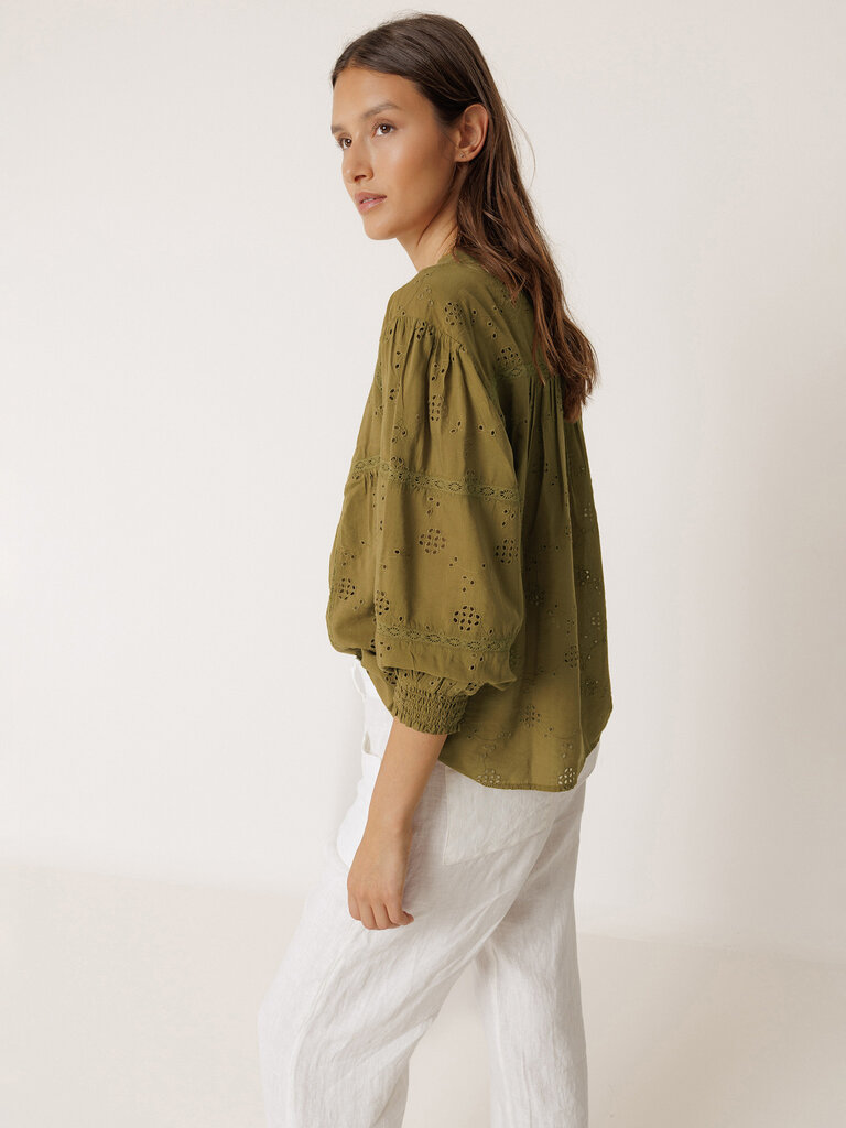 Khaki blouse with embroidery detail by Indi & Cold.