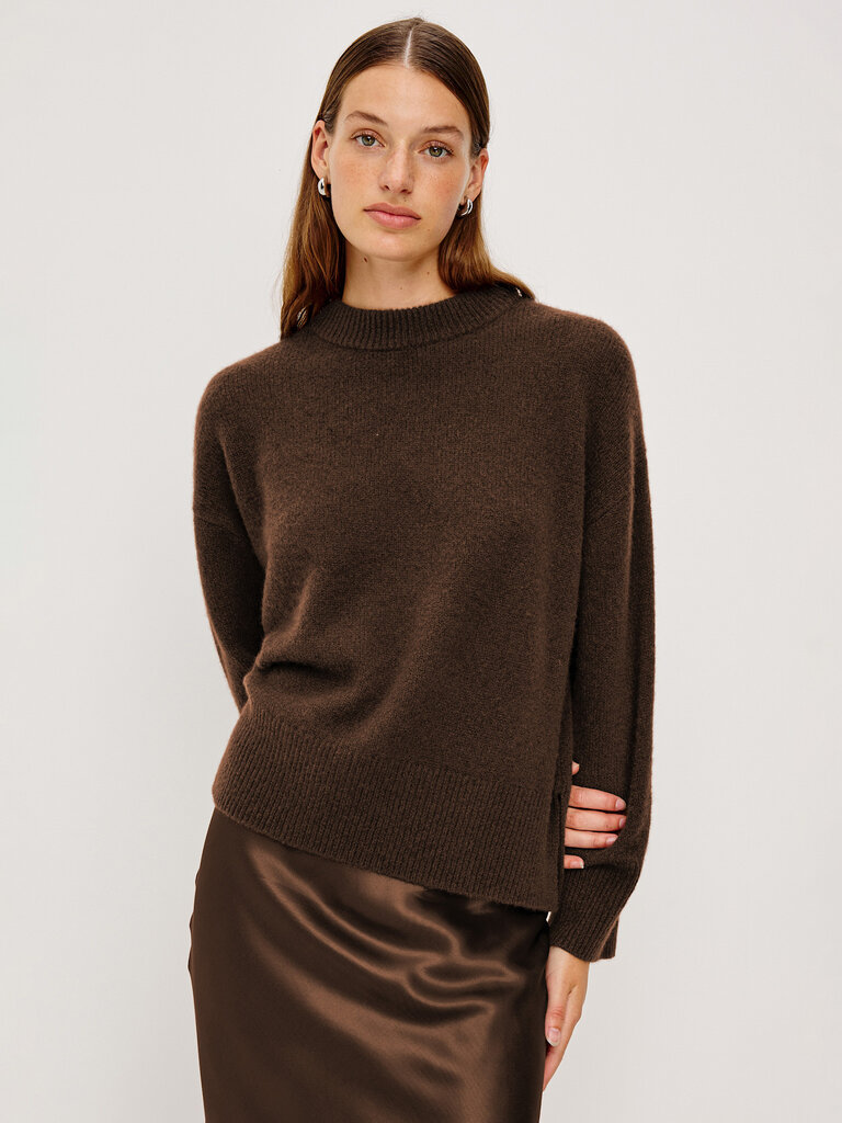 The chocolate-colored Miranda sweater is a comfortable and incredibly soft piece. Made from a blend of cashmere and silk, it feels great to the touch and can be paired with a satin skirt or jeans for a casual look. Durable and long-lasting, this sweater is a real asset to any wardrobe.