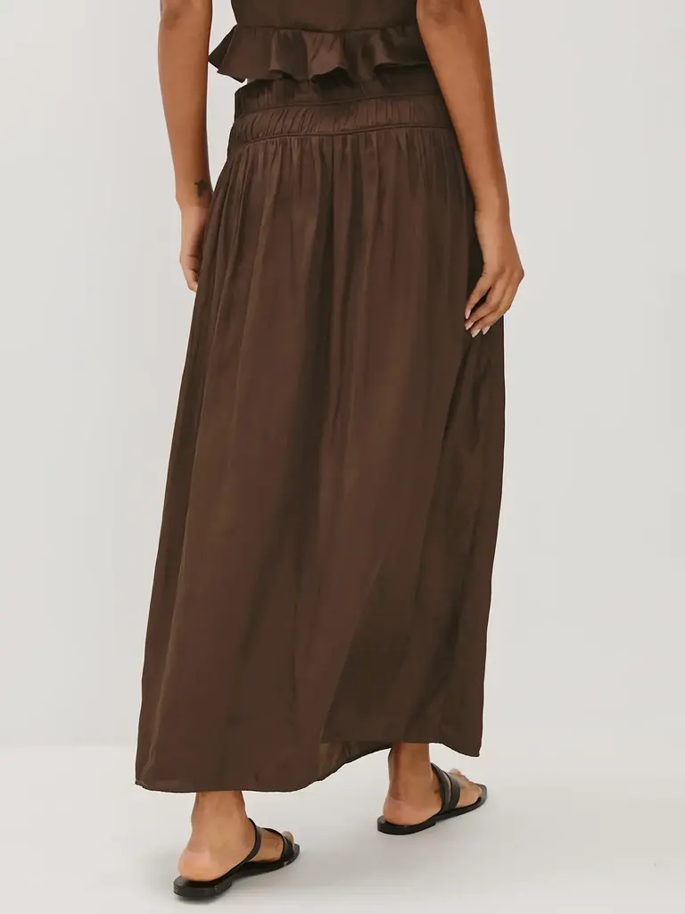 The Nara midi skirt is crafted from elegant crinkled satin. Its fitted waist gives way to a flowing cut throughout, complemented by a discreet side zipper for easy wear. Its lightness makes it pleasant to the touch and comfortable to wear, and it can be easily combined with other items to create an outfit.