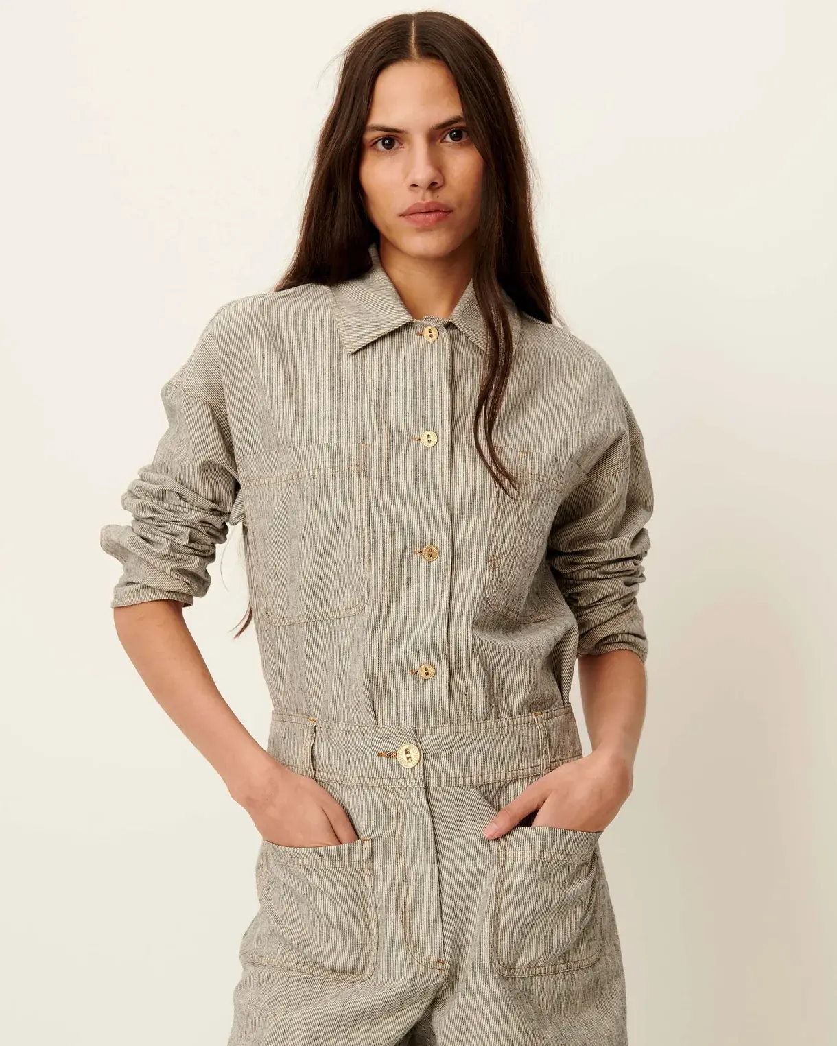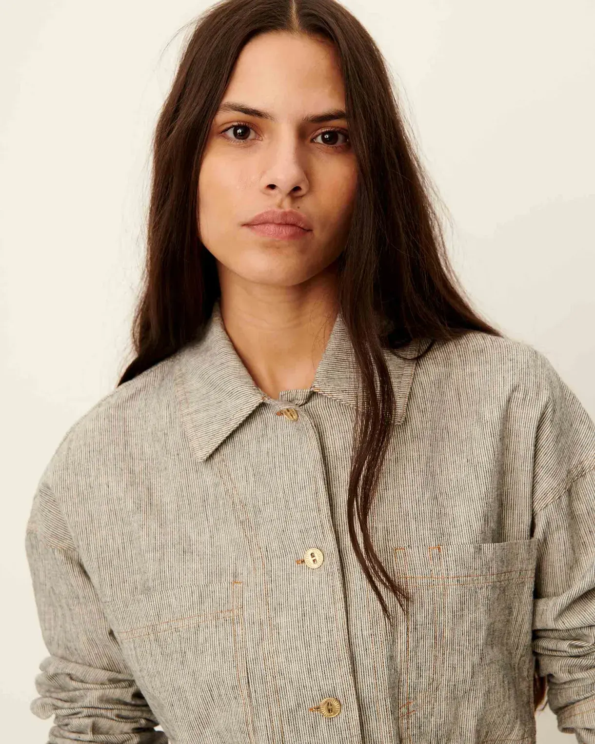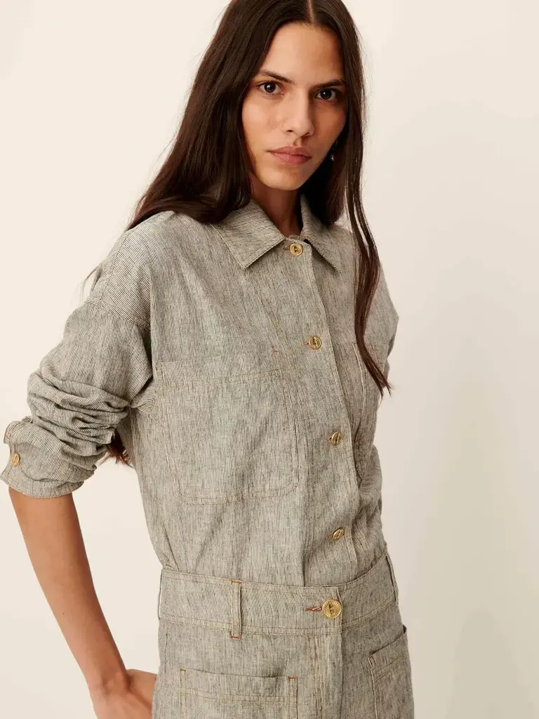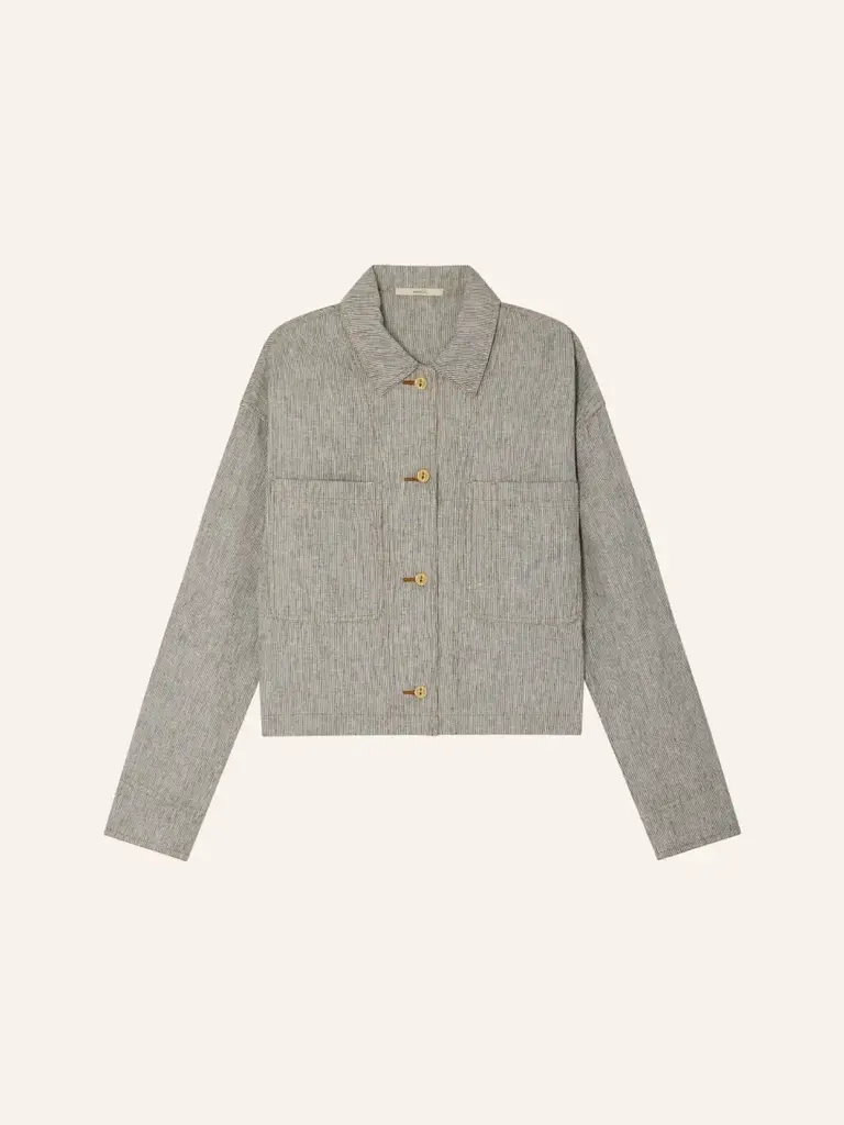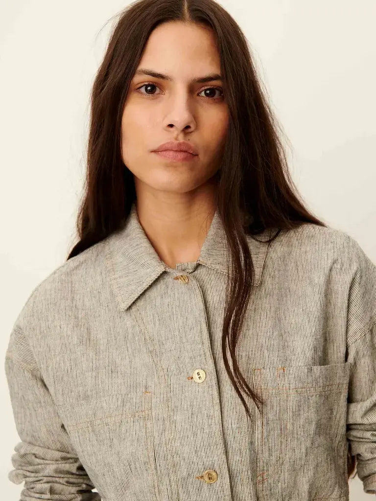 Overshirt with patch pockets in linen and cotton with slub yarns and two-tone stripes, woven in Spain.