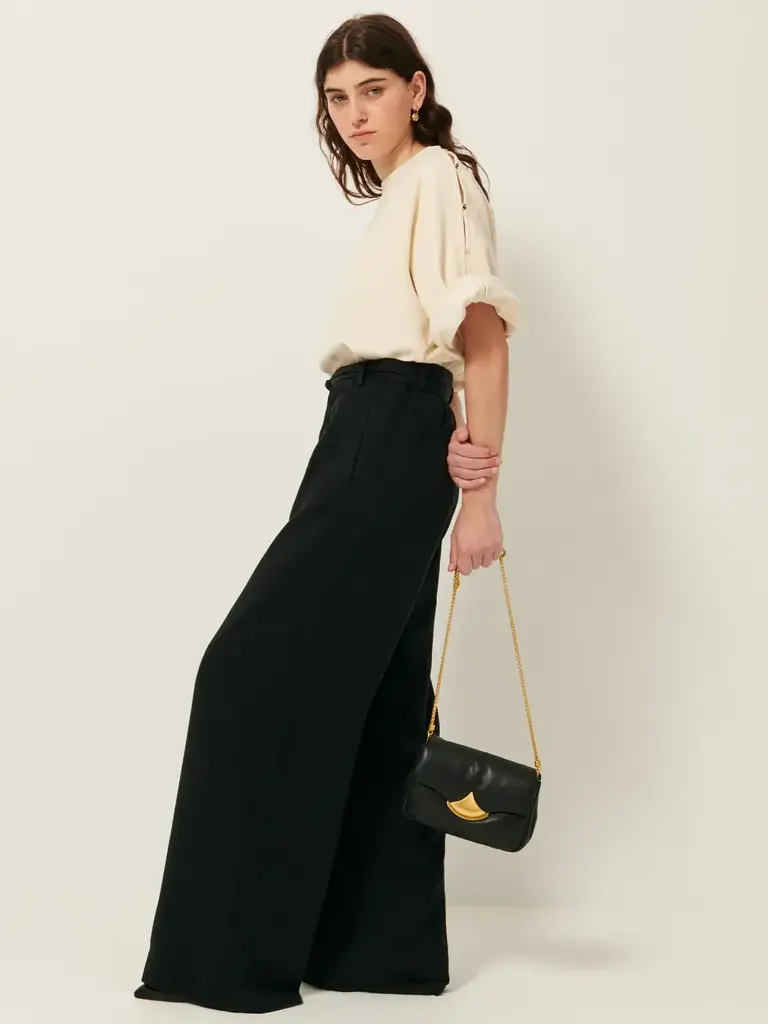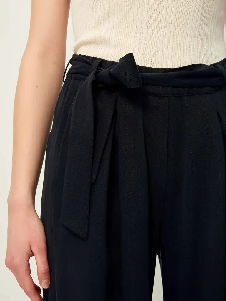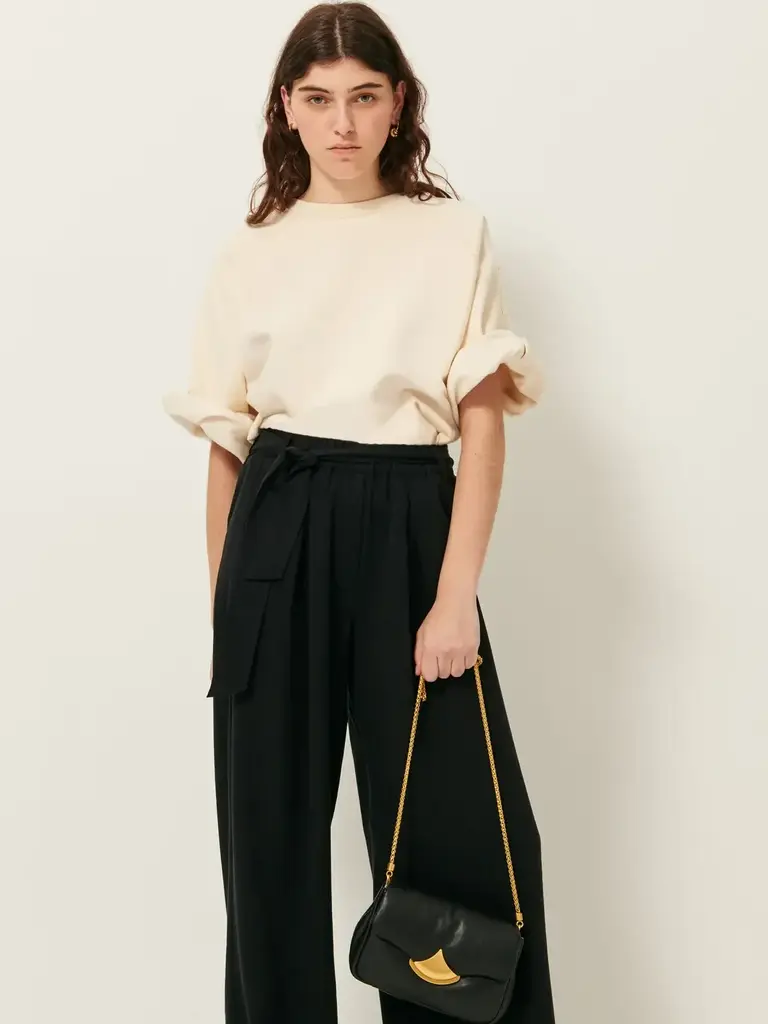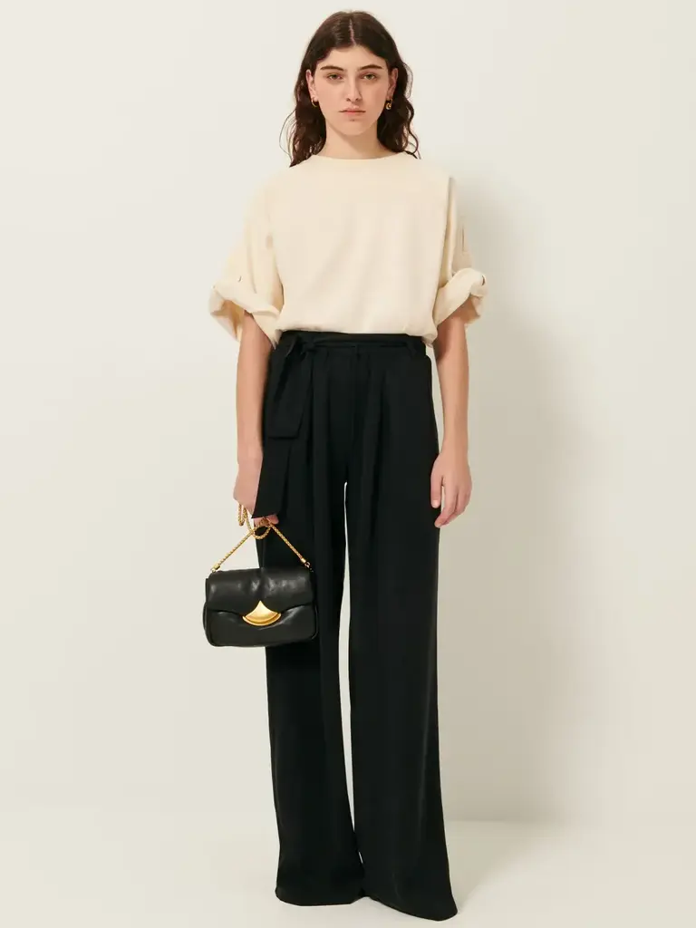 Loose-fitting pants with elastic waistband and removable tie belt in lightweight, fluid, satiny gabardine.