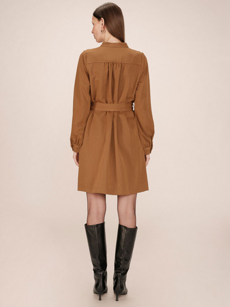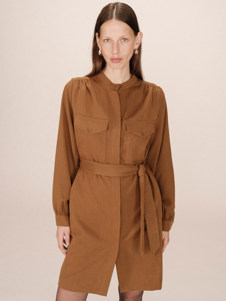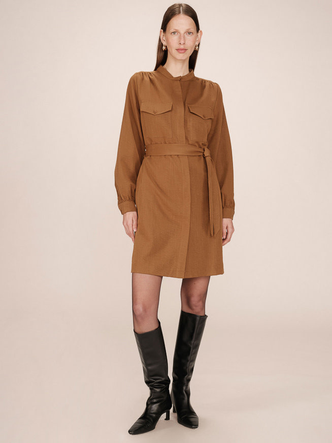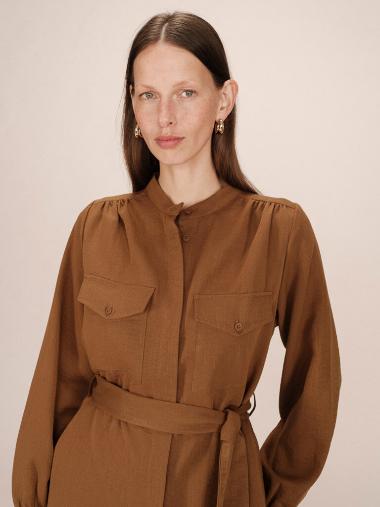 The SERBIA shirt dress by Grace & Mila offers a modern and structured look. Clean lines and functional details such as patch pockets and a hidden button placket make this a piece inspired by utility wear. The straight cut and gathered shoulders and back enhance the femininity of the design. The SERBIA shirt dress is a casual piece with urban elegance.