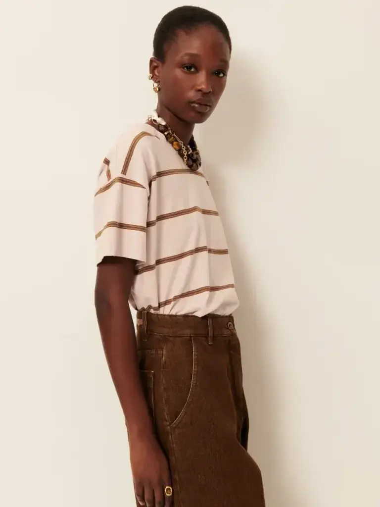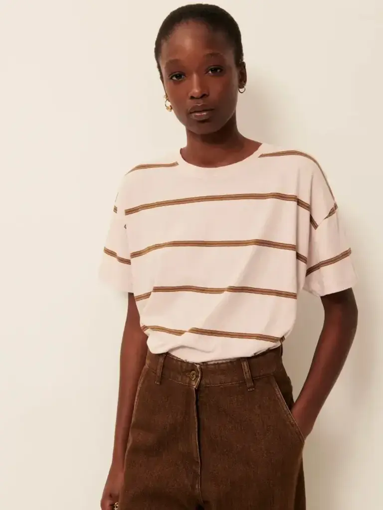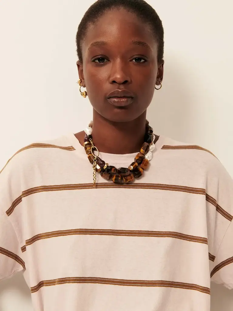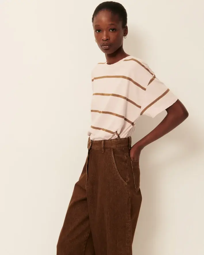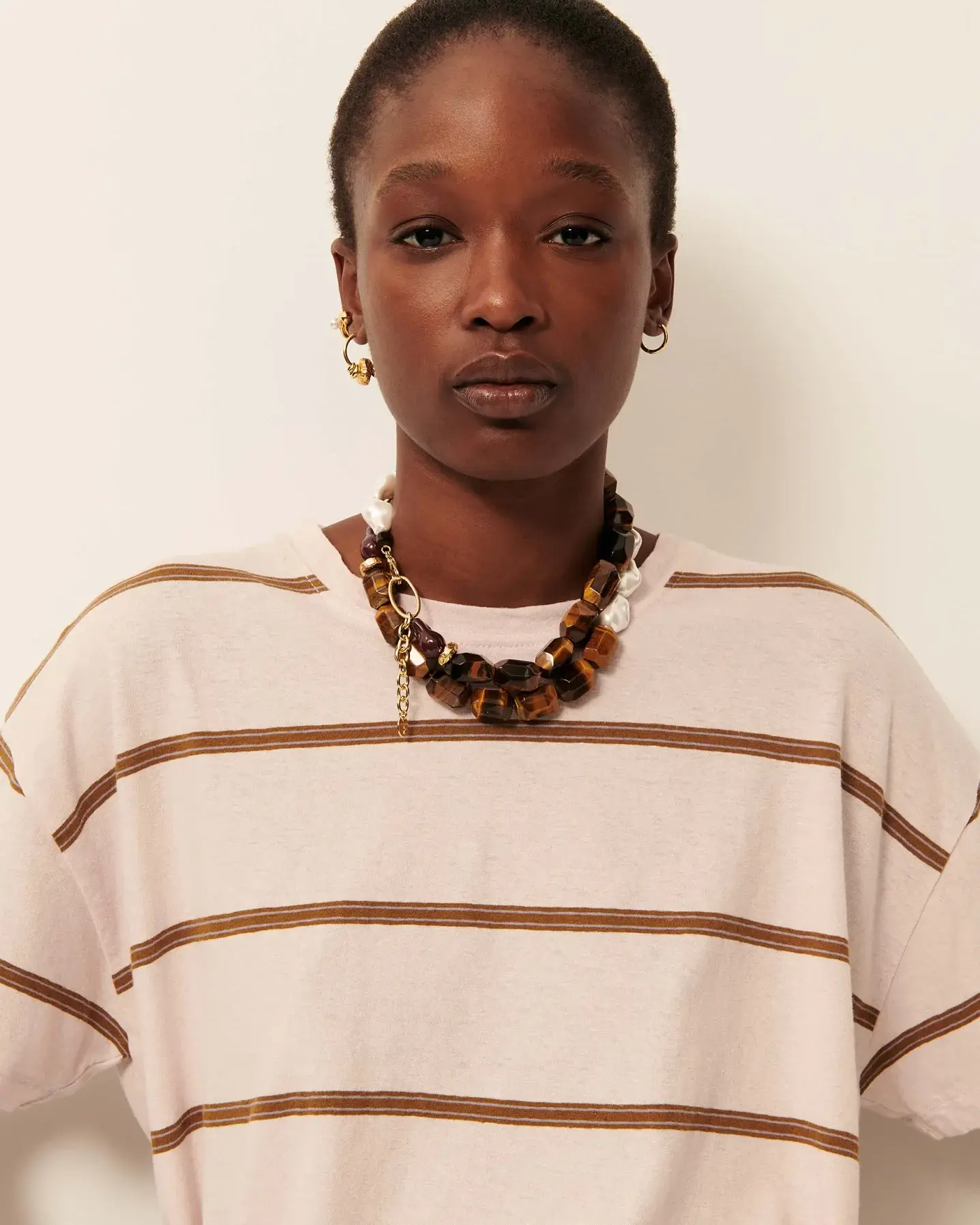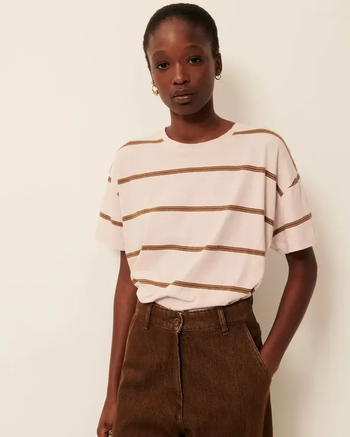 Oversized short-sleeve T-shirt made of striped cotton-linen jersey, made in Portugal.