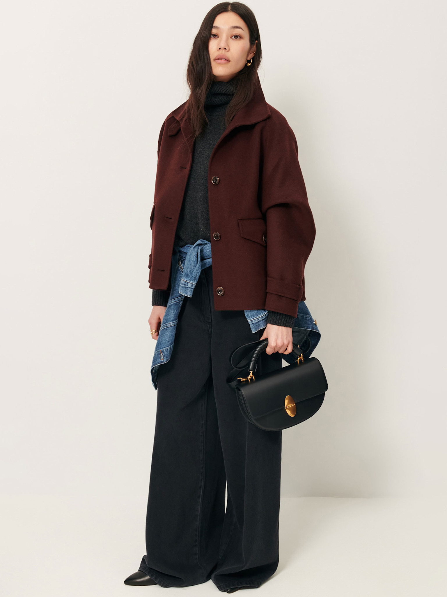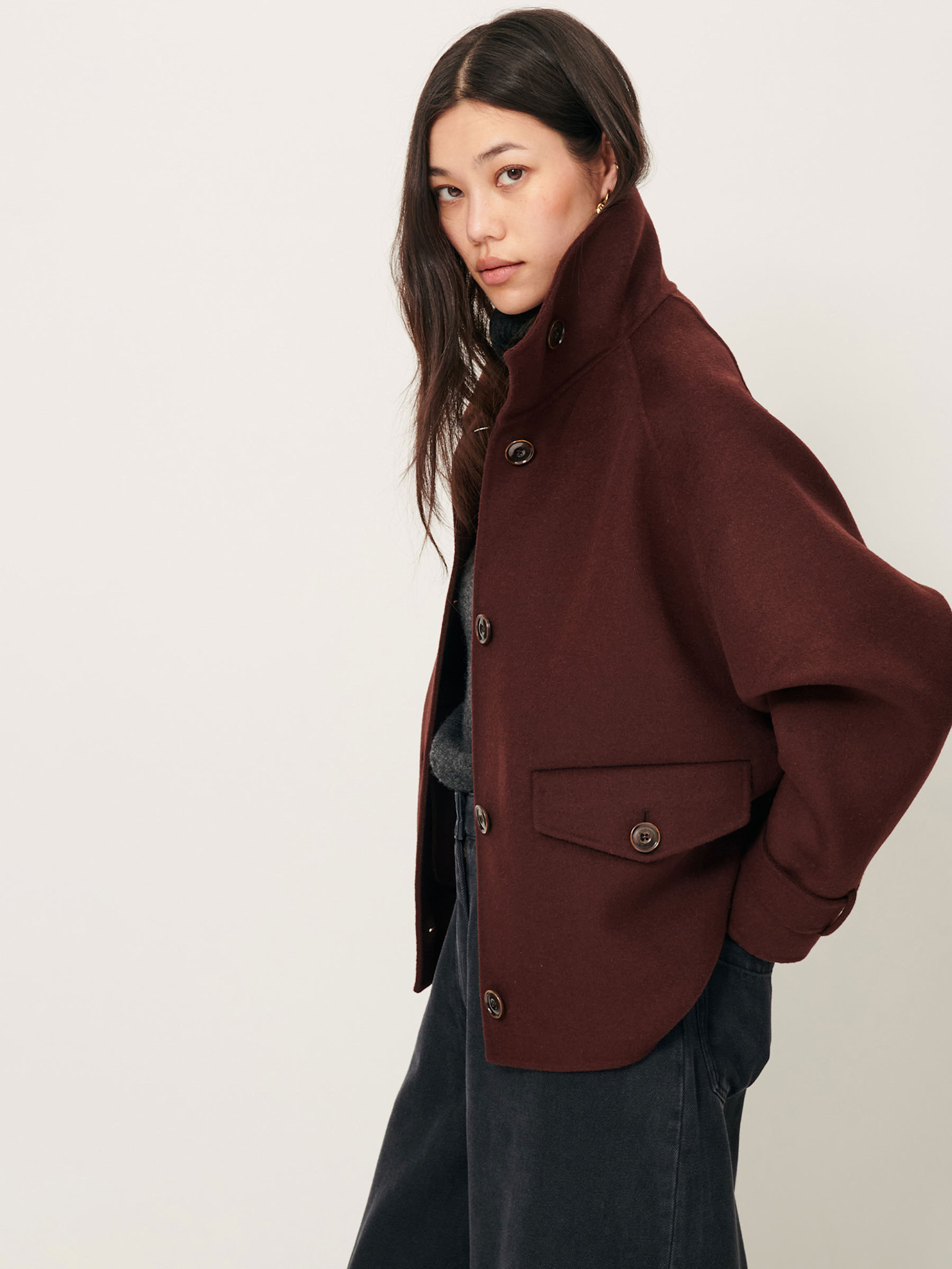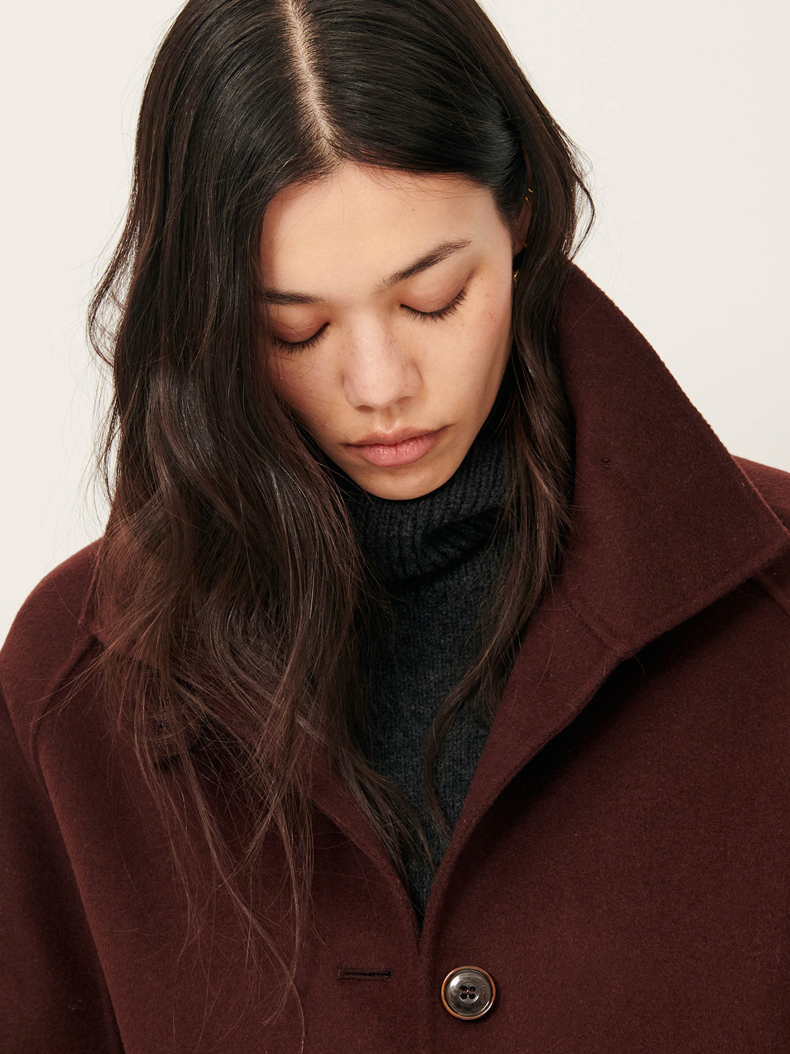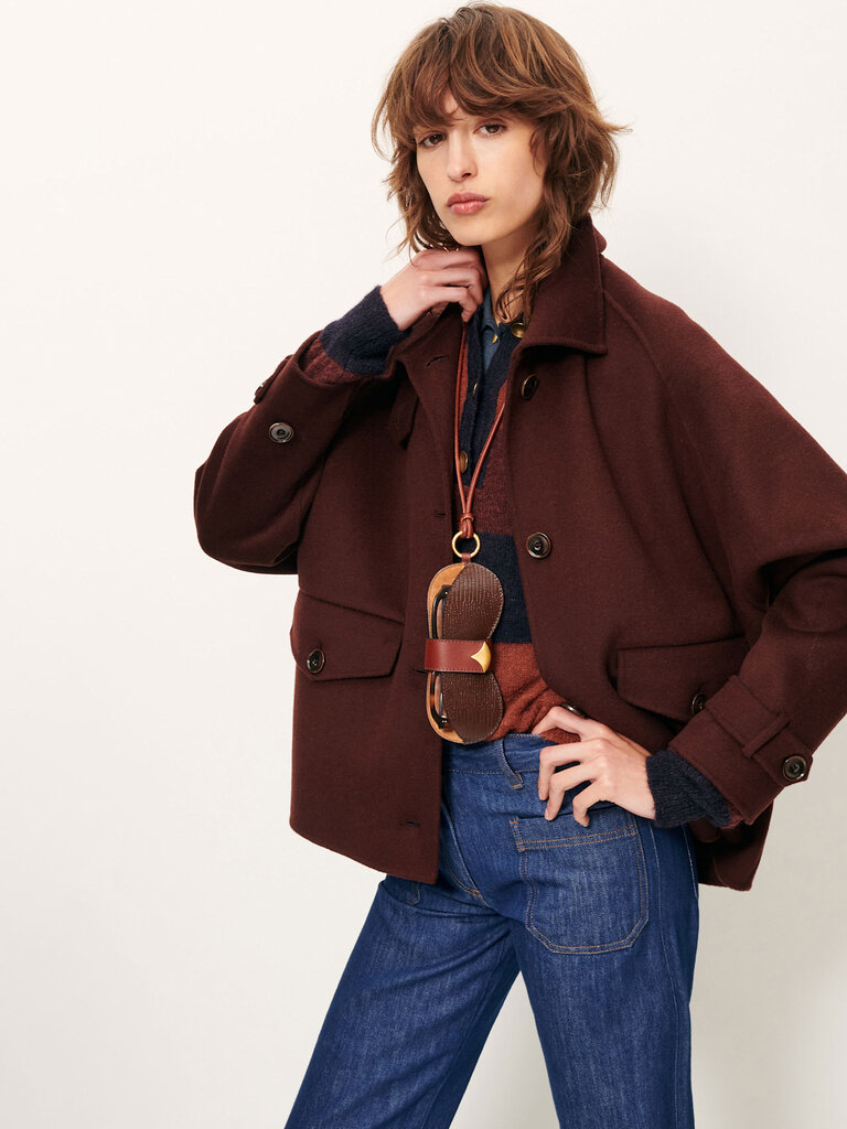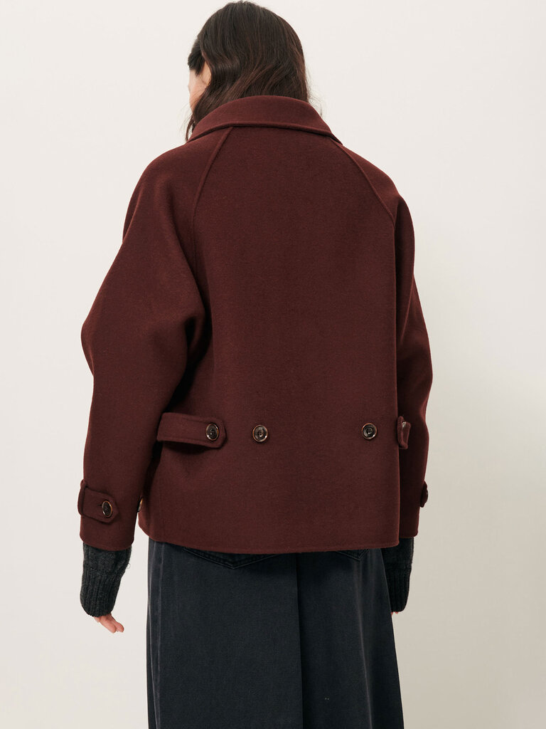 The Sessùn coat is a short wool coat with a jacket-style design and an espresso color. It is made from a double-weave fabric with a velvety finish, making it particularly soft to the touch. The coat has two side pockets and a zipper at the back.