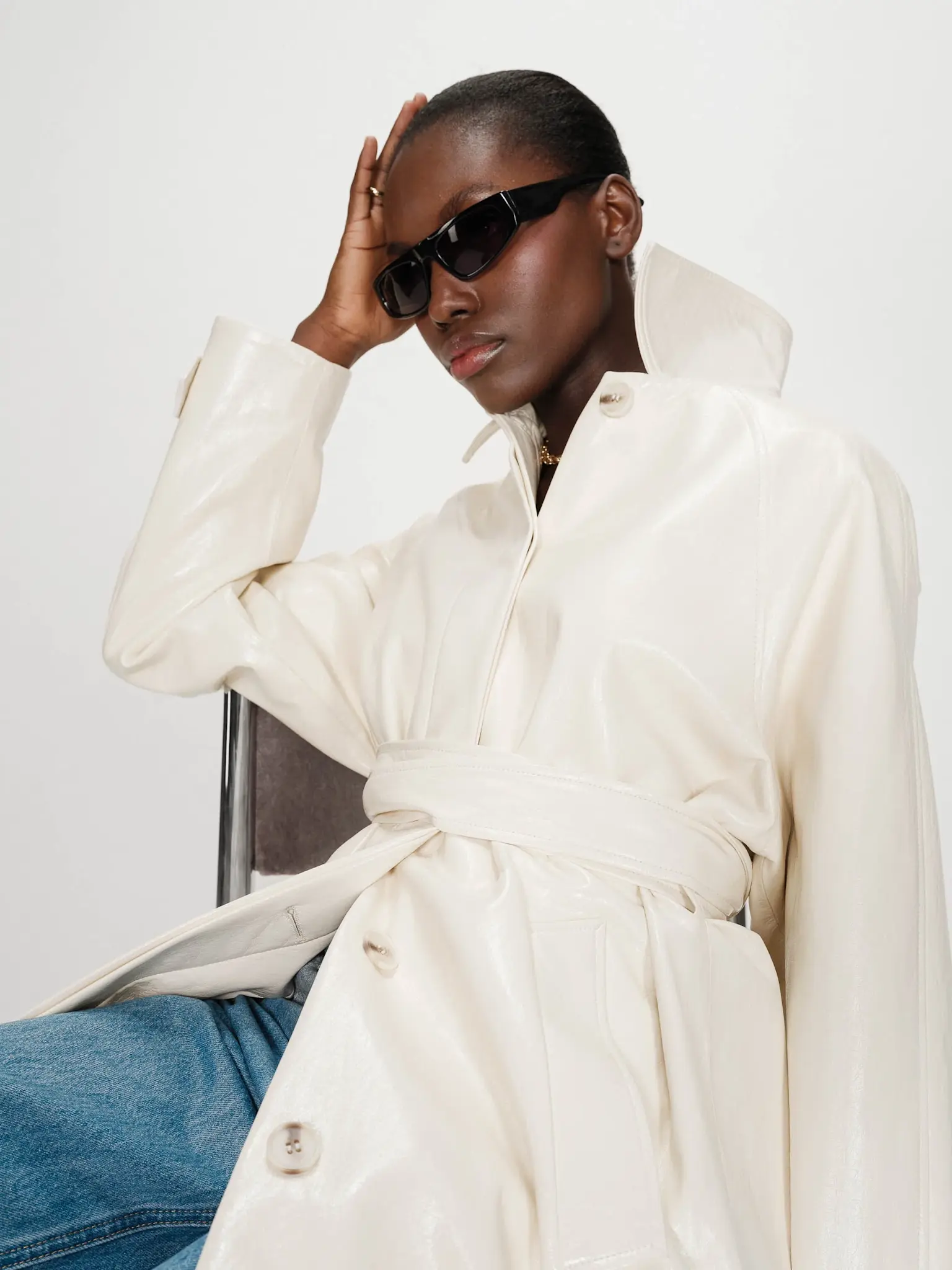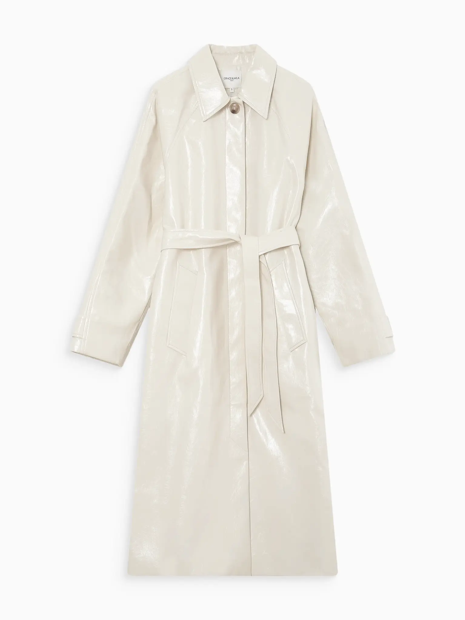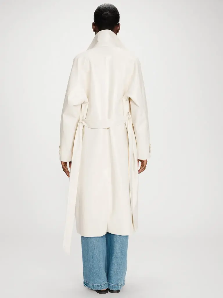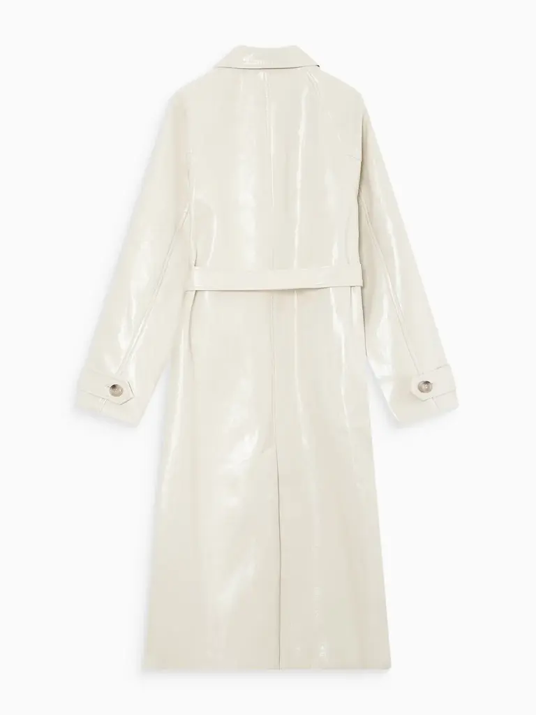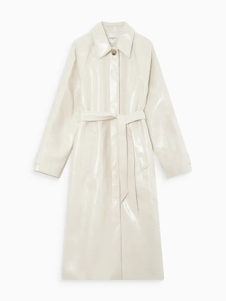 Cream vinyl trench coat by Grace & Mila.