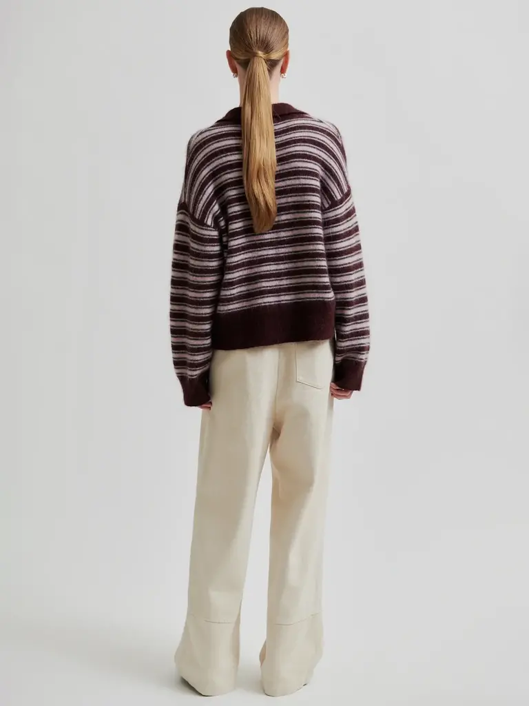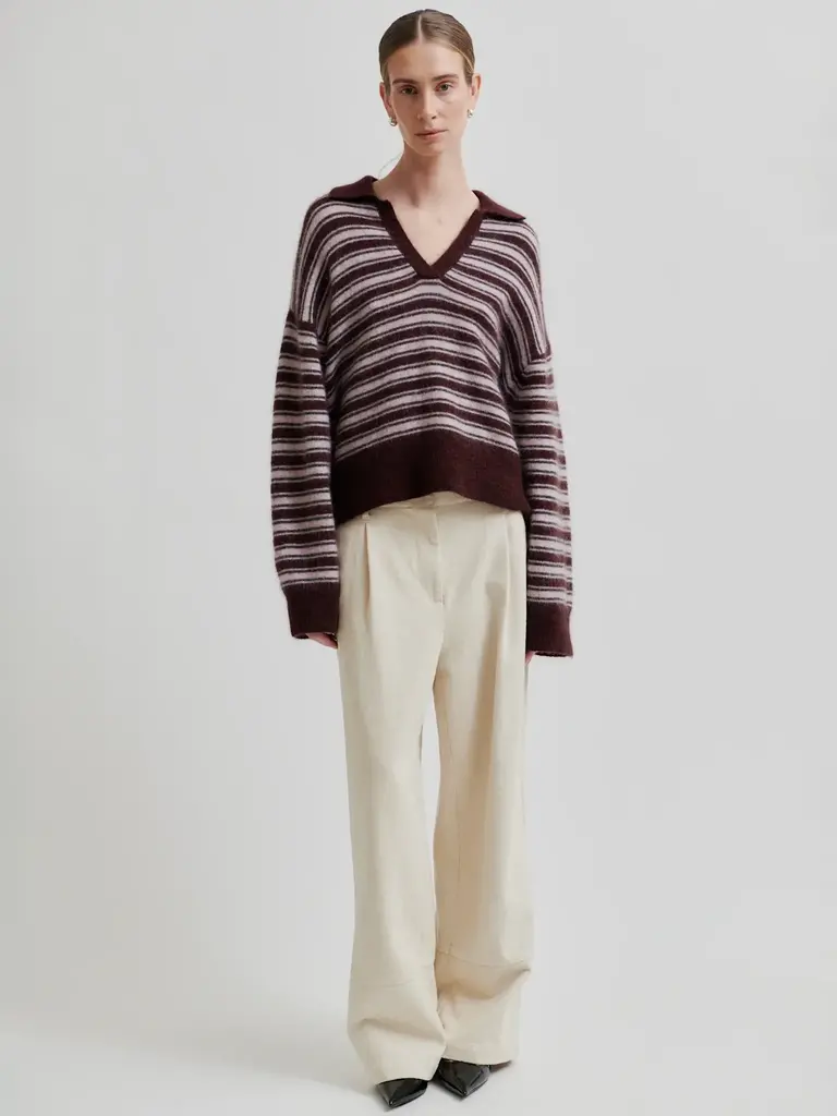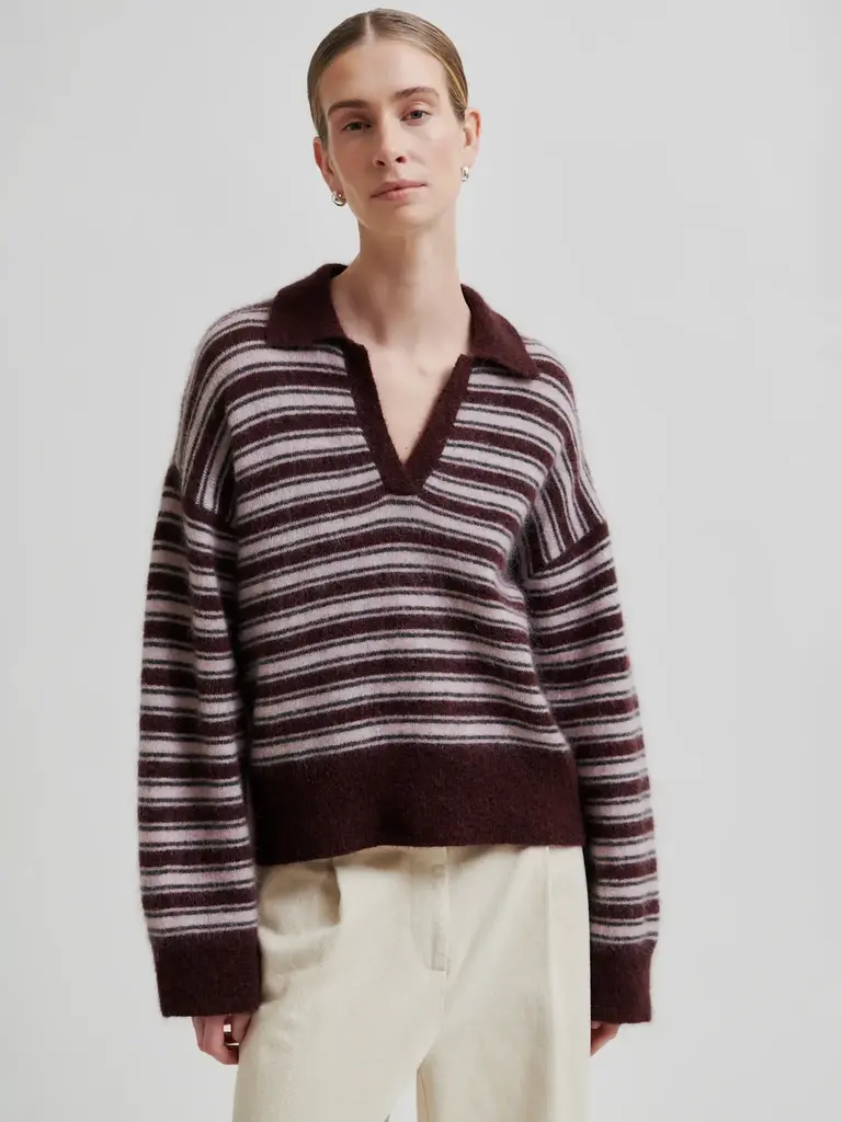 The Second Female striped sweater is made from a soft, stretchy mohair-wool blend with a slightly fluffy texture. It features a V-neck, dropped shoulders, and long sleeves, giving it a relaxed and comfortable fit.