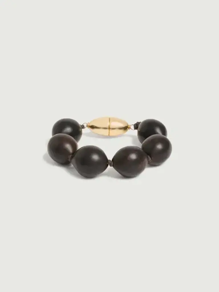 ZEPHYR is a bracelet from Soeur's GRAINE line. Its pearl design is reminiscent of an organic seed. Its gold-tone clasp is magnetized. Made in resin, the wood-brown color may vary from one piece to another.