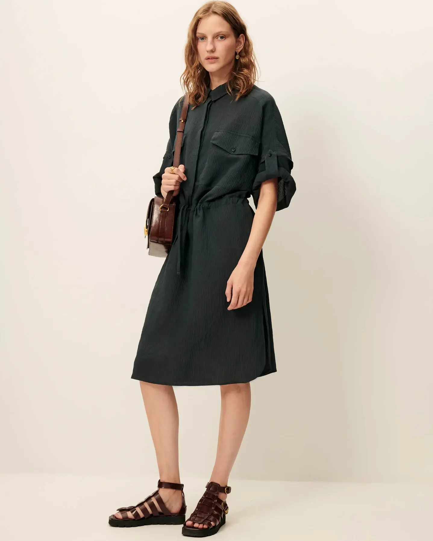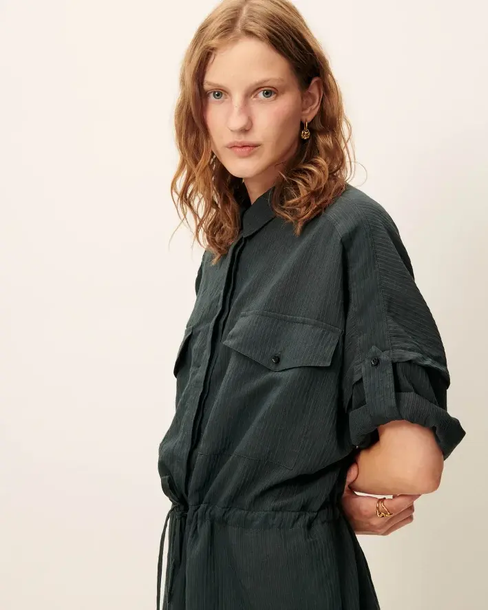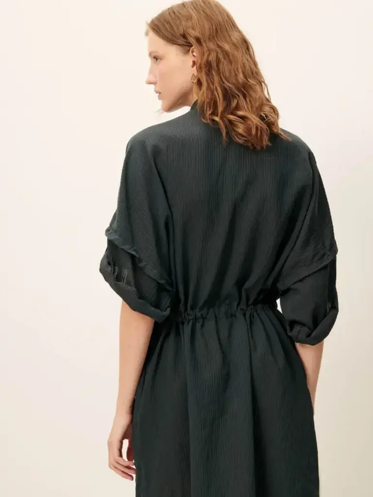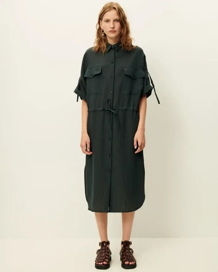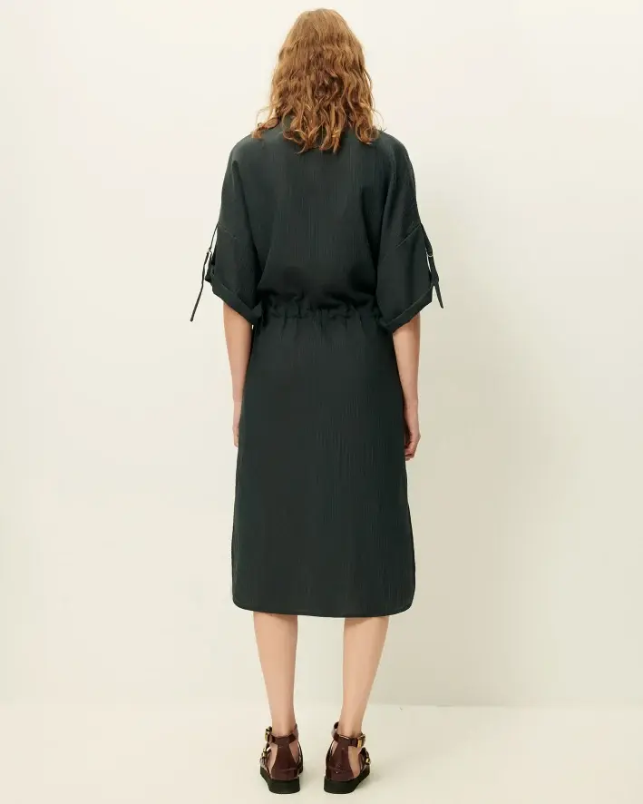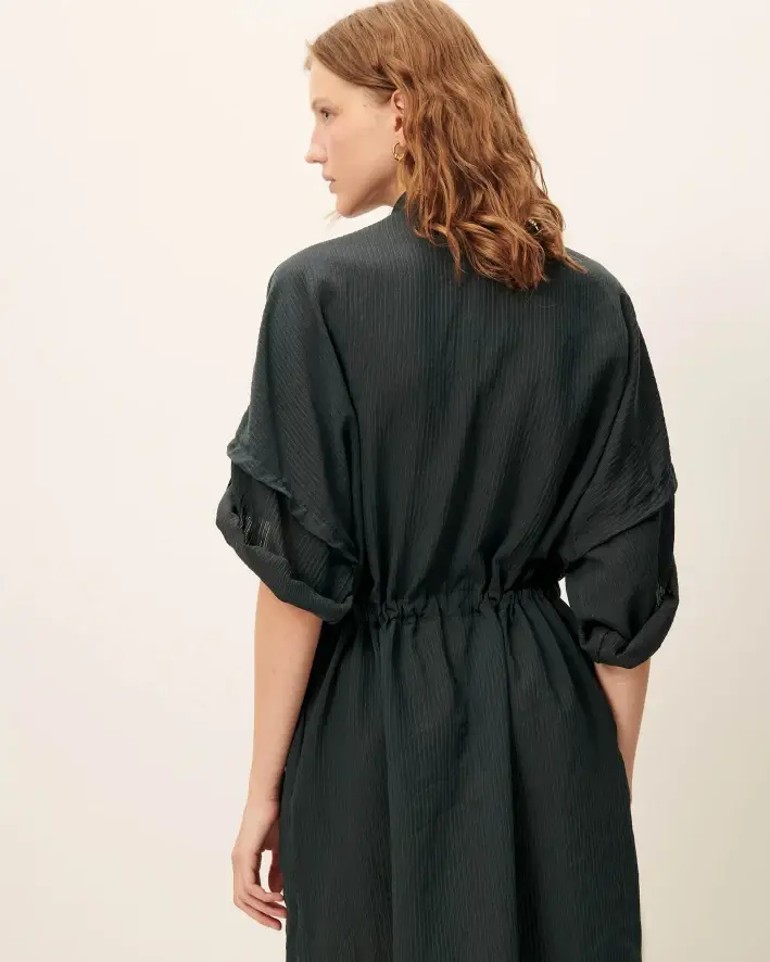 Robe chemisier à manches courtes en voile de viscose à rayures jacquard ton sur ton.