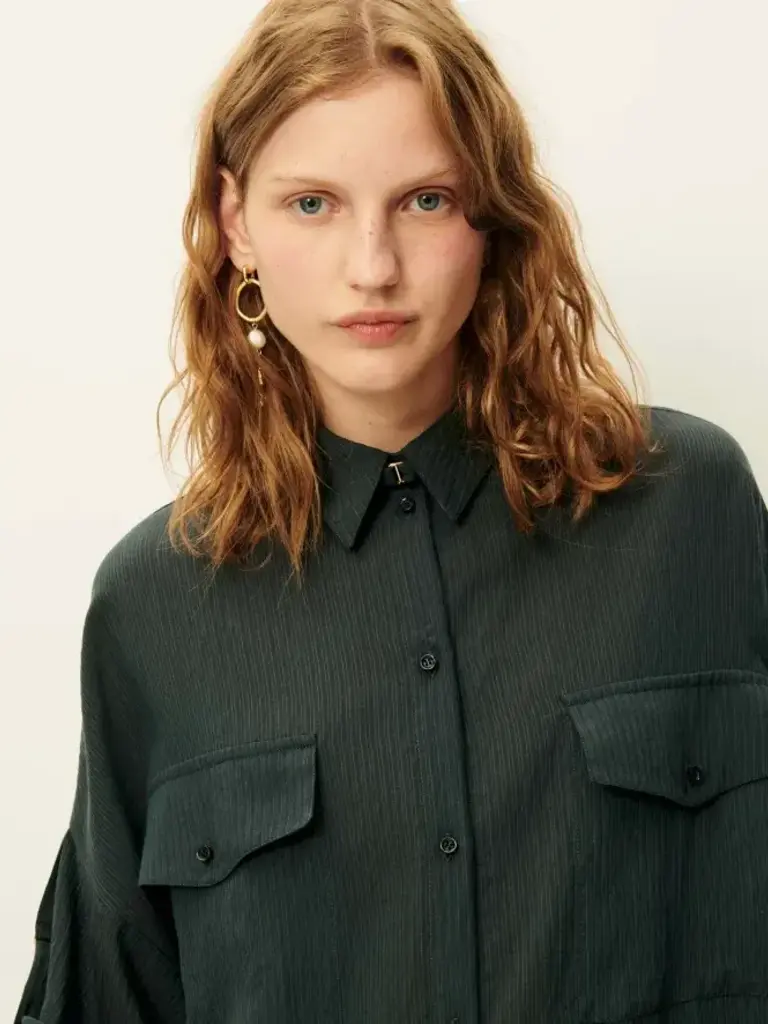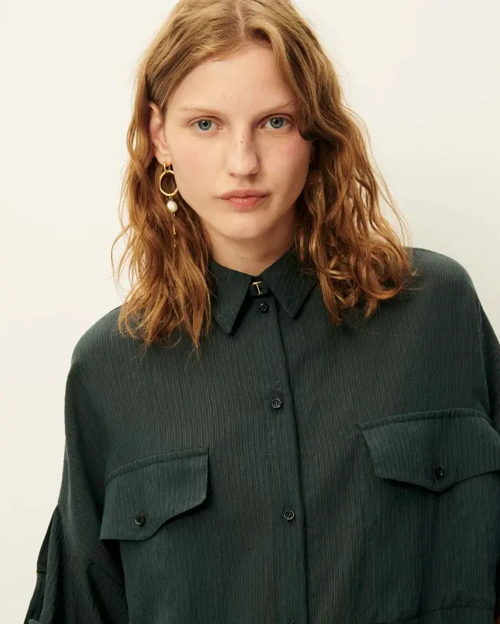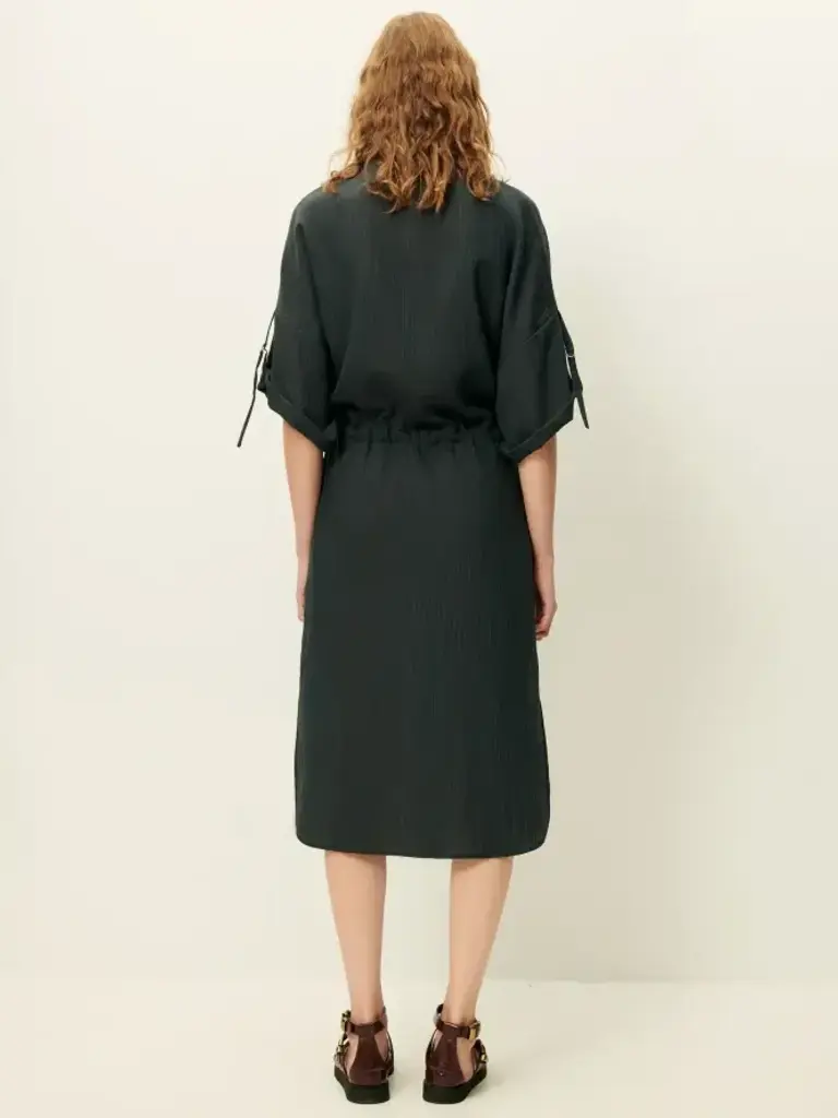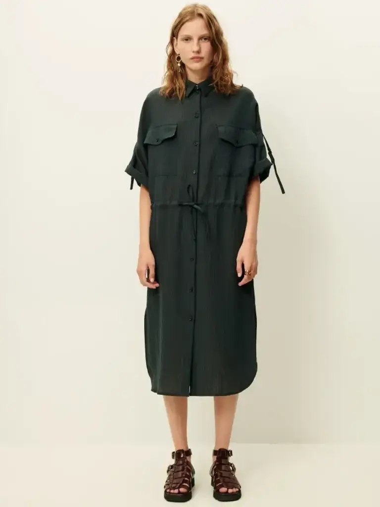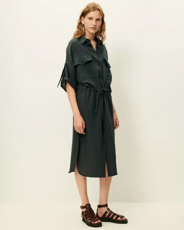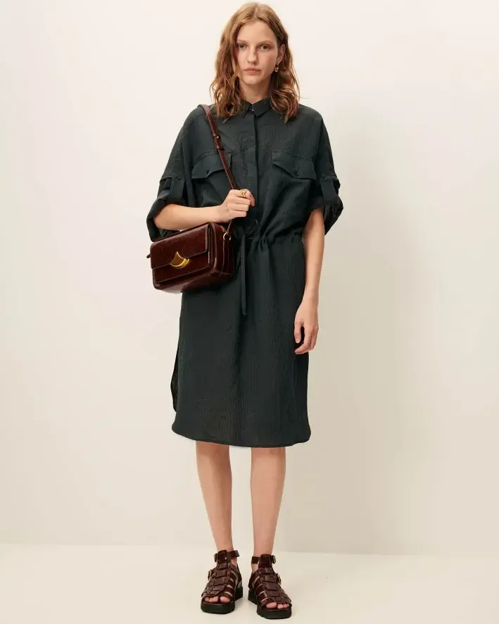 Robe chemisier à manches courtes en voile de viscose à rayures jacquard ton sur ton.