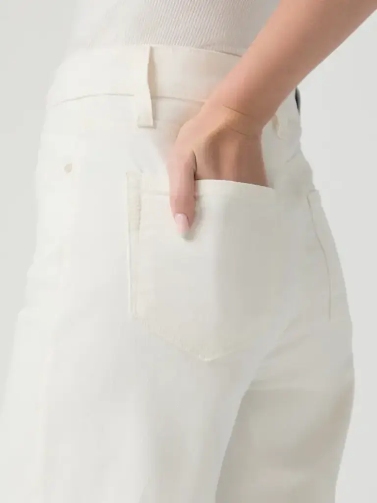 Ce pantalon présente une coupe légèrement ample et une longueur de 79 cm. Confectionné dans un denim écru ton sur ton extensible et confortable, avec des finitions écru ton sur ton assorties et un ourlet brut, ce modèle offre une bonne couverture et une élasticité parfaite.