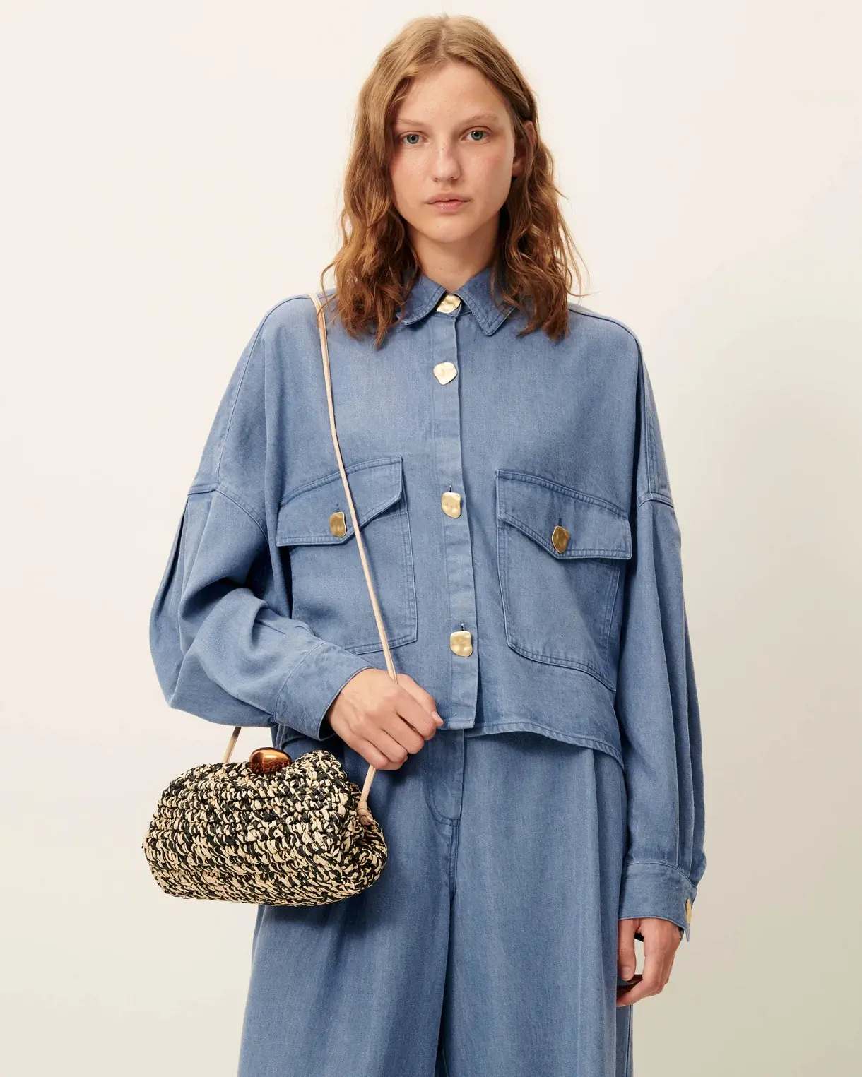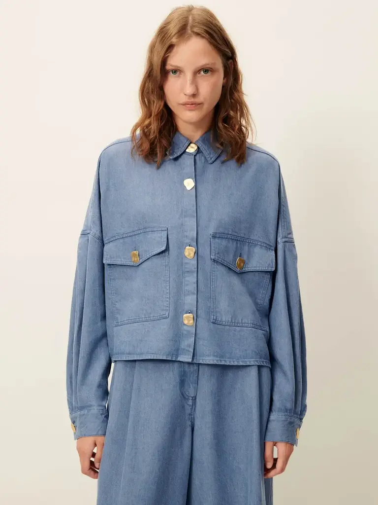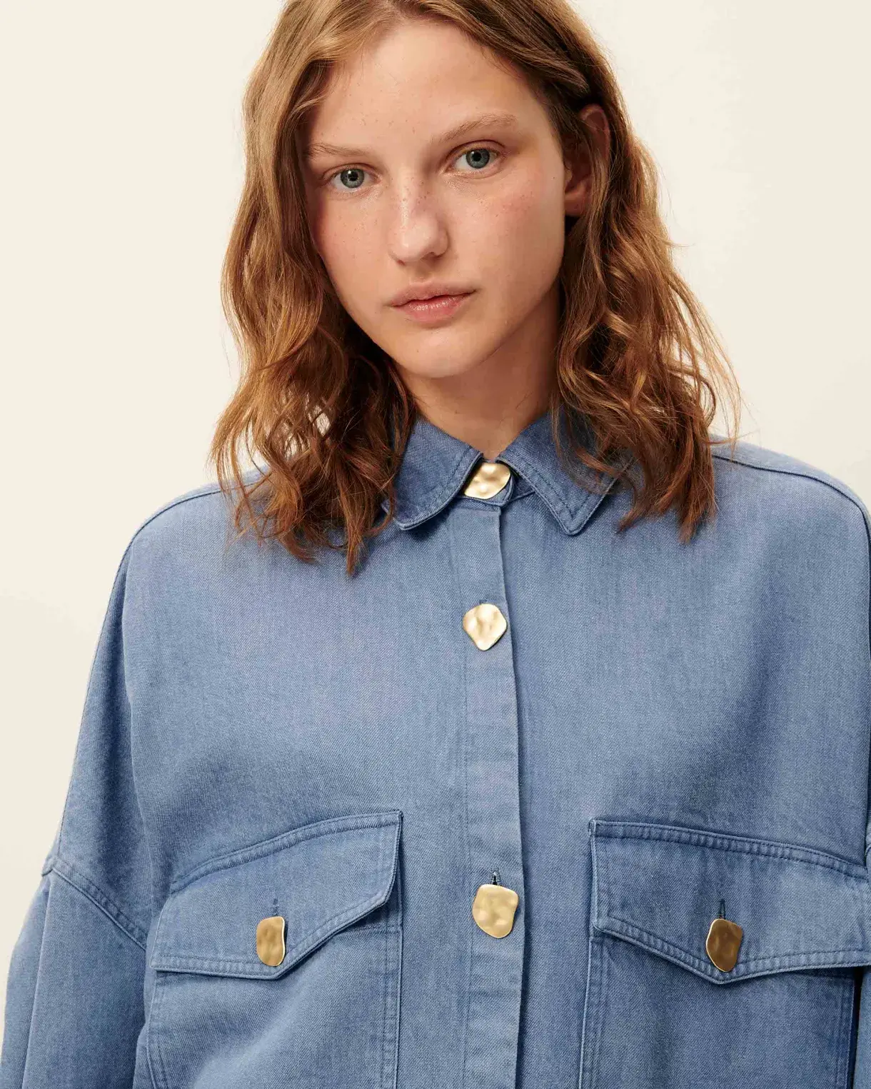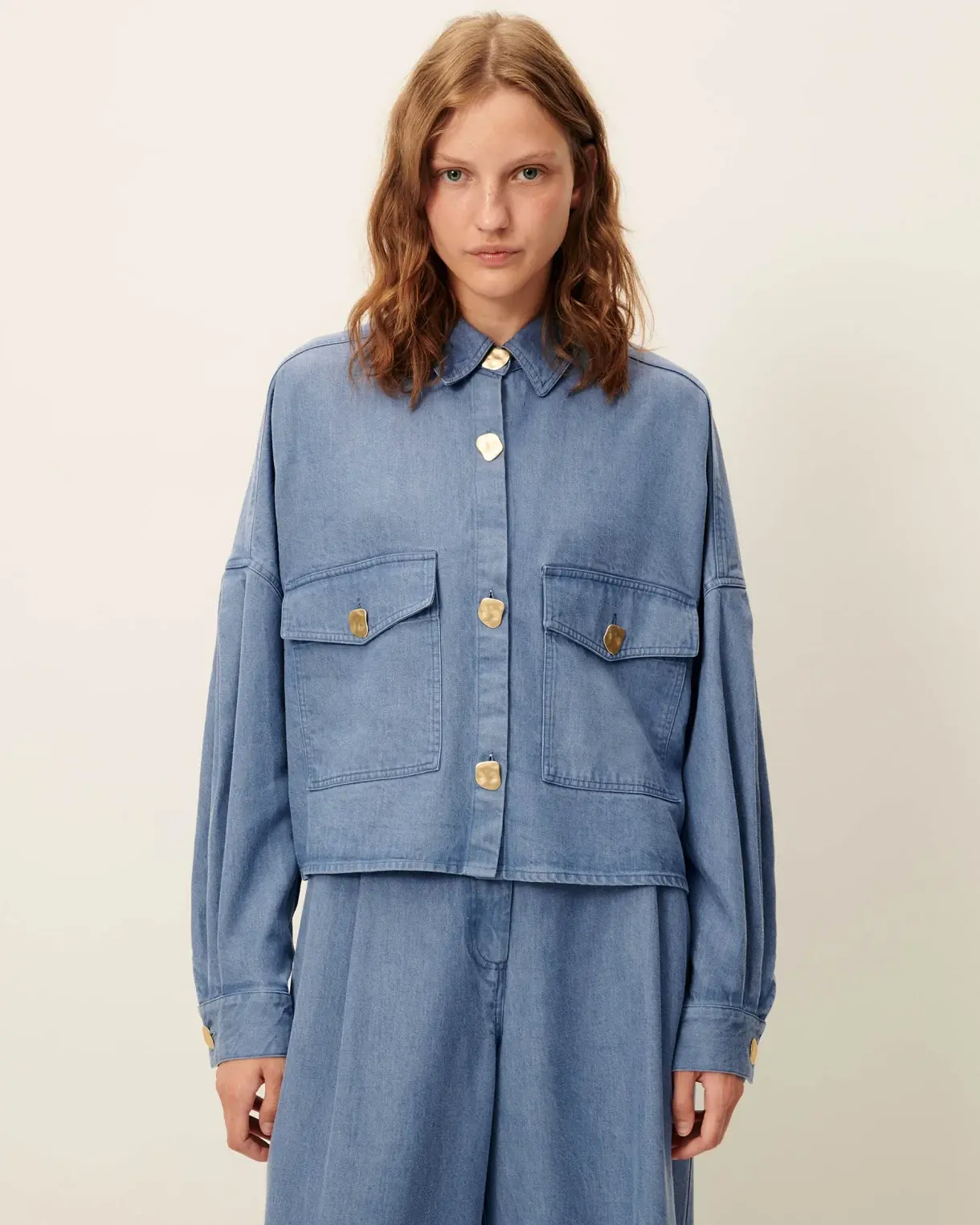 Chemise raccourcie à boutons bijoux et poches plaquées en denim souple de lyocell à fils indigo délavé, tissé en Espagne.