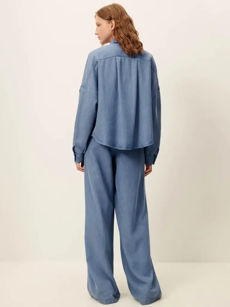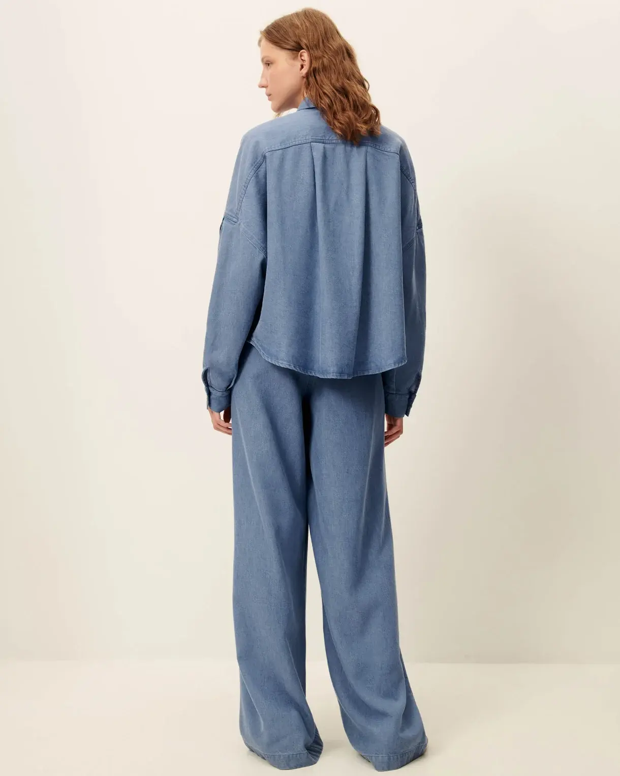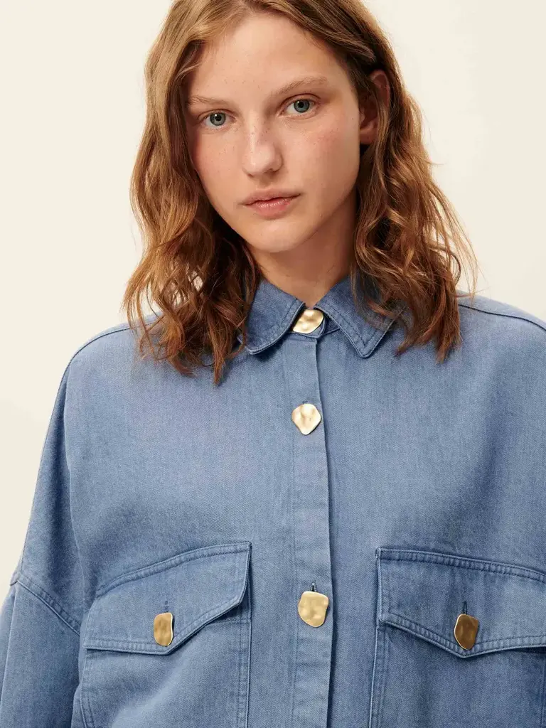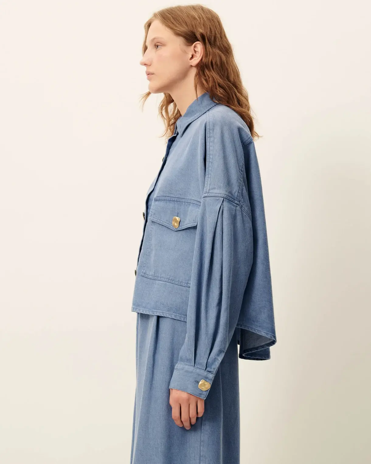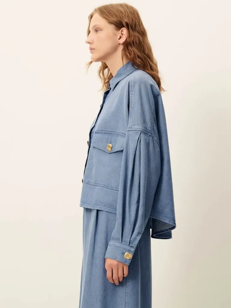 Chemise raccourcie à boutons bijoux et poches plaquées en denim souple de lyocell à fils indigo délavé, tissé en Espagne.