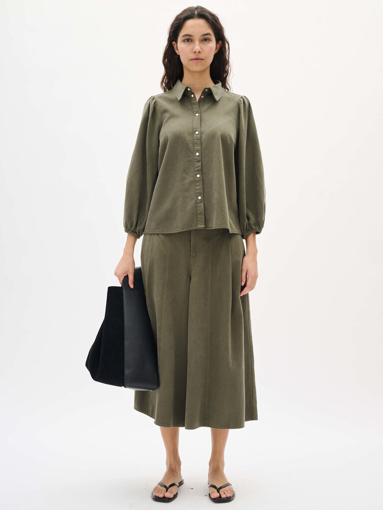 Sa coupe est légèrement ample, les épaules sont froncées et le bas des manches est resserré par un élastique. Sa couleur est un vert kaki, doux et facile à assortir.