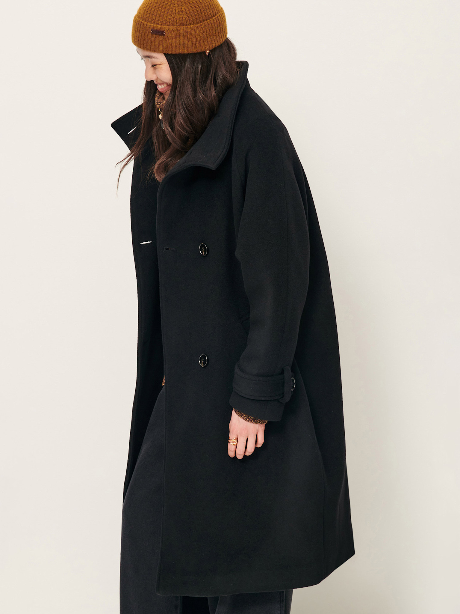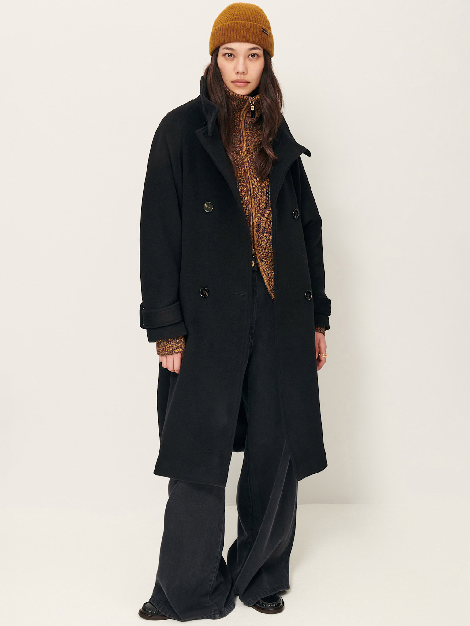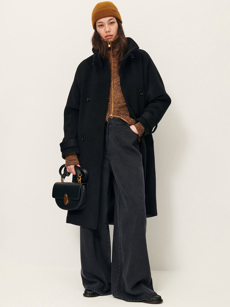Le manteau noir Sessùn présente une coupe longue à double boutonnage. Son col montant permet de varier les styles, qu'il soit ouvert ou fermé. La laine, gardant efficacement au chaud, est aussi recyclée et certifiée GRS, ce qui réduit son impact environnemental et contribue à une approche plus large de la conservation des ressources.