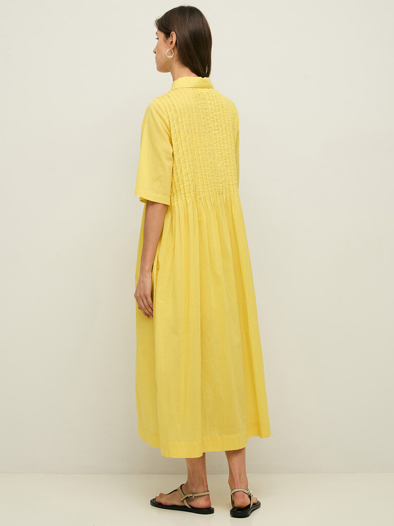Robe midi jaune. Coton biologique. Coupe oversize. Col classique et fermeture à boutons sur le devant. Plis creux sur la poitrine. Jupe ample. Deux poches latérales. Fentes latérales. Doublure. Longueur à partir de l'épaule : 128 cm (taille S).