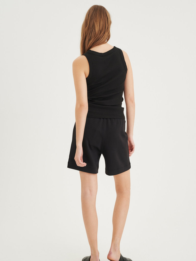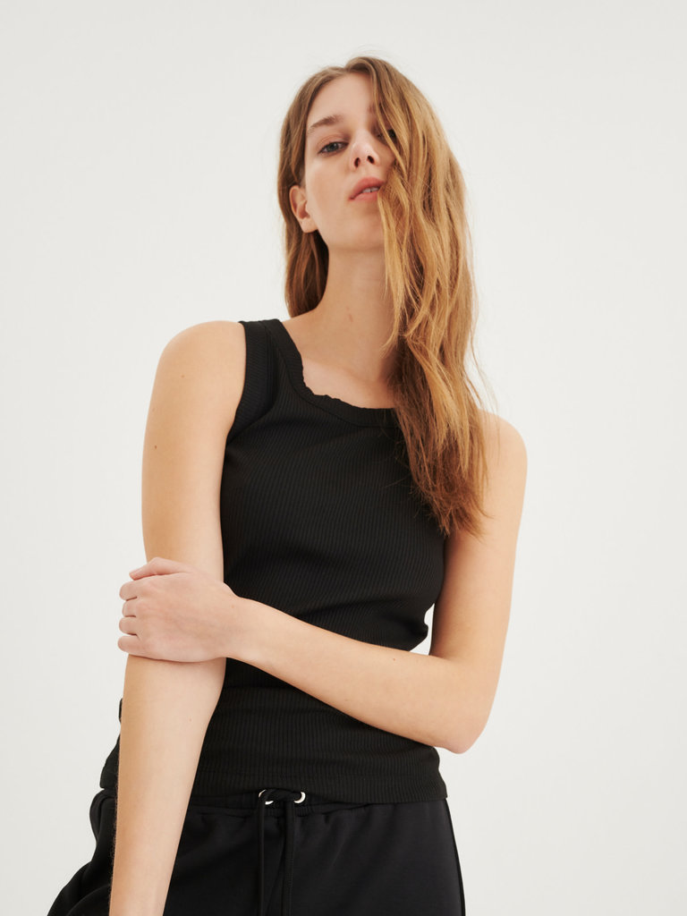 Le Dagna tank black est une camisole épurée fabriquée à partir d’un mélange de coton côtelé ferme. Un basique minimaliste qui s’intègre parfaitement dans votre garde-robe d'essentiels.