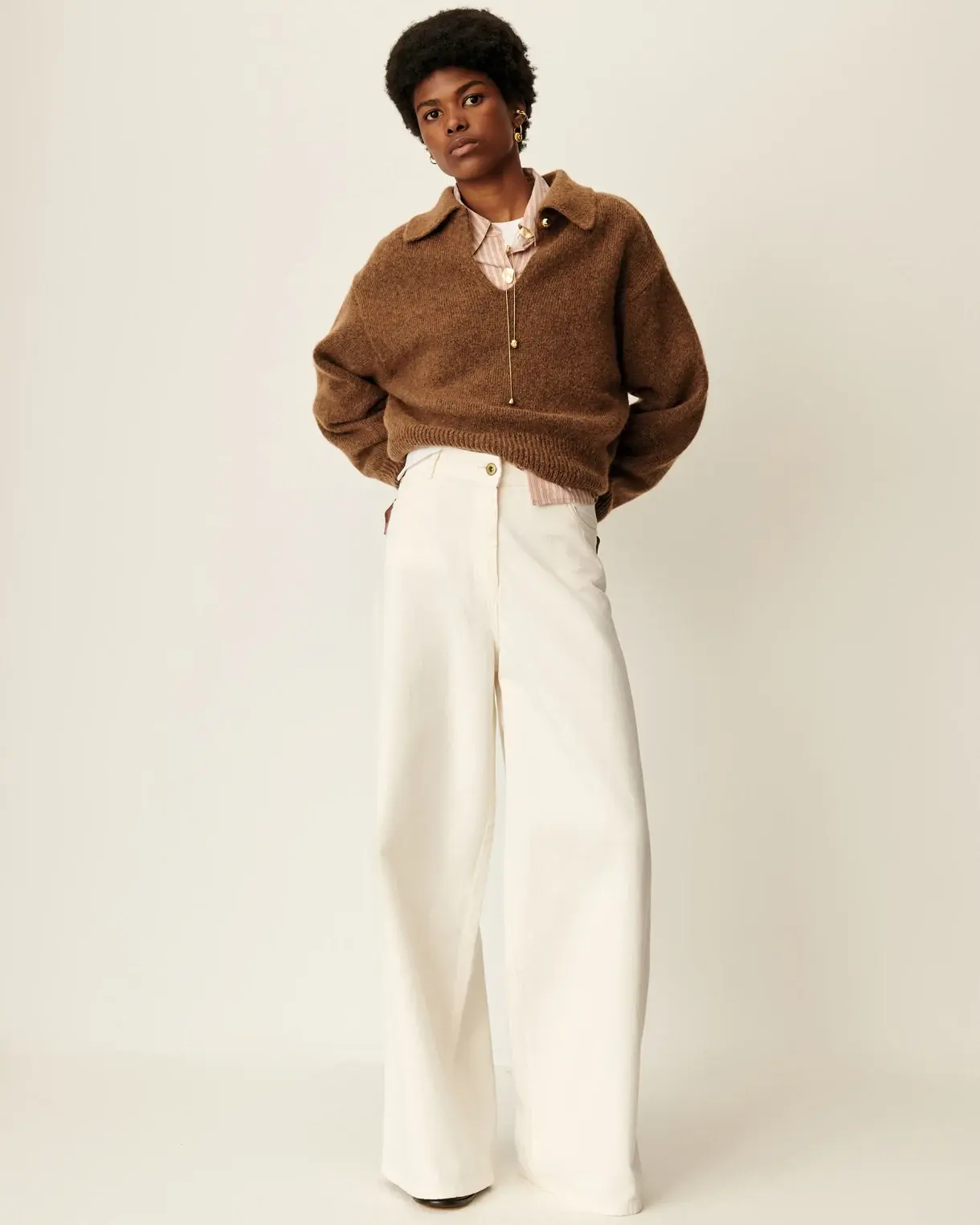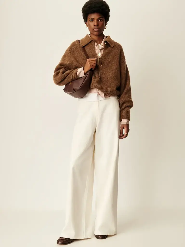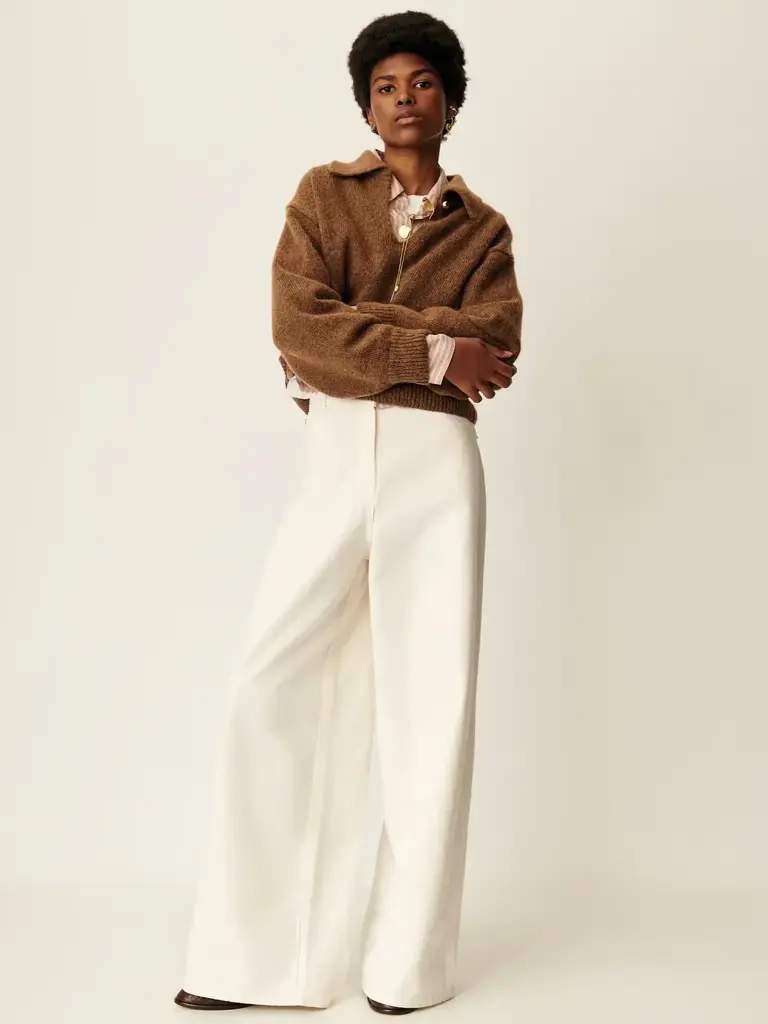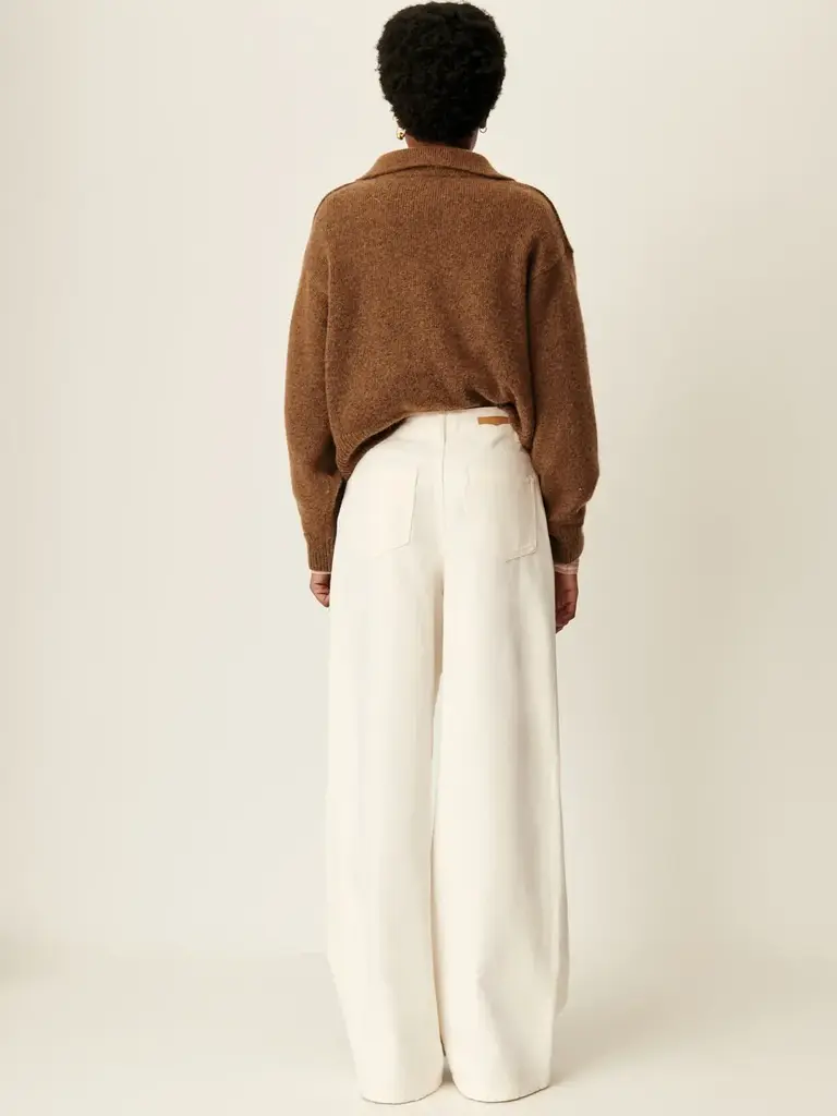 Jean ample taille très haute, jambes légèrement évasées, en gabardine teinte en plongée tissée en Espagne.