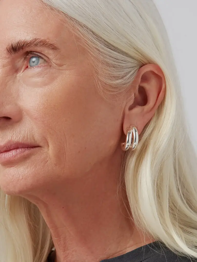 Découvrez nos boucles d'oreilles les plus populaires. Dramatique et volumineux, ce modèle personnalisé crée l'illusion de deux anneaux massifs empilés l'un sur l'autre, avec un disque plat à l'arrière pour un soutien supplémentaire. Finition en argent poli.