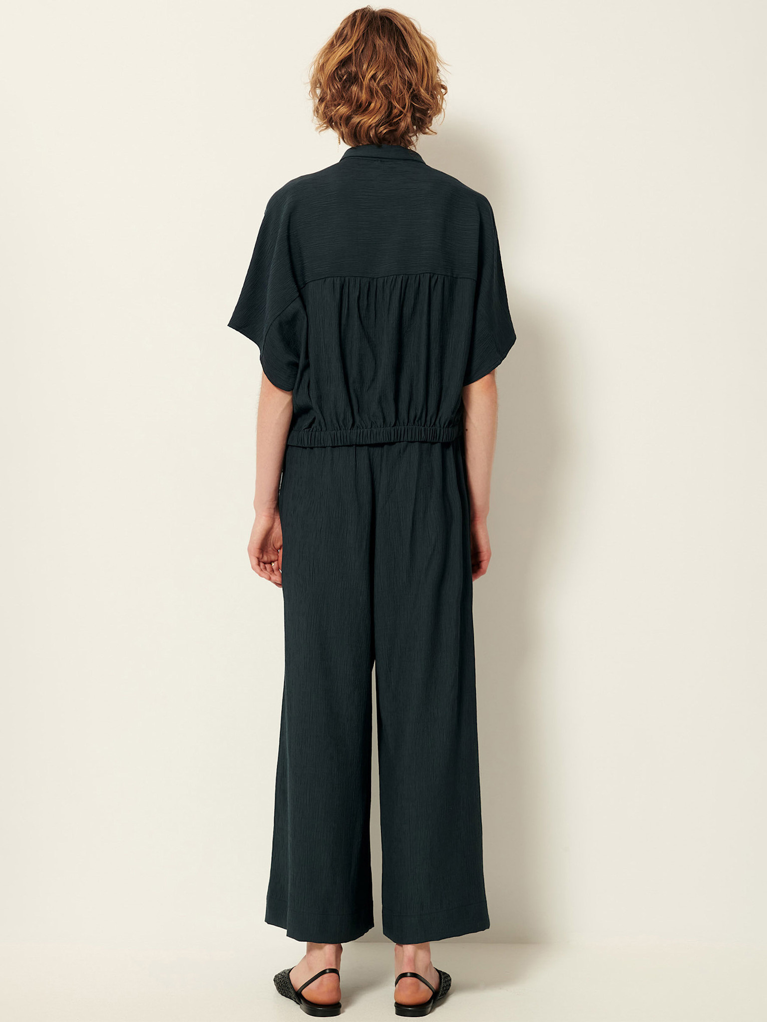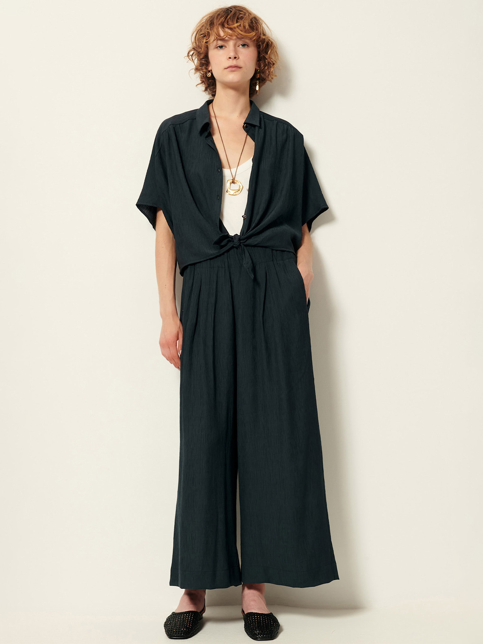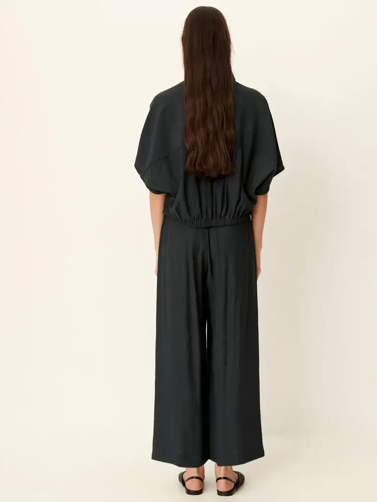 Pantalon 7/8ème ample à taille élastiquée en satin fluide de viscose.