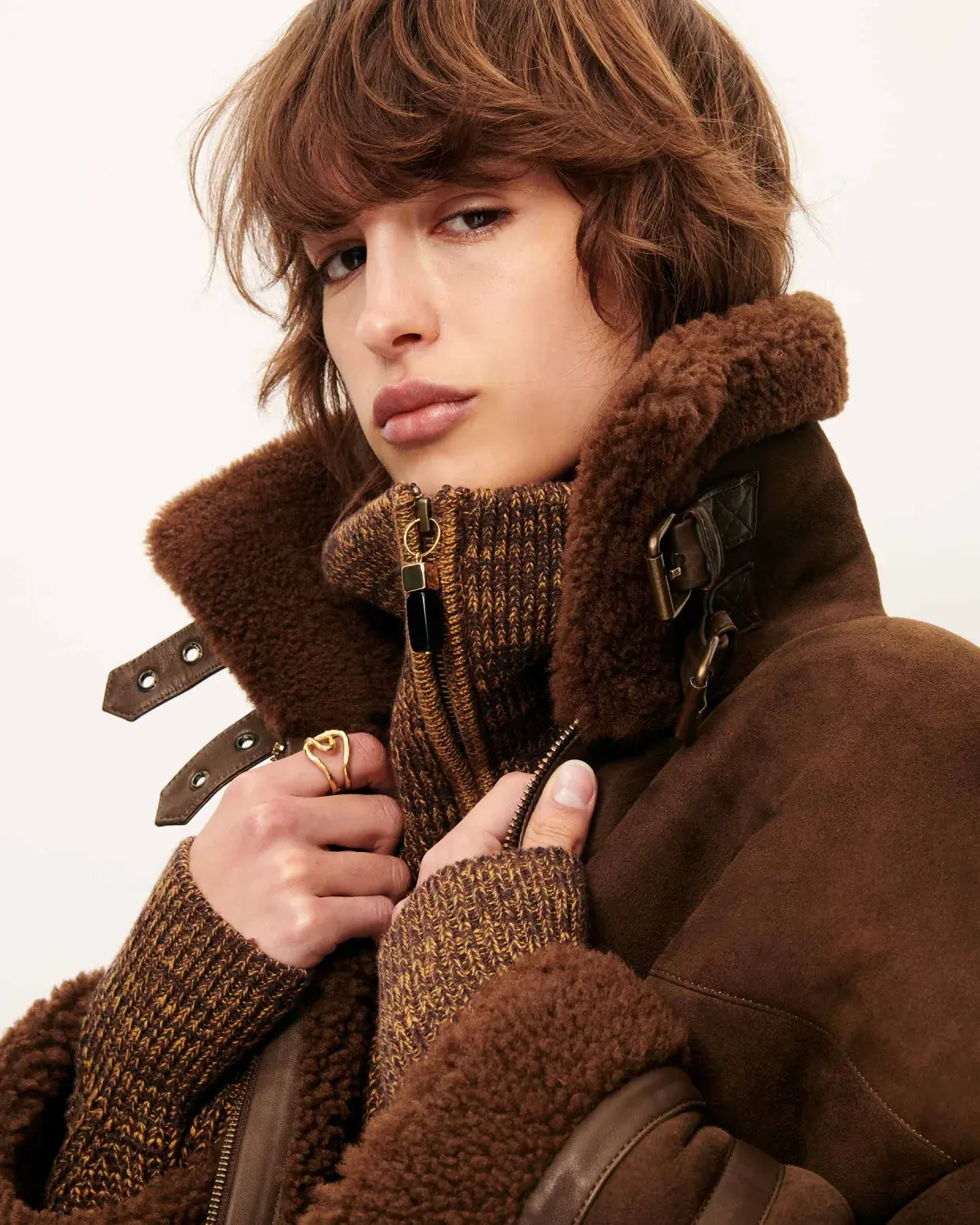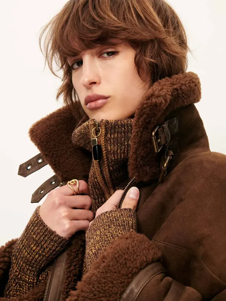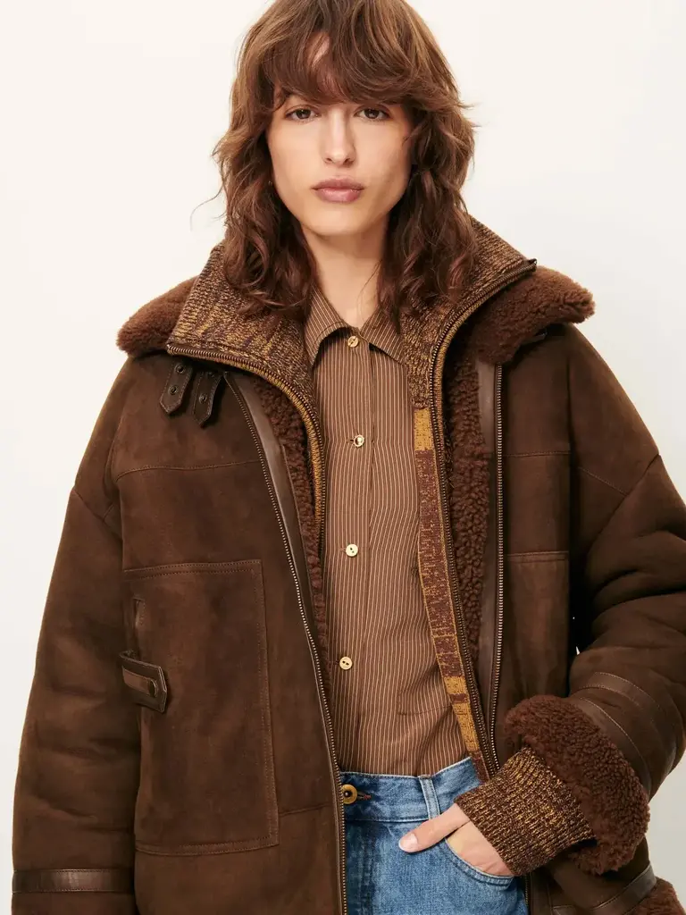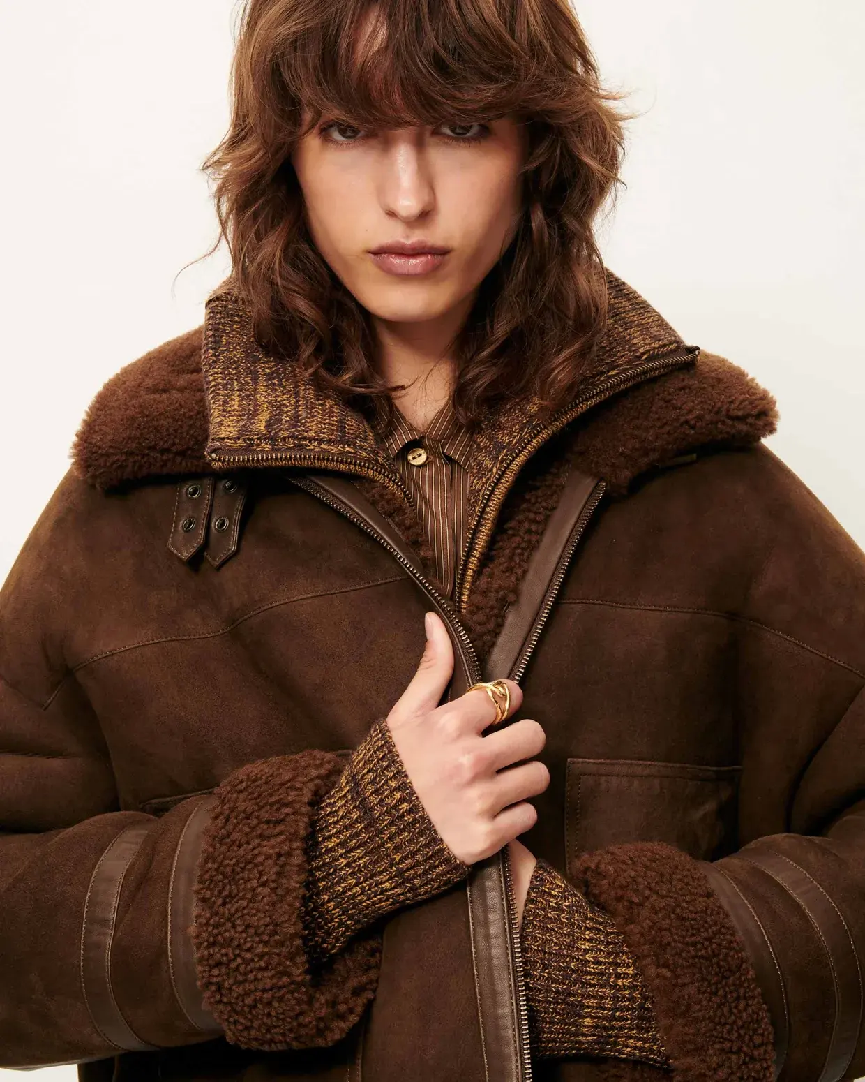 Manteau aviateur en peau lainée de mouton brun de la marque Sessùn.