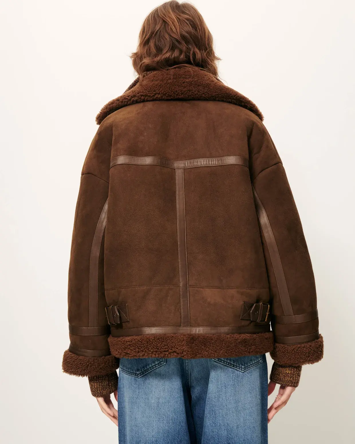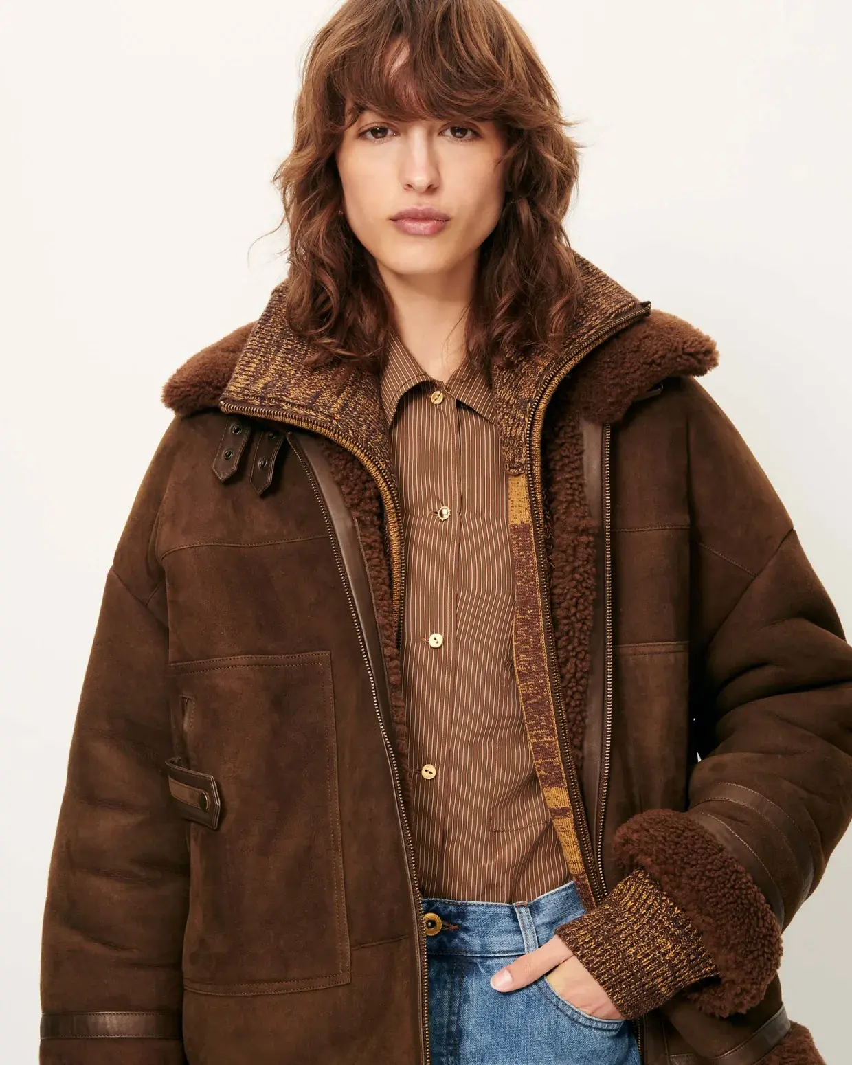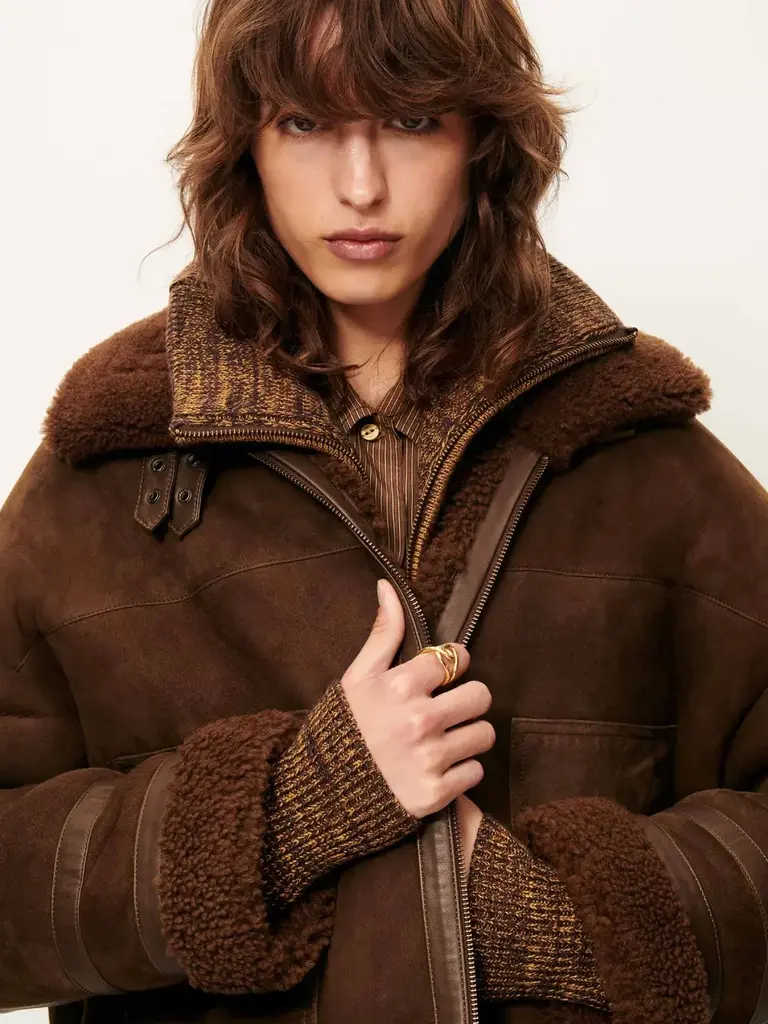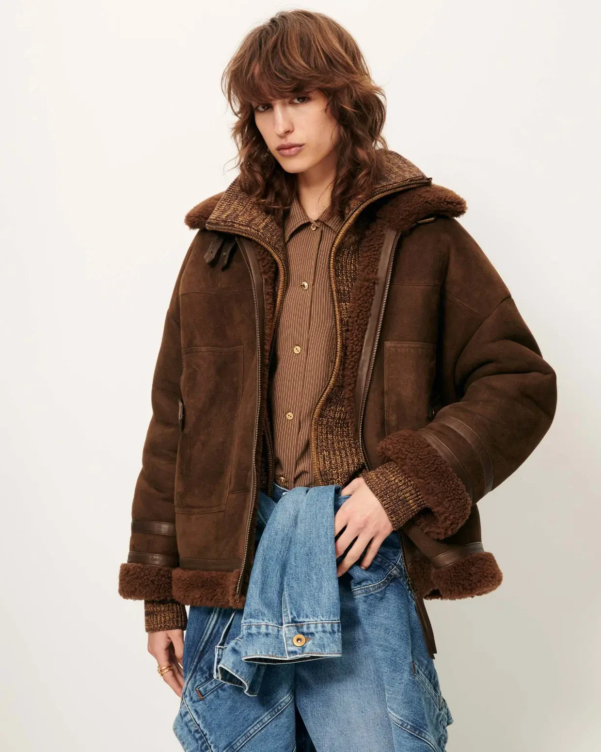 Manteau aviateur en peau lainée de mouton brun de la marque Sessùn.
