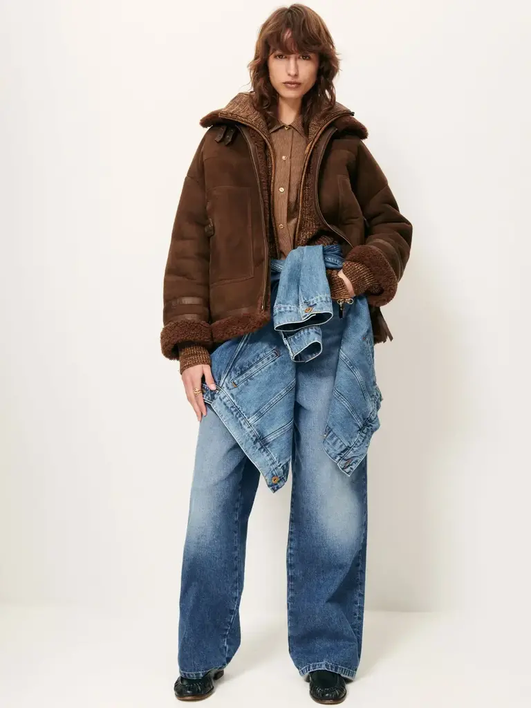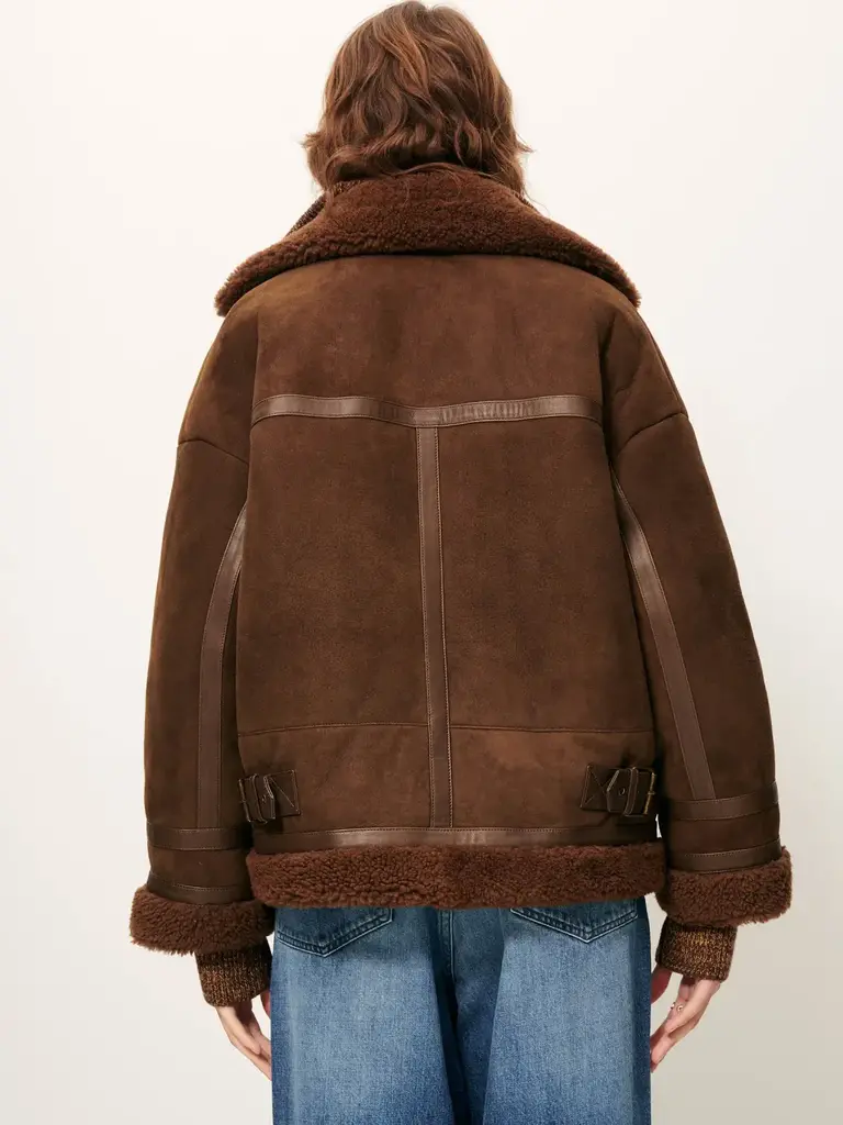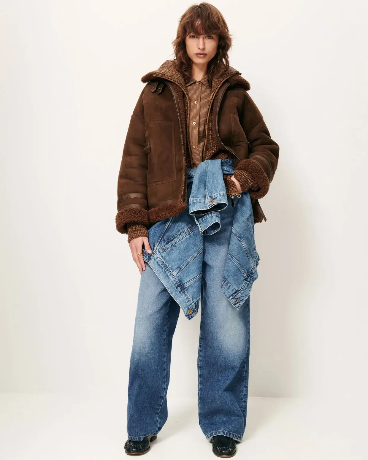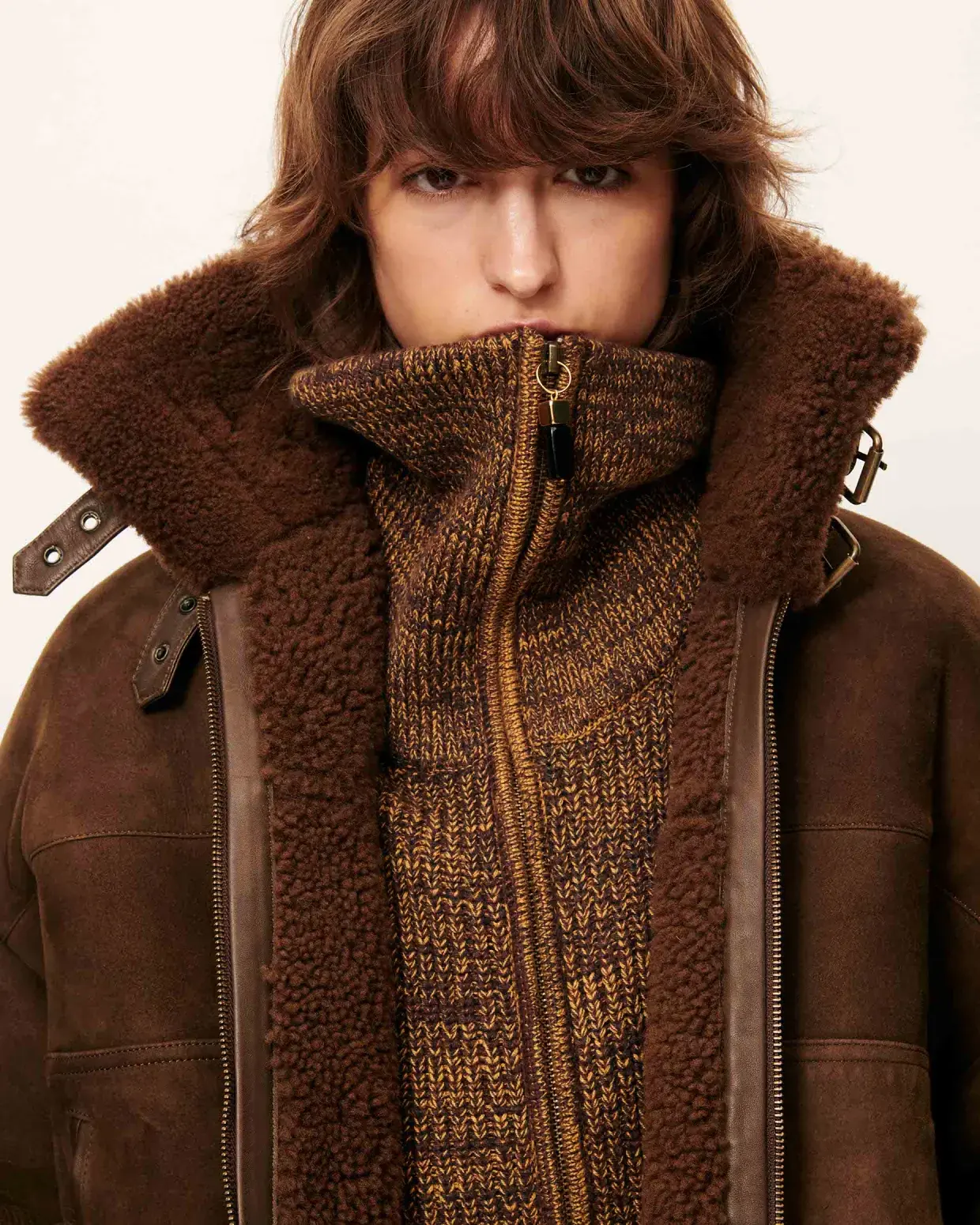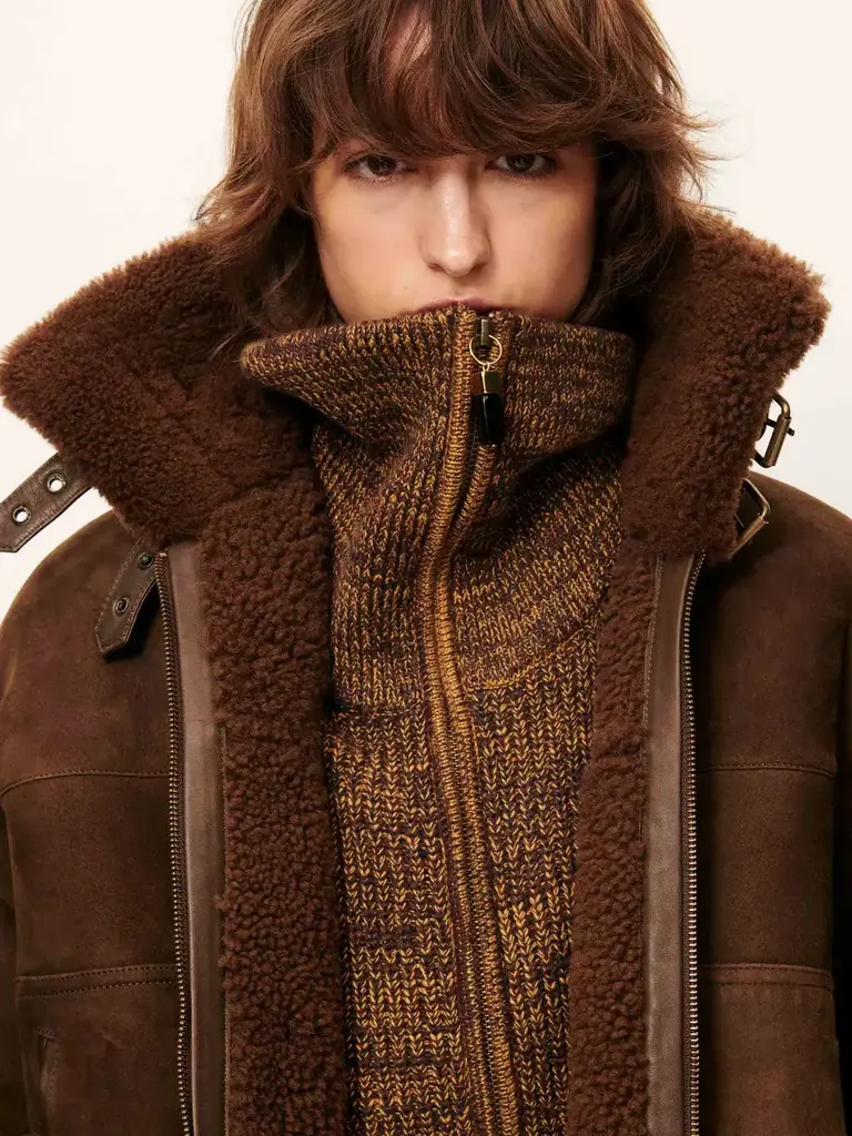 Manteau aviateur en peau lainée de mouton brun de la marque Sessùn.