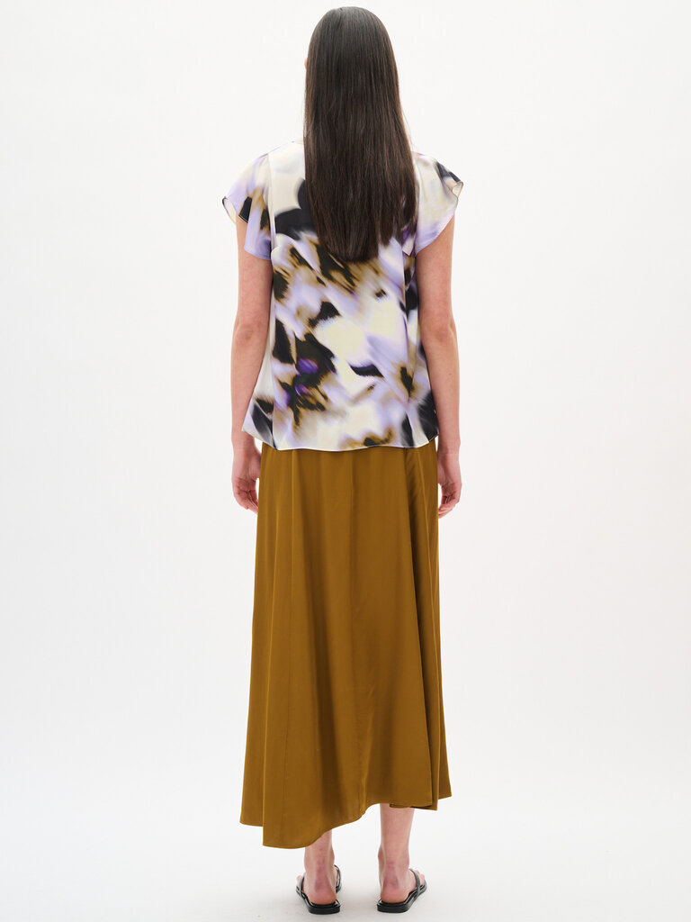 La jupe Kayla d'Inwear est une jupe fluide en satin avec une légère asymétrie à la taille. La fente mesure environ 40 cm de long. Cela donne une belle ouverture sans dévoiler la jambe.