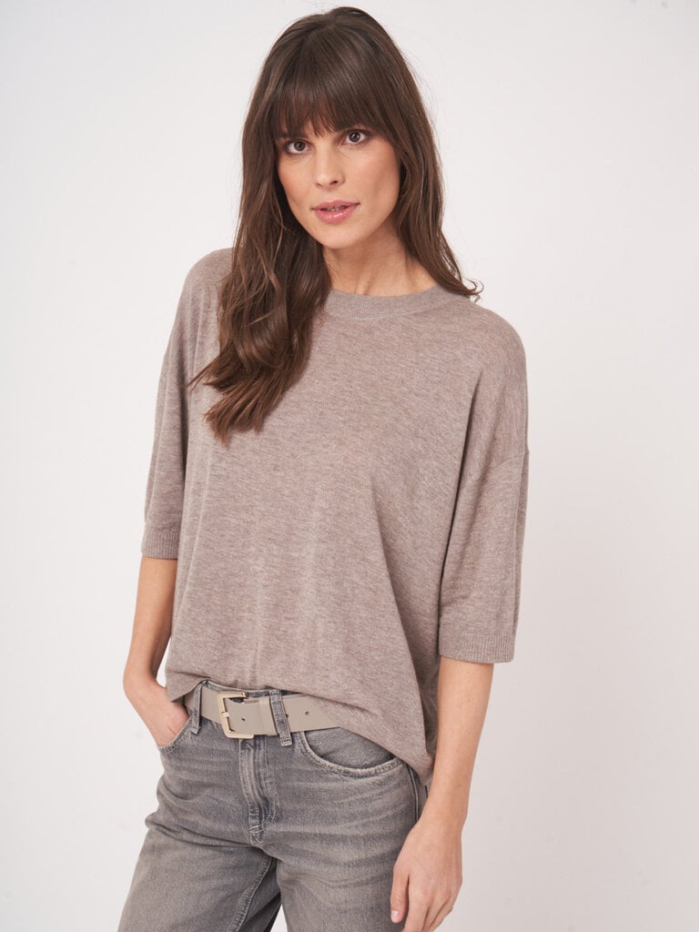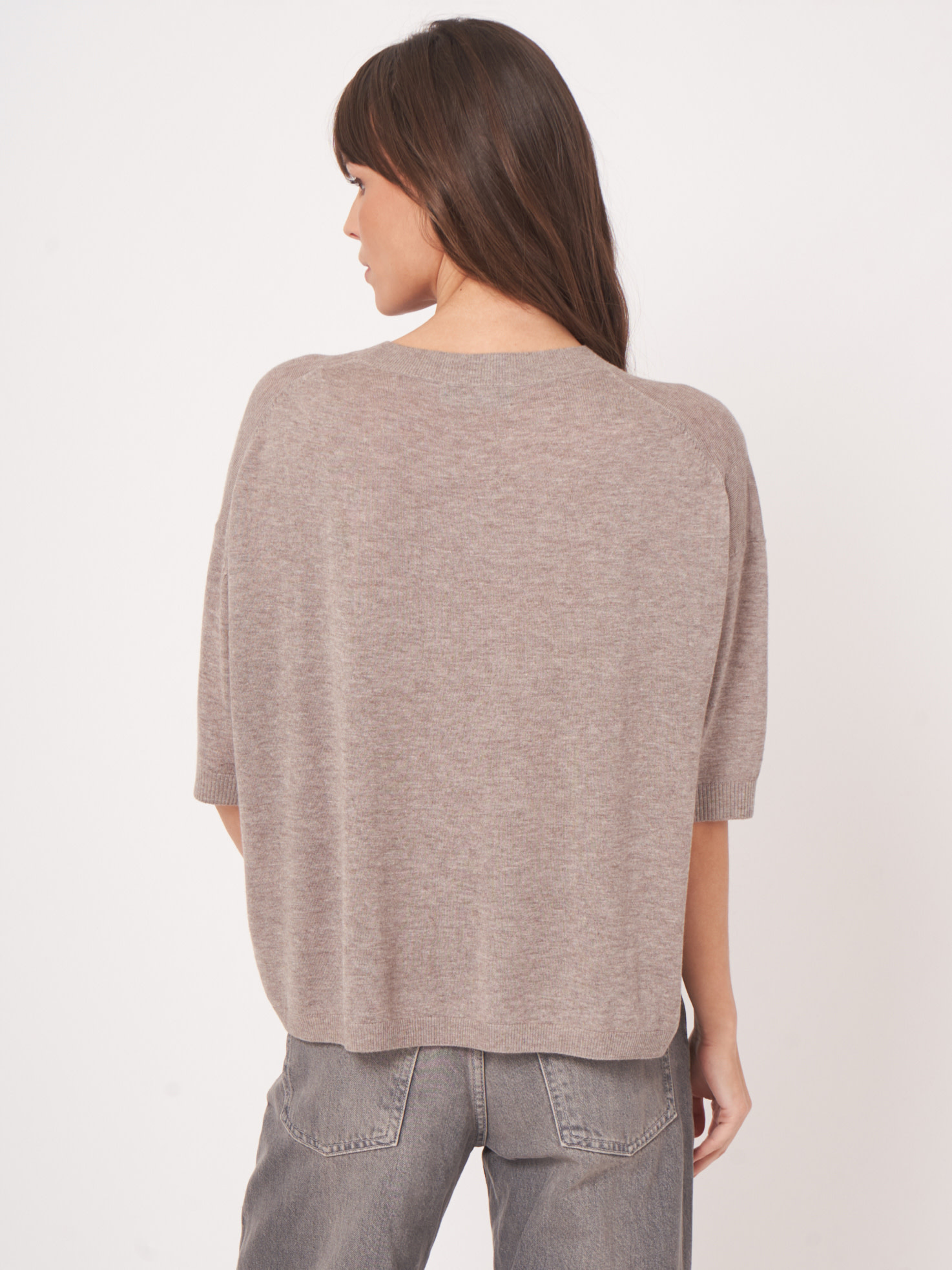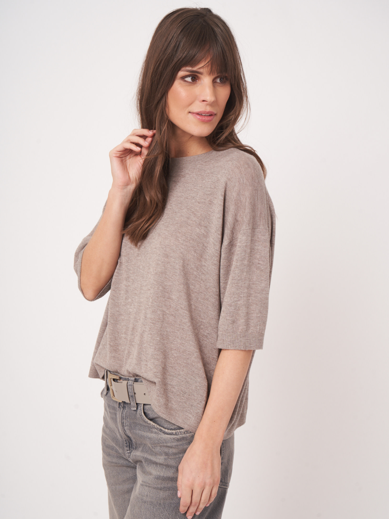 Le pull 300465 de REPEAT est un véritable réconfort lorsqu'on le porte. Ses mailles très fines et sa laine si douce rendent le vêtement léger et agréable au touché. Sa coupe carrée, ses manches courtes et ses ourlets côtelé lui procure un style moderne qui peut s'intégrer aisément à votre garde-robe. Une version avec des manches longues est aussi disponible.