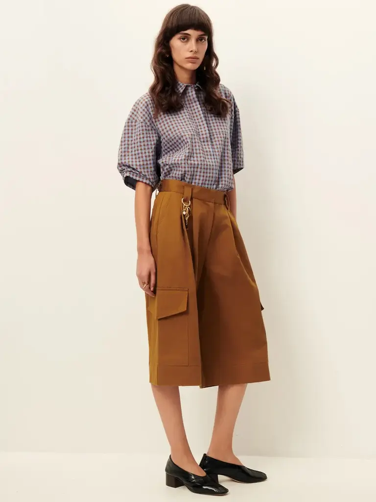 Bermuda cargo ample à plis en gabardine sergée compacte et souple tissée en Espagne.