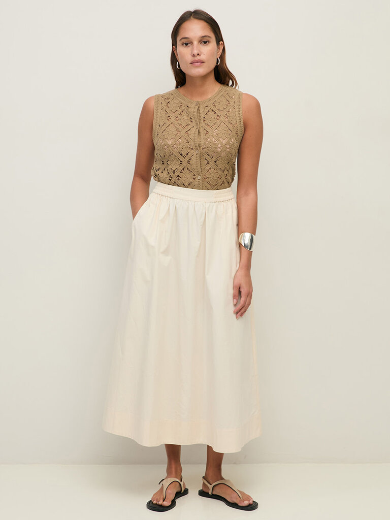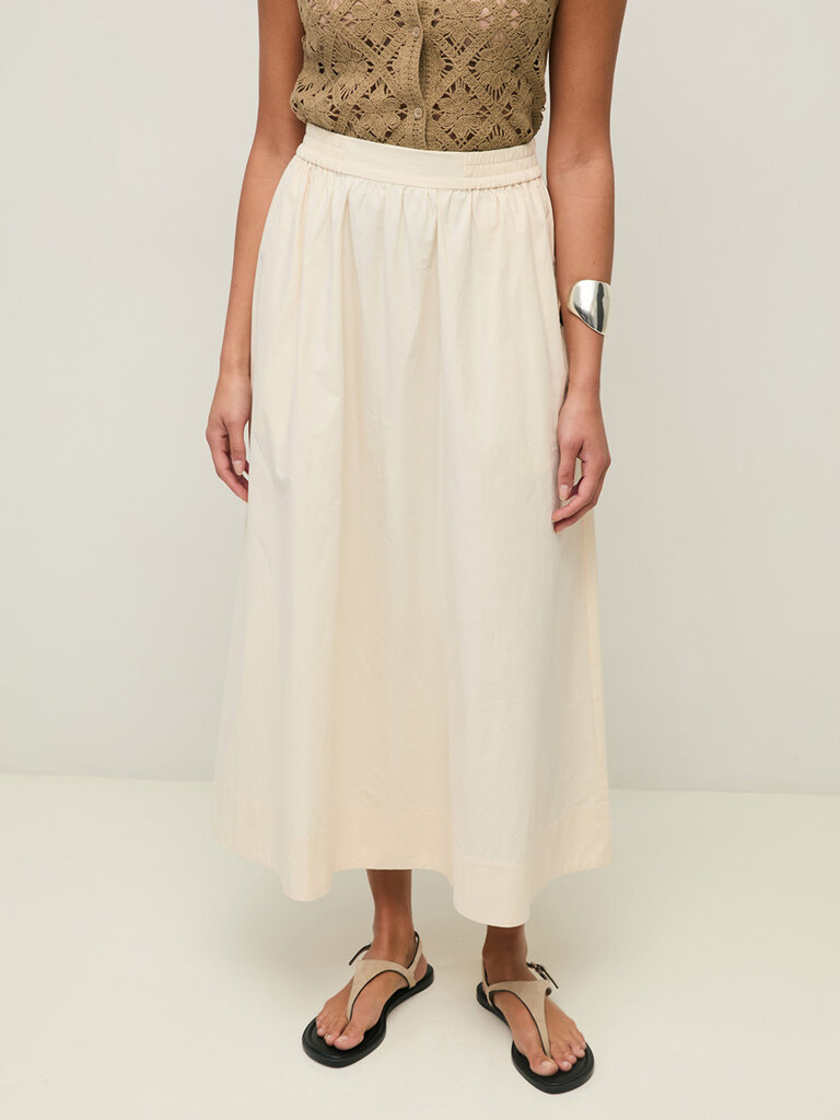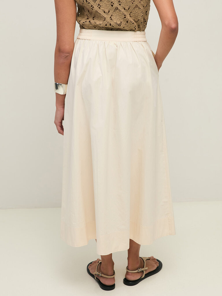 Jupe longue écru. Popeline de coton. Coupe droite. Taille sans fermeture et élastique sur les côtés. Deux poches latérales. Longueur : 91 cm (taille S).