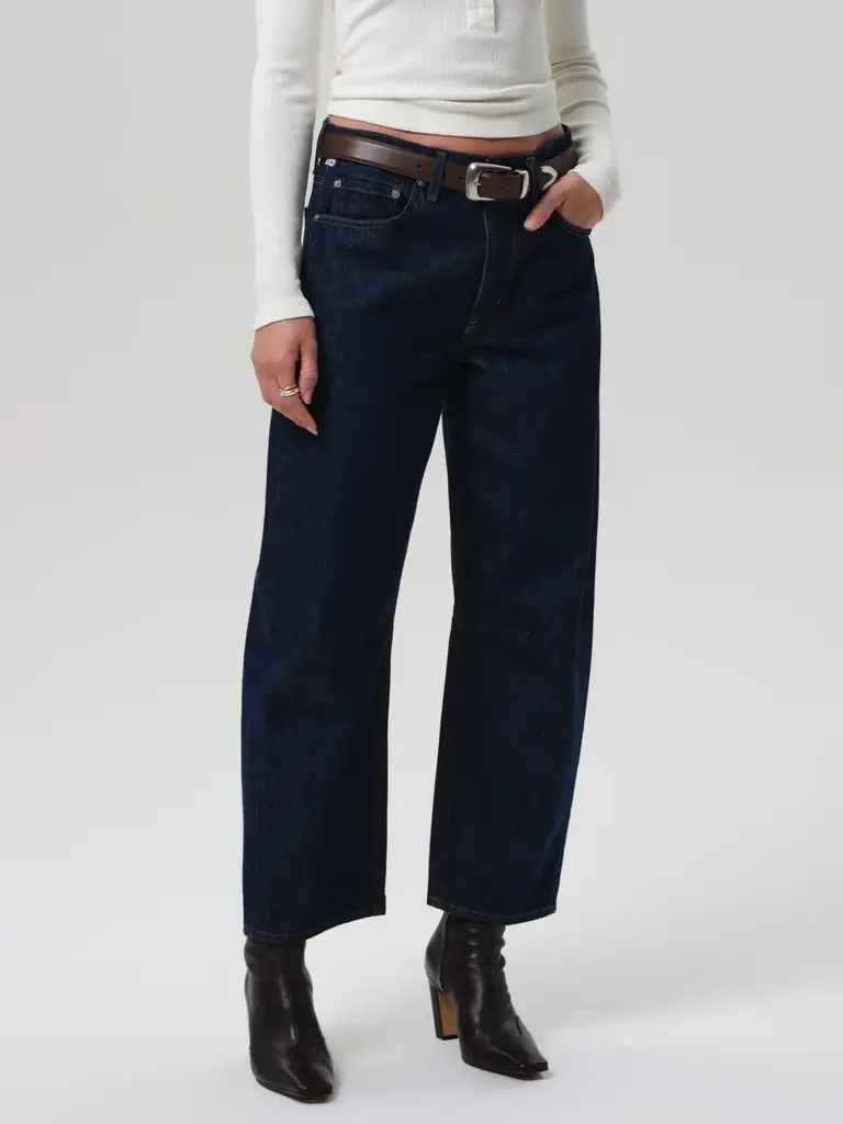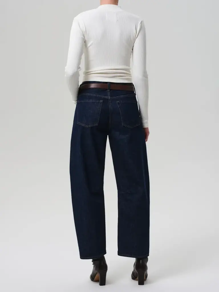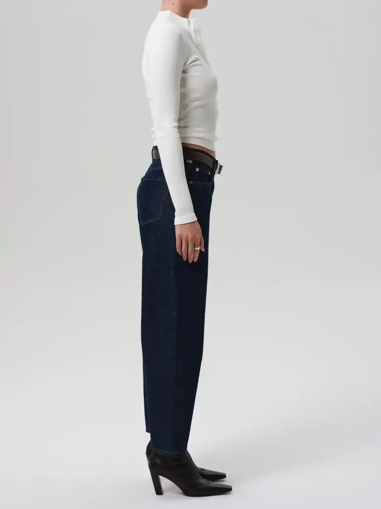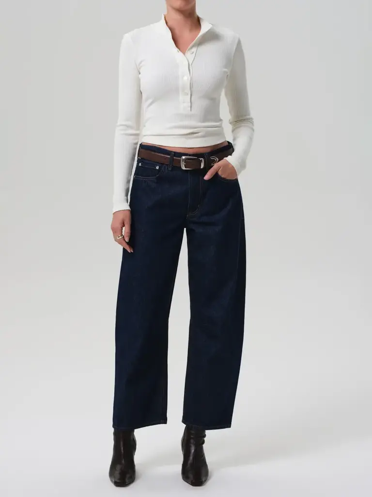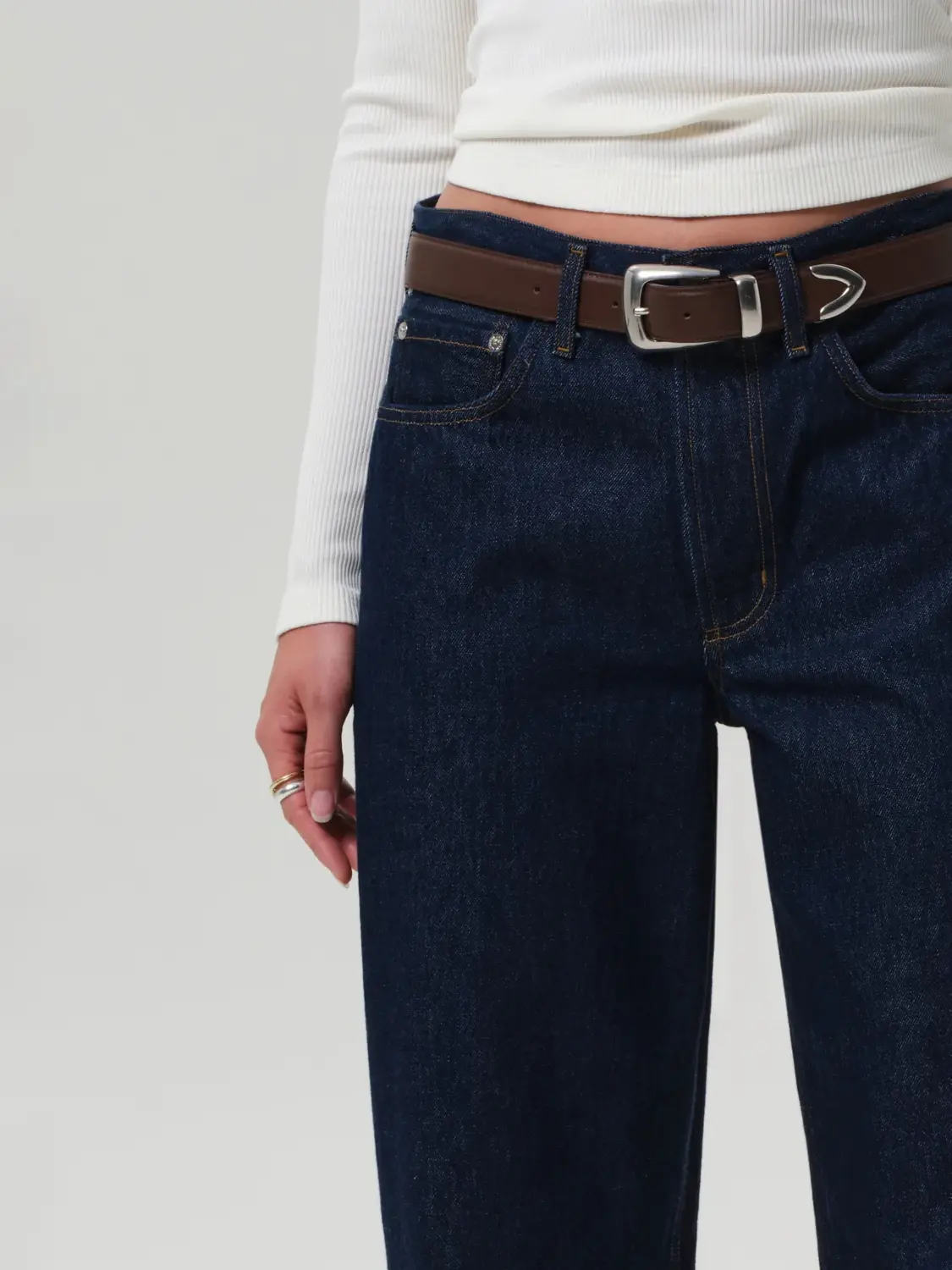 Le modèle « Miro » offre une version subtile de la silhouette barillet, conçue pour être portée taille haute avec une forme décontractée qui s'effile doucement vers la cheville. Confectionné en coton régénératif rigide au toucher doux, son délavage net lui confère un look à la fois classique et moderne. Il se marie facilement avec une chemise structurée ou un pull ample, et s'accorde avec toutes les chaussures.