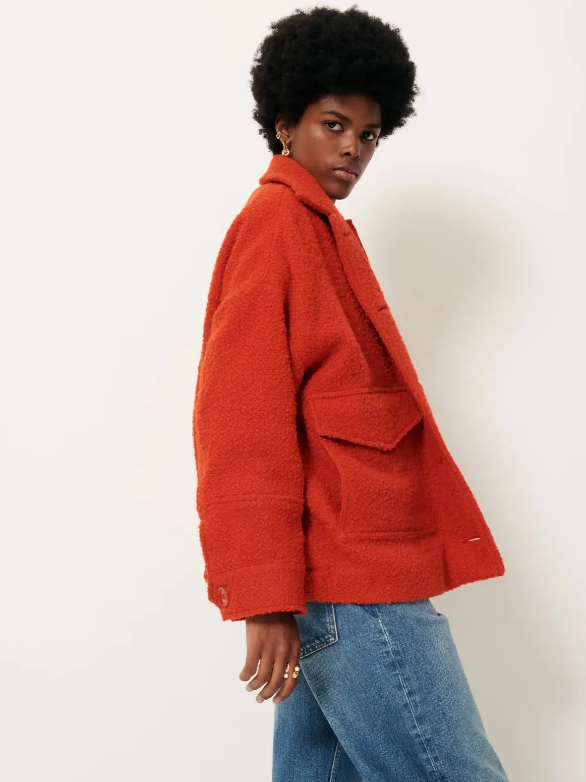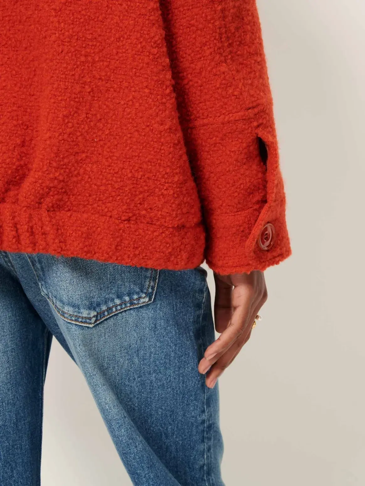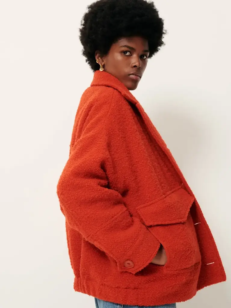 Le manteau de la marque Sessùn possède une coupe courte avec poches plaquées. Son dos est élastique et le tout est fabriqué d'un tissu épais tissé en natté avec des fils bouclés teints. Sa couleure vive ajoute de la fraîcheur à votre look et votre garde-robe.