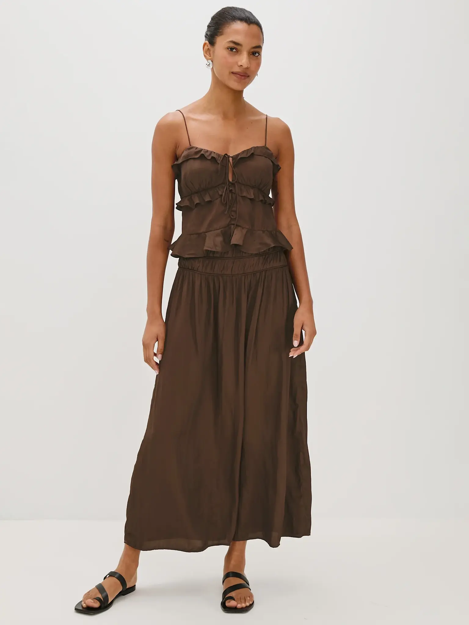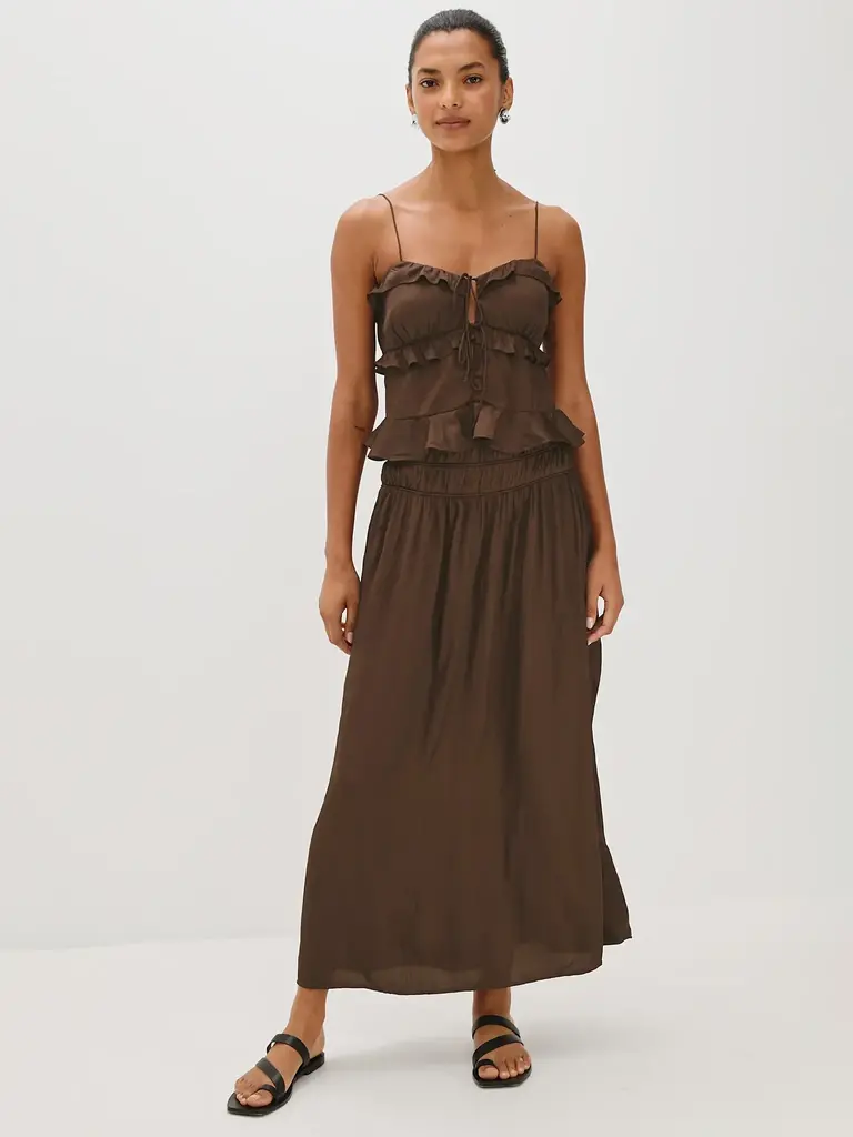 La jupe midi Nara est confectionnée dans un élégant satin froissé. Sa taille ajustée laisse place à une coupe fluide sur toute la longueur, complétée par une fermeture éclair discrète sur le côté pour un enfilage facile. Sa légèreté la rend agréable au touché et à porter et elle se combine facilement dans un outfit.