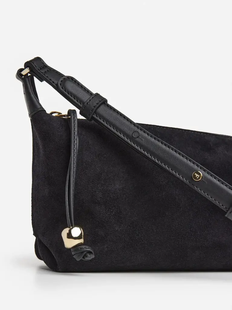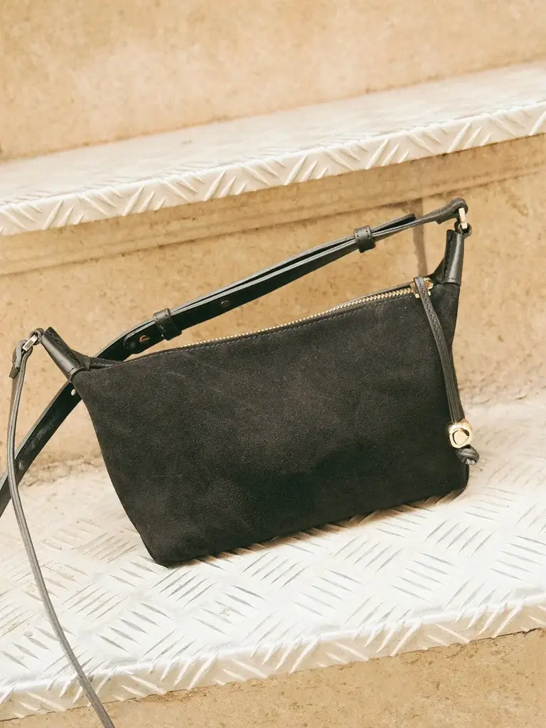 Le sac à bandoulière en daim noir de la marque Flattered est un vrai passe-partout grâce à sa facilité à s'assembler dans un outfit. Son matériau satisfaisant et sa quincaillerie doré complémentent son efficacité à s'ajusté à votre look. La bandoulière est ajustable.