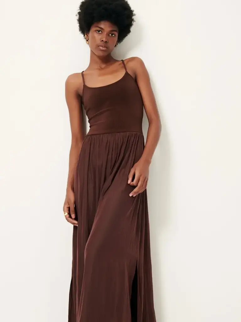 Robe longue à fines bretelles esprit danseuse, dos ouvert lacé en jersey fin côtelé et jupe fendue en satin fluide légèrement créponné.