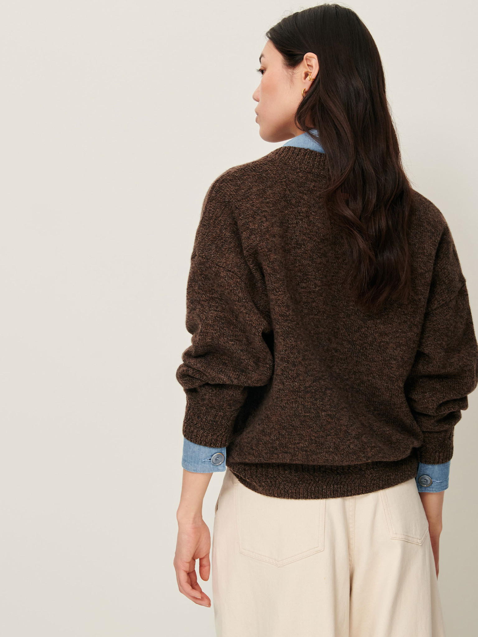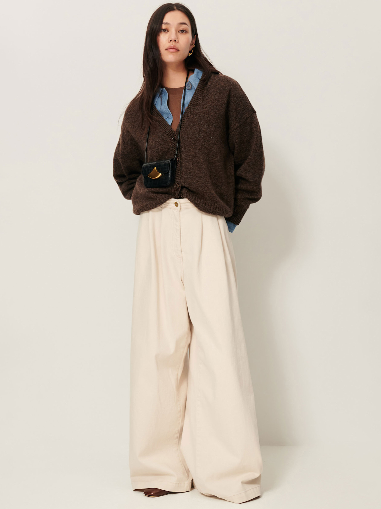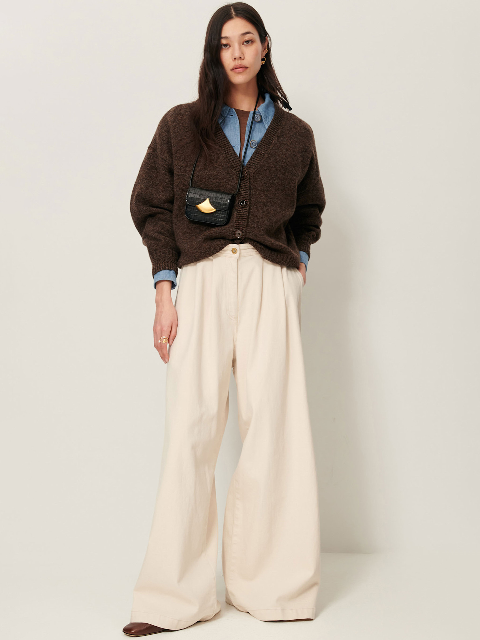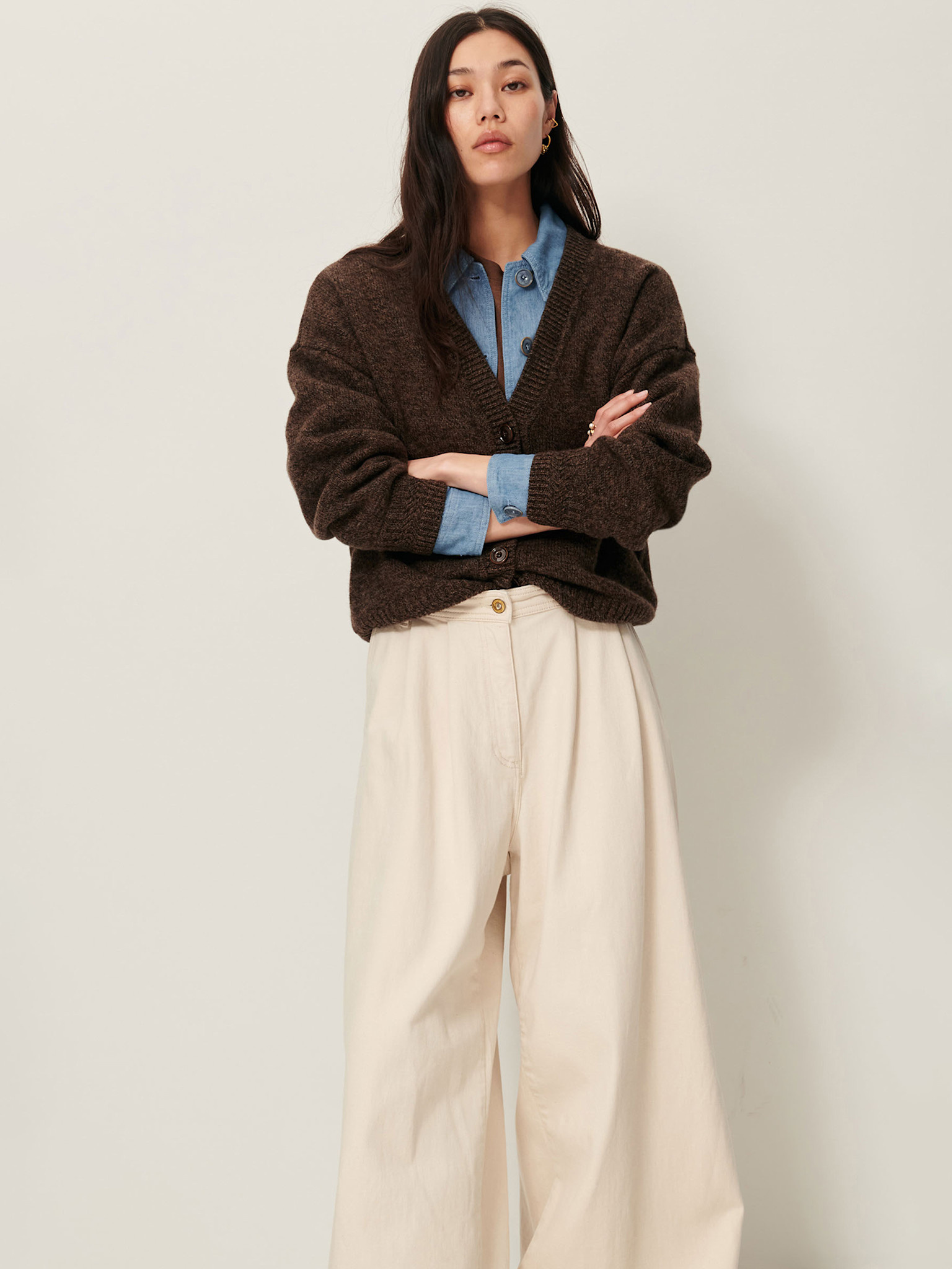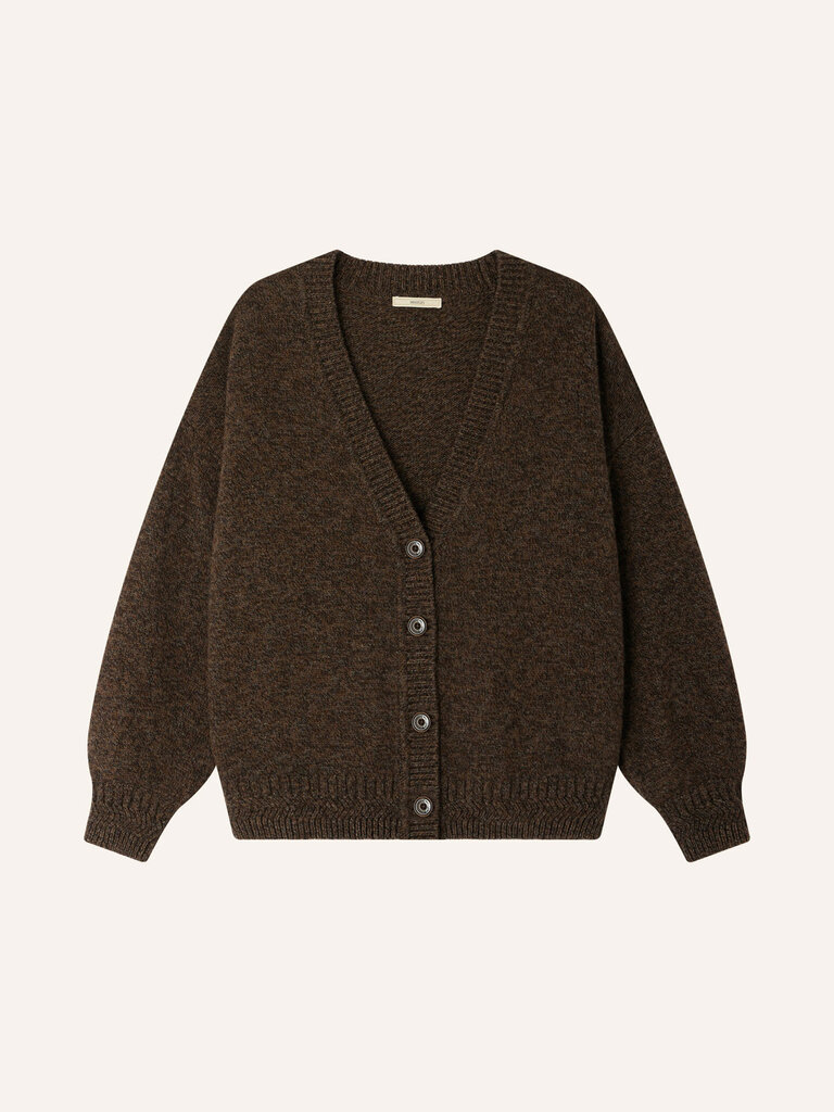 Le cardigan de la mrque Sessùn est un modèle à coupe ample, ayant un col en V déployé et le tout est tissé en maille de laine mérinos moulinée. Celui-ci se jumelle bien avec une chemise ou un simple chandail porté en dessous
