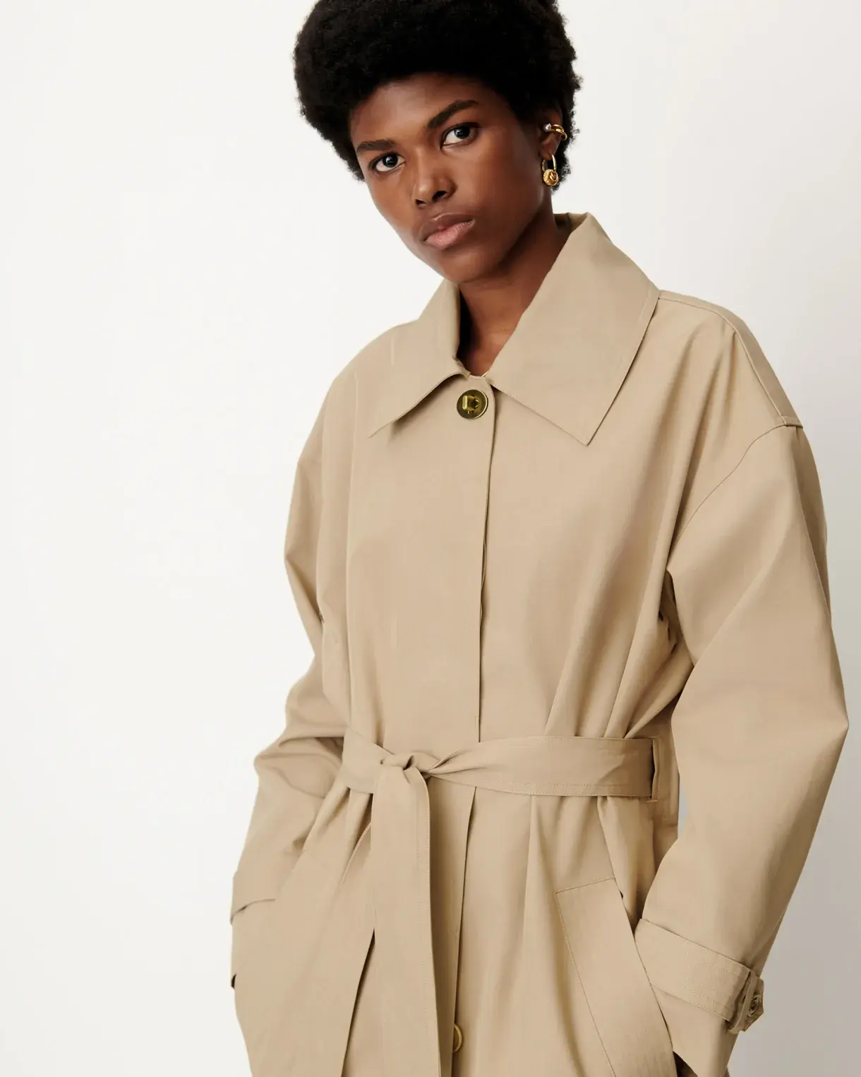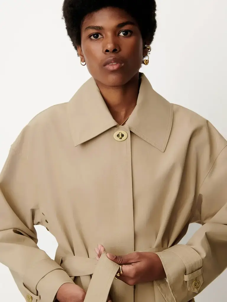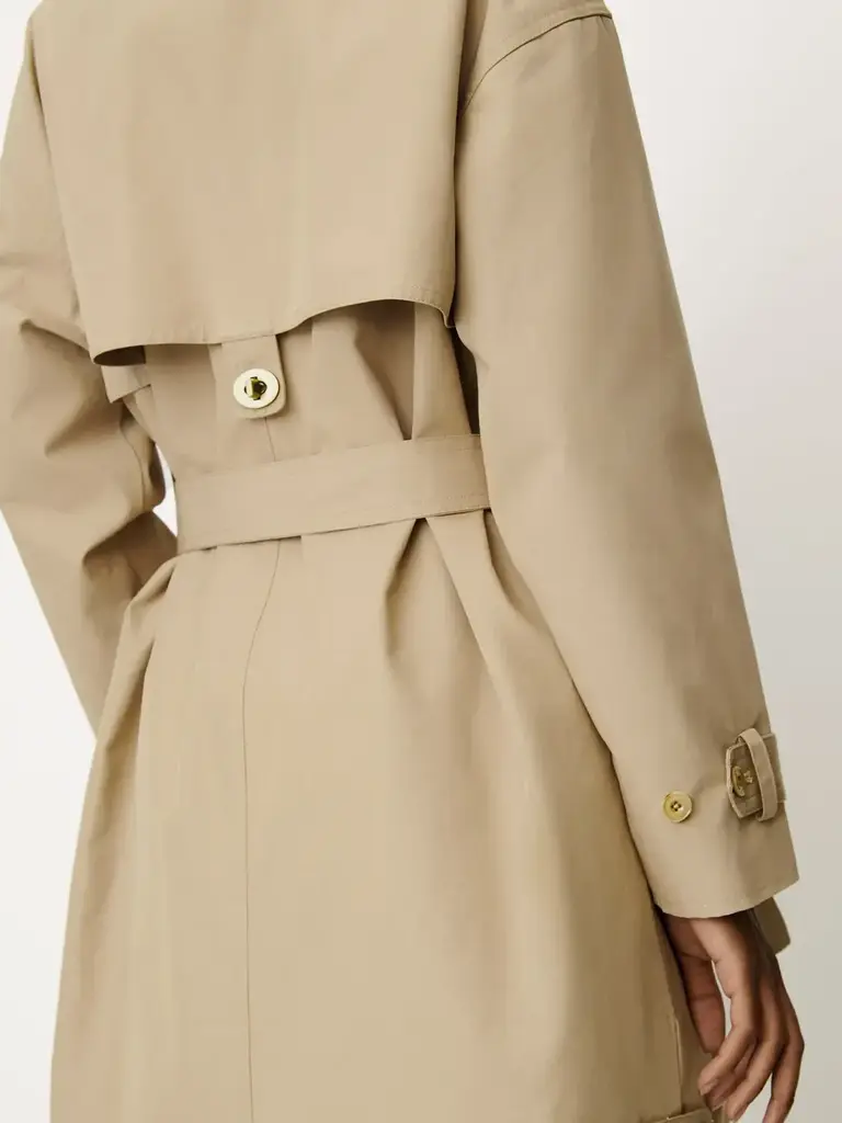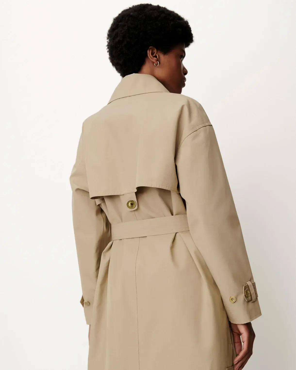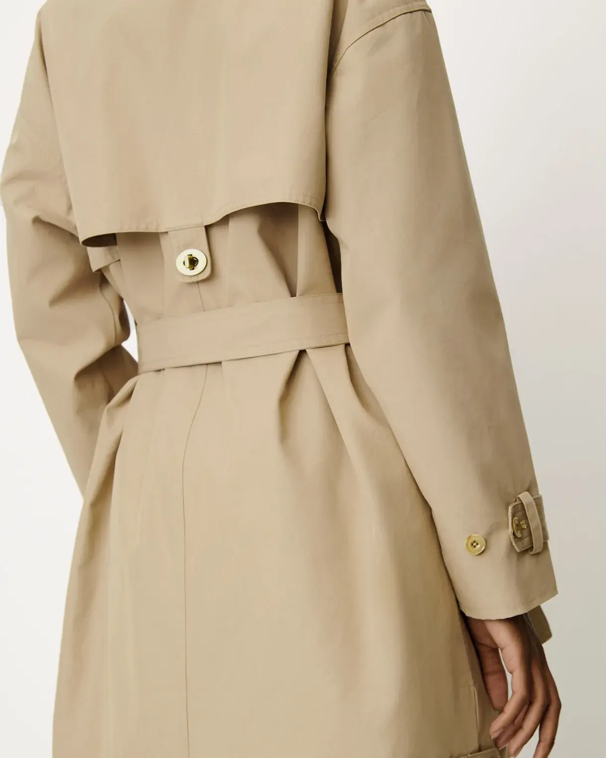 Trench-coat à bavolet au dos, détails de pattes et de fermoirs métalliques en gabardine serrée et légère.
